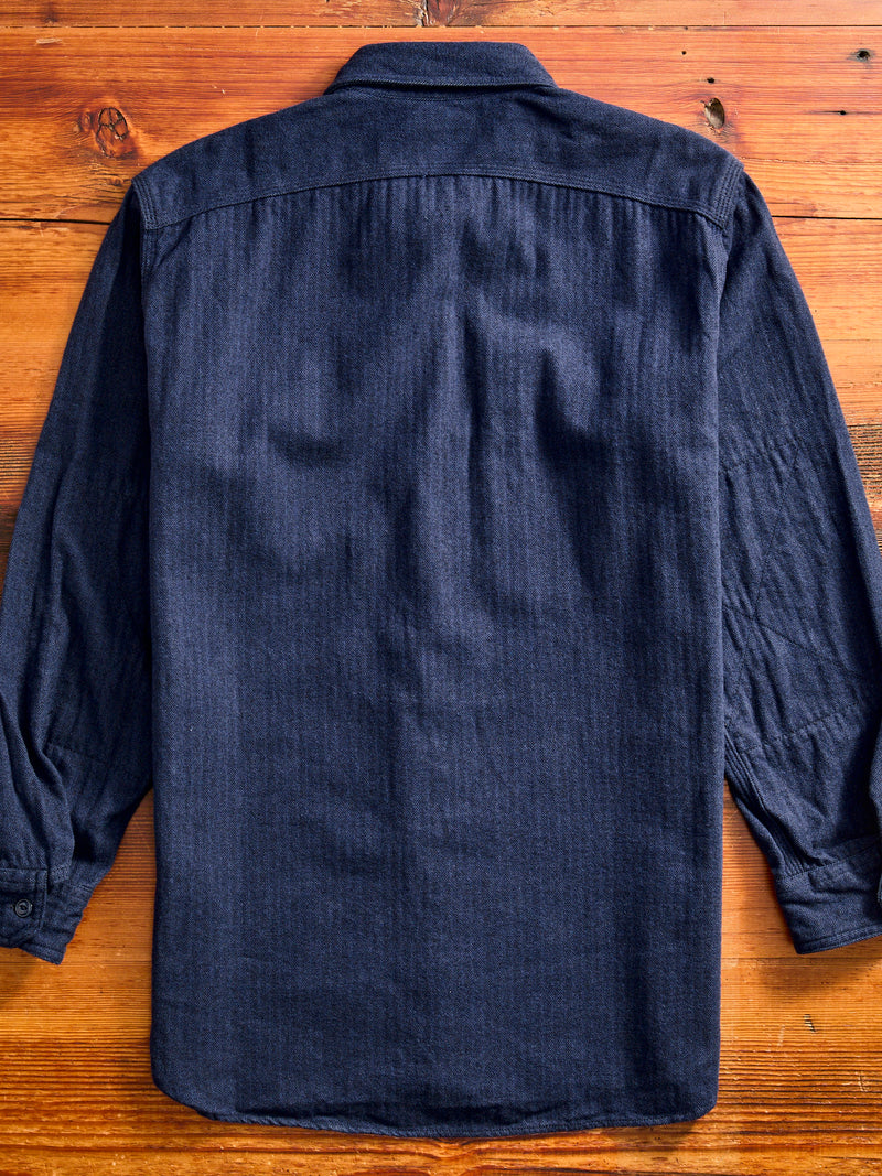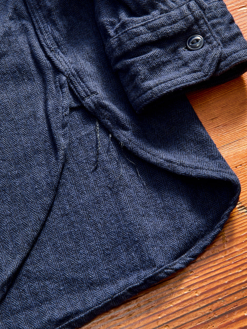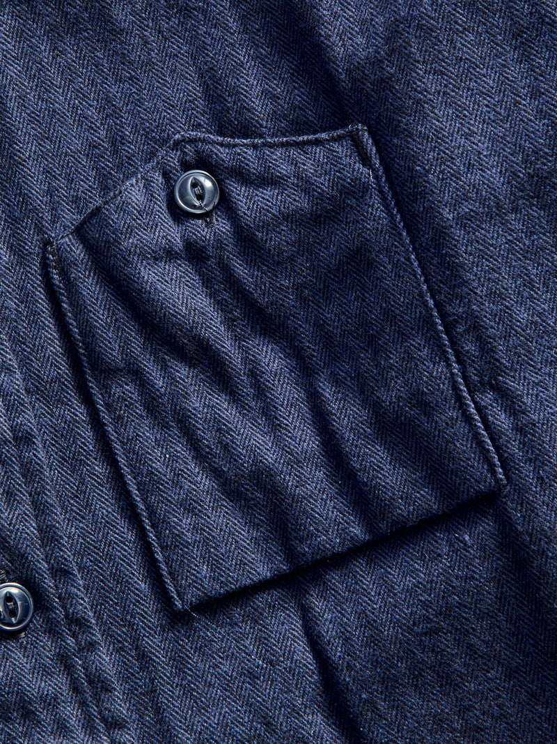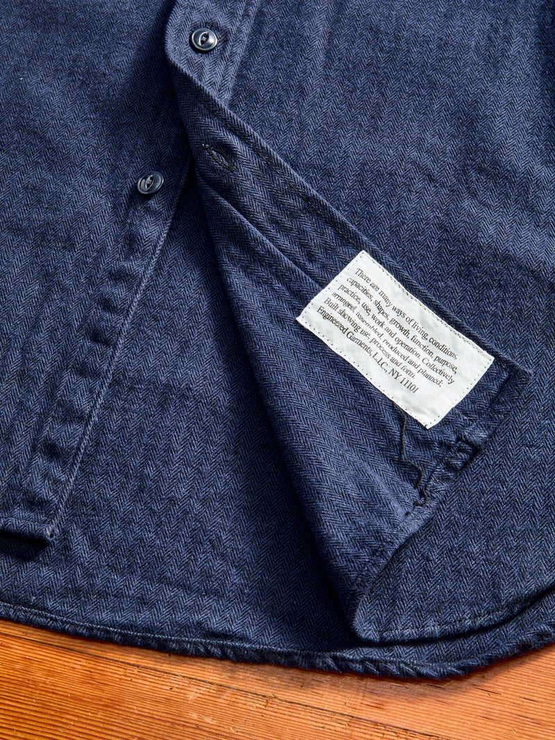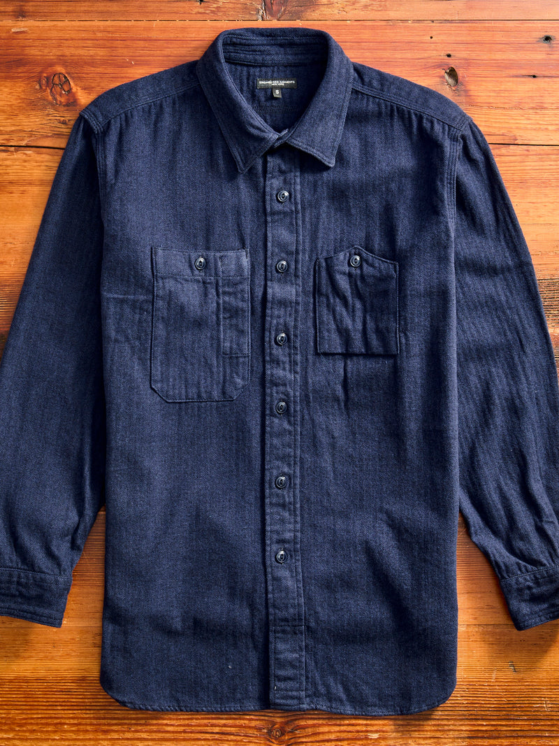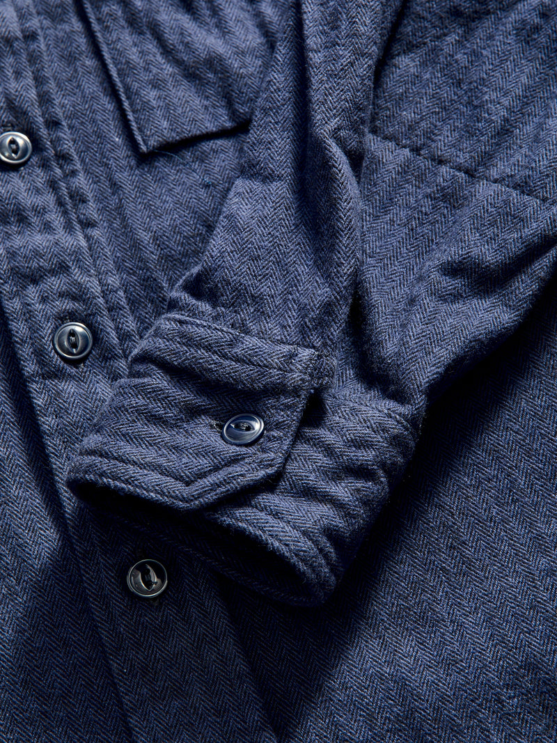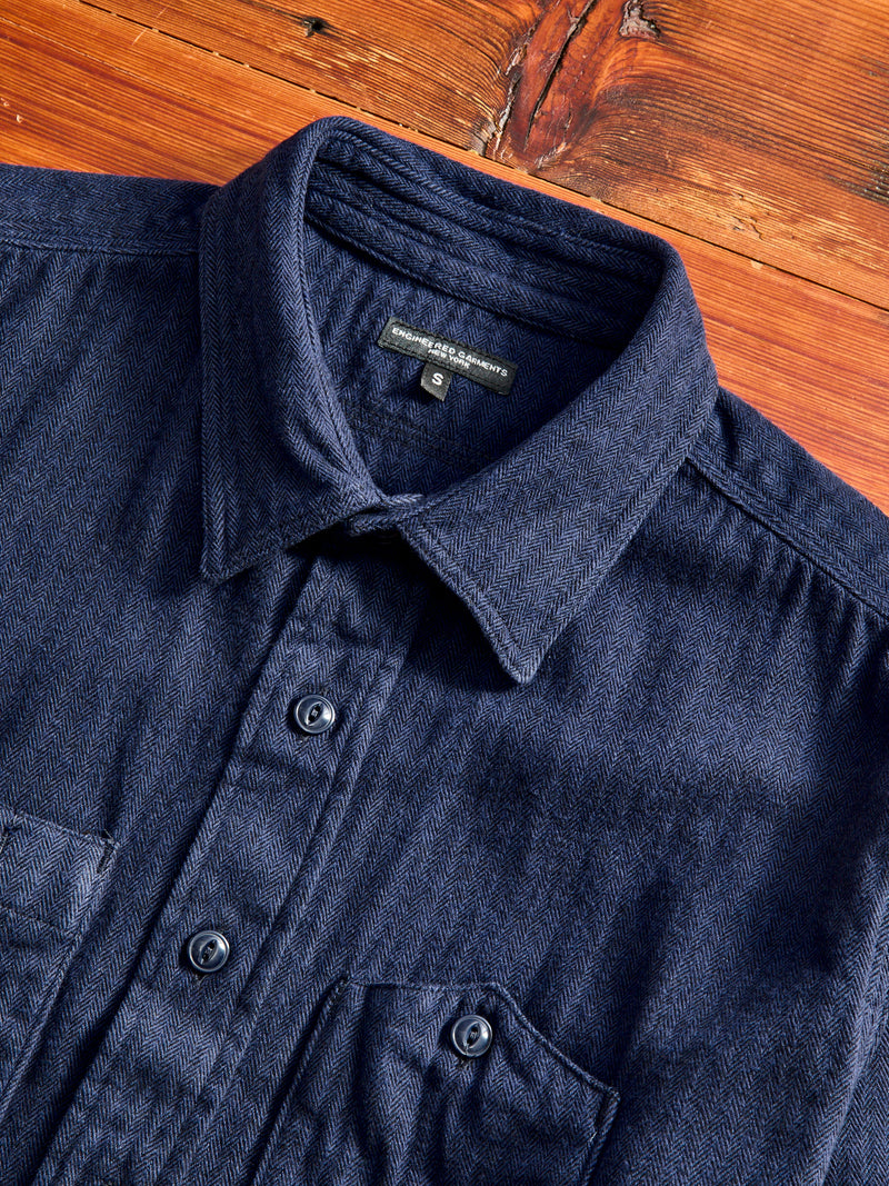 • Engineered Garment's work shirt refines the classic style in a contemporary relaxed button-up design. Crafted from a brushed cotton herringbone fabric, the shirt sports a soft texture with a medium weight heft. Sewn with asymmetric dual chest pockets, barrel cuffs, and a button-down placket.
