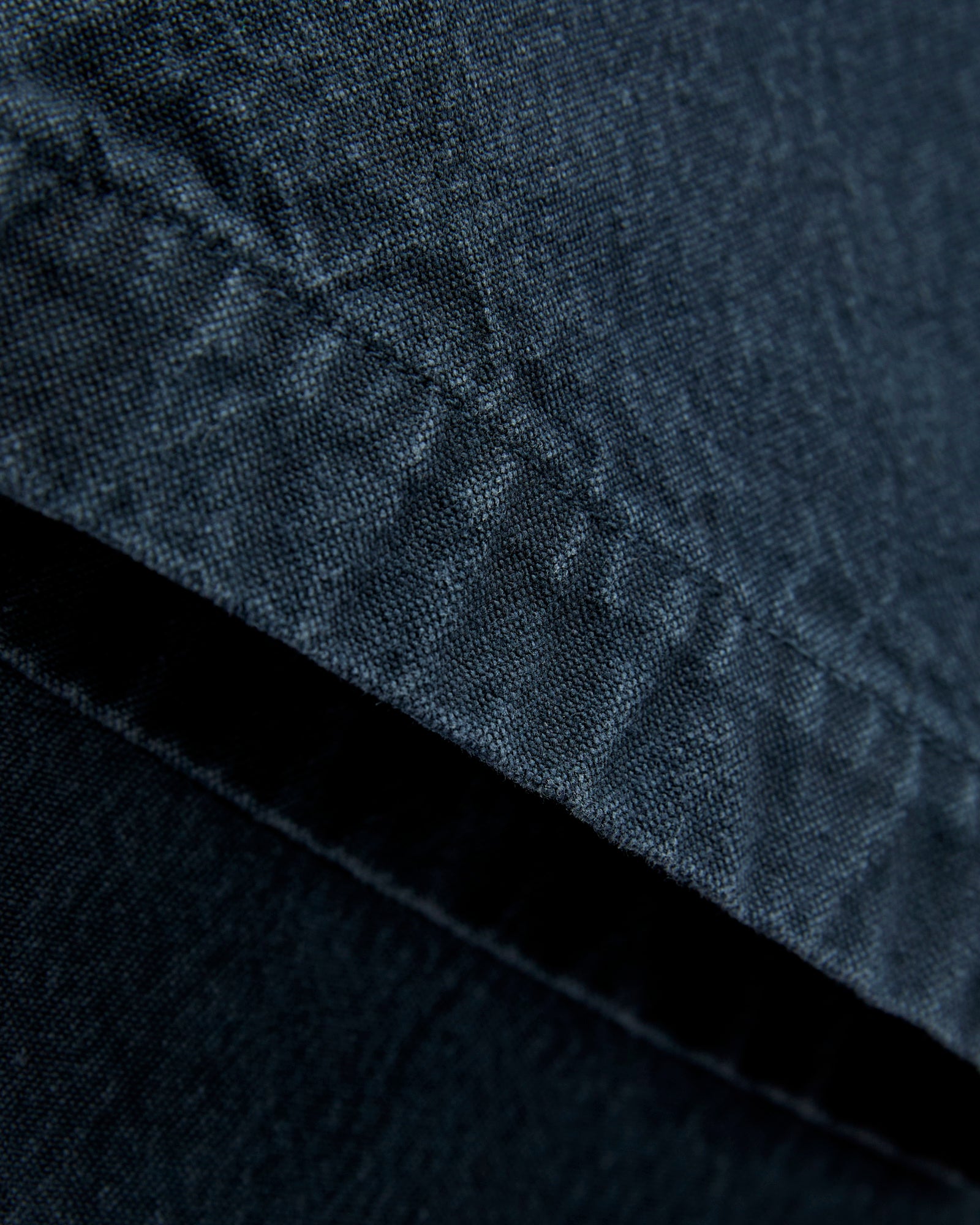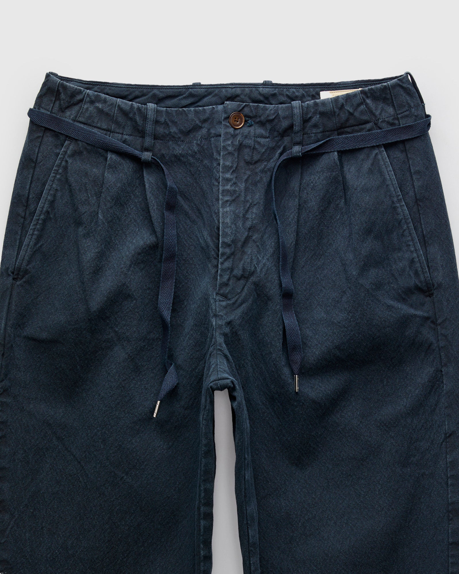 • Crafted from the world’s finest canvas, Seuvas weaves their version of the pleated slant-pocket trouser. Made from Kurashiki Hampu, a renowned fabric celebrated for its varied texture and hardwearing durability. Originally used in boat sails, Kurashiki Canvas is woven on vintage shuttle looms highlighting the cotton's natural fibers. The pants are dyed using natural logwood extract for a deep color that will continue to change with wear. Made in a relaxed tapered cut with slant waist pockets, rear welt pockets, and an adjustable waistband.
