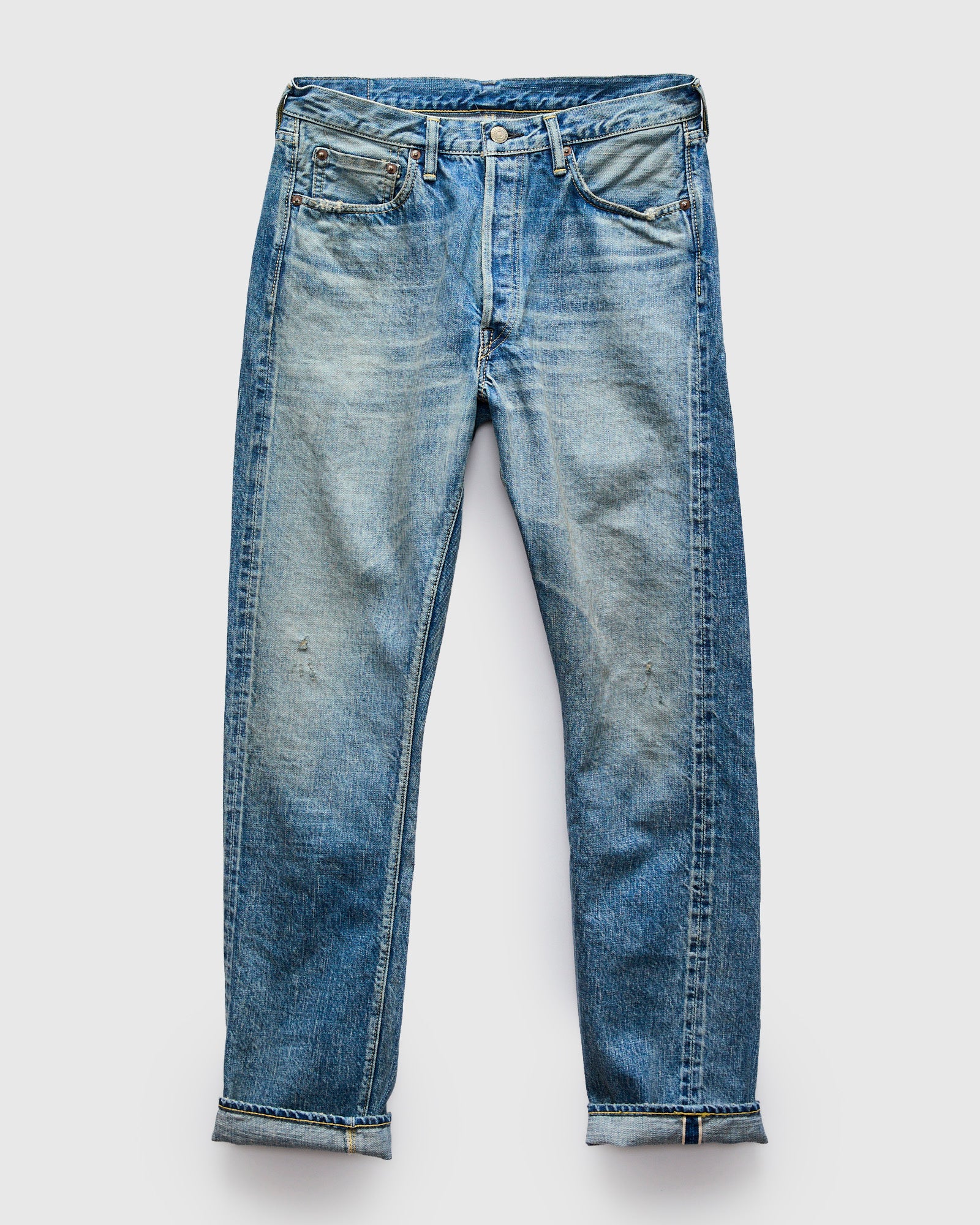 • Fullcount's Dartford wash pays homage to Rolling Stones legend Mick Jagger. The jeans feature hand-distressing modeled after denim worn by Jagger during the band's heyday. Made from Fullcount's original 13.75oz Japanese selvedge denim, the fabric is woven on vintage shuttle looms using extra-long staple Zimbabwe cotton yarns. The Dartford denim is washed to an extra-light indigo with blond hues, replicating natural sun fading and oxidation.