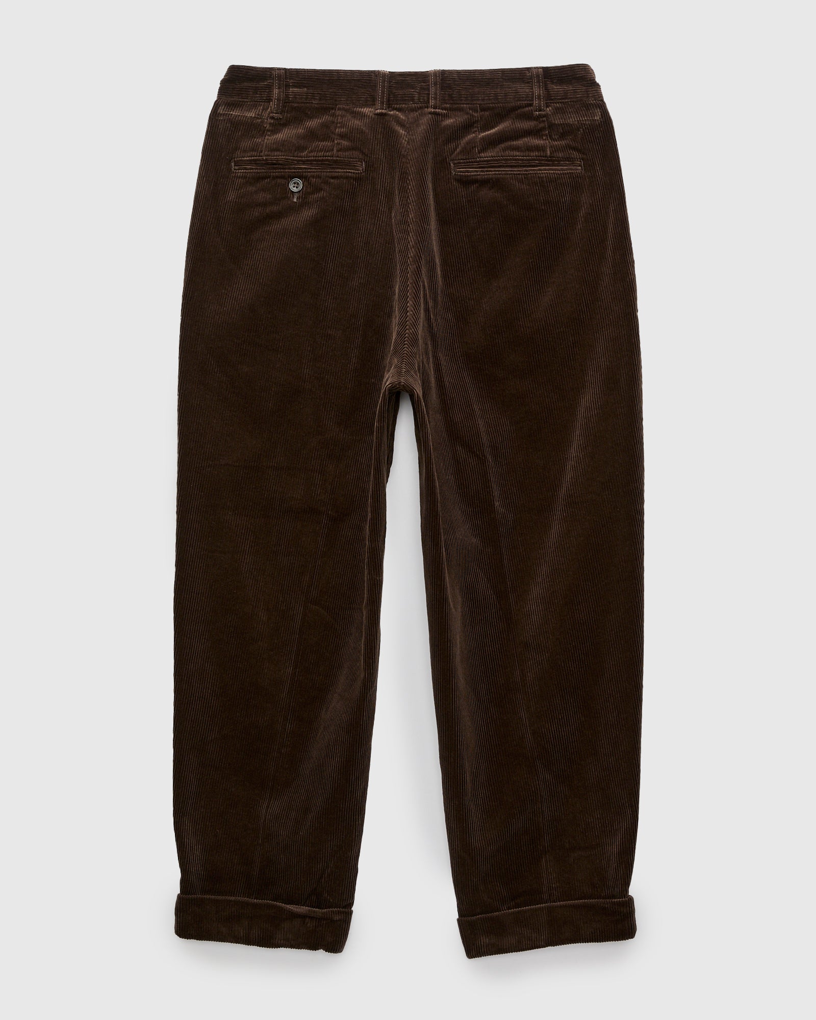 • The 2-Pleat Trousers from Beams are pleated slant-pocket trousers, cut in a relaxed tapered cut inspired by 1950s suiting. This iteration features a heavyweight Japanese corduroy fabric woven with a soft velveteen hand. The pants are sewn with slant pockets at the waist, welt pockets at the rear, and are finished with a cuffed hem.