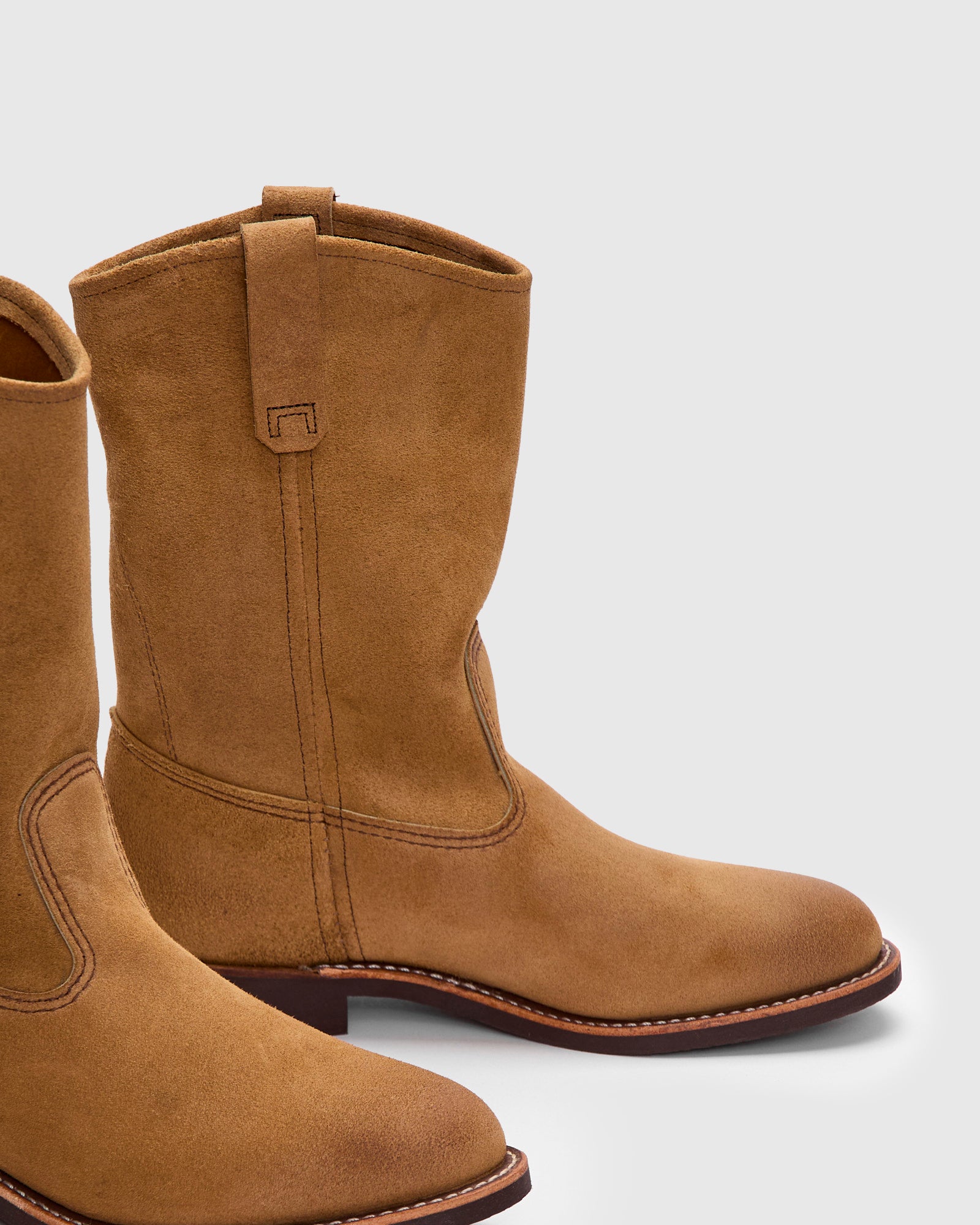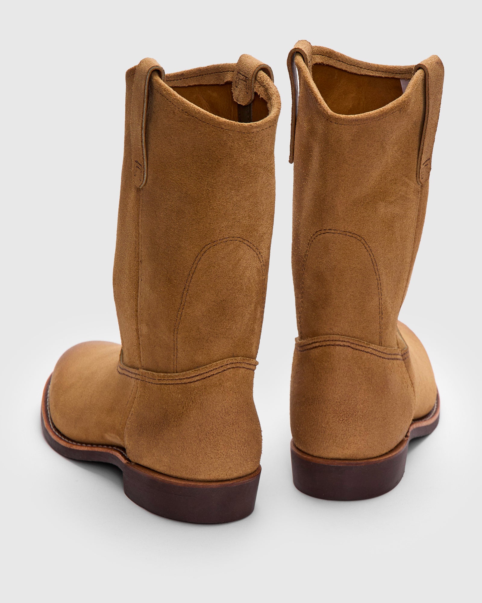 • Originally debuting in 1953, the 8060 Pecos Boot is Red Wing’s pull-on work boot, initially designed for cowboys and later adopted by oil field workers, farmers, and builders. Reintroduced as part of Red Wing's 120-year anniversary collection, revisiting legacy styles from the last century. This version is cut from Red Wing's Hawthorne Muleskinner leather, a weather-resistant roughout from the brand's S.B. Foot Tannery. Built in the USA, the boots feature Goodyear welt and Puritan triple-stitch construction, finished with Red Wing’s Chemigum traction tread outsole.