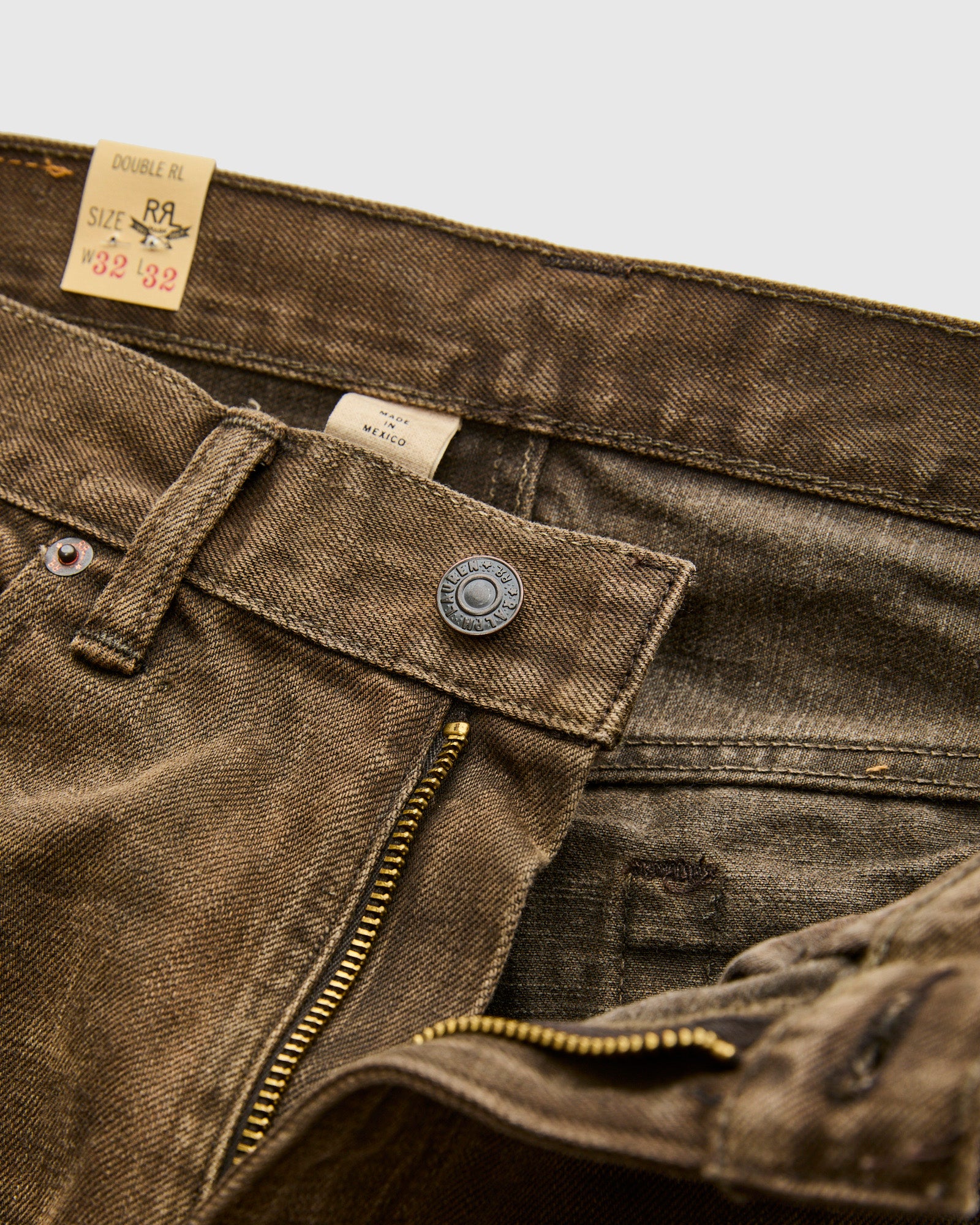 • Cut from 13.5oz right-hand twill Japanese denim in a rustic brown color, these jeans from RRL have undergone a transformative wash process to give the garment a unique worn-in tone. Fitted with all American hardware, debossed logo patch, and RRL's signature back pocket stitching, these jeans capture the spirit of the west with authentic vintage detailing and construction.