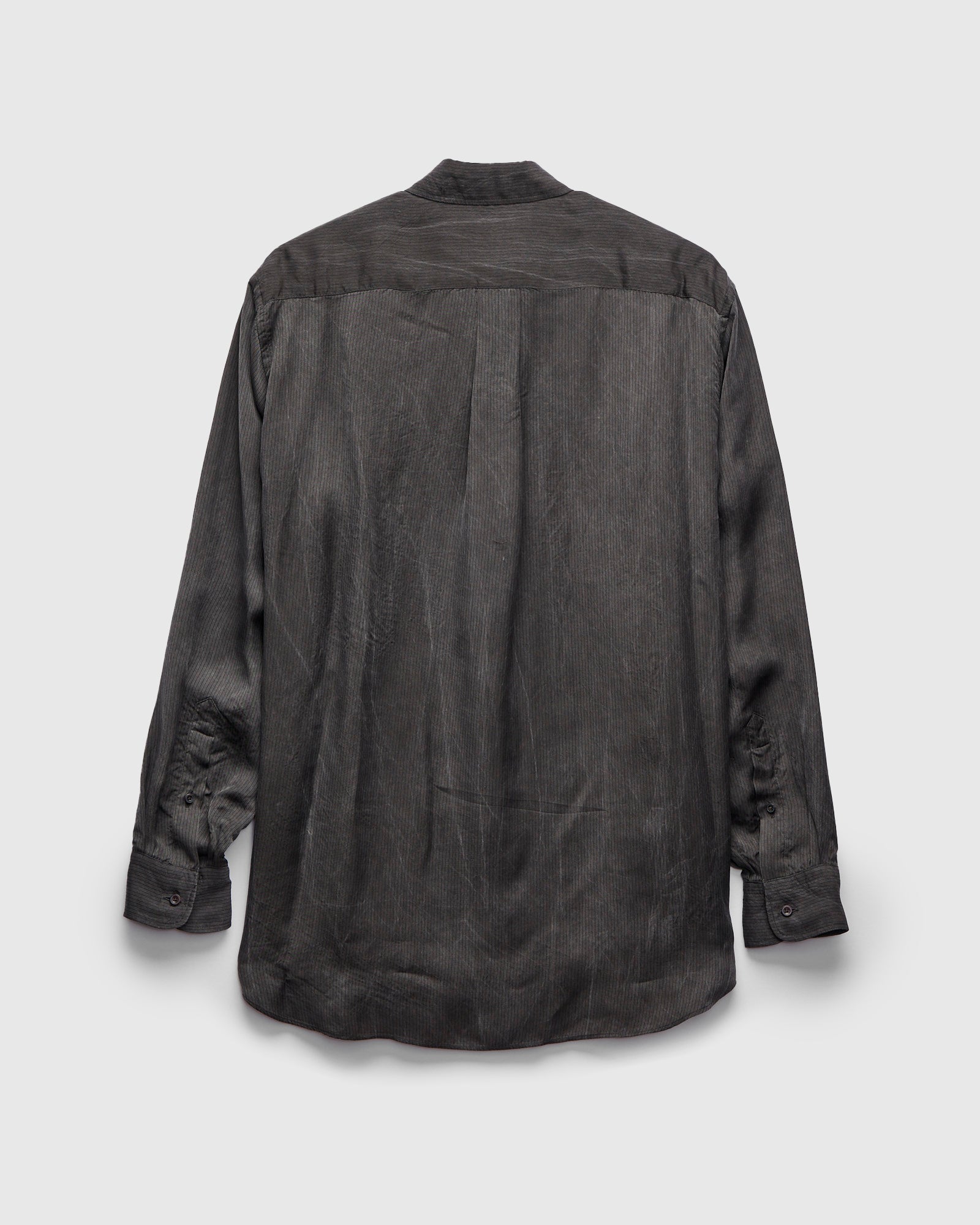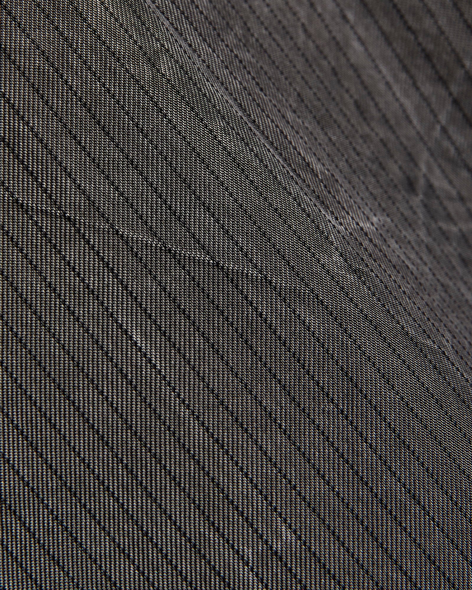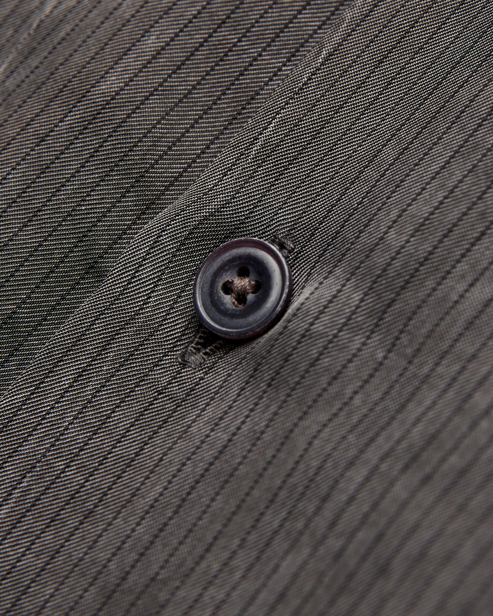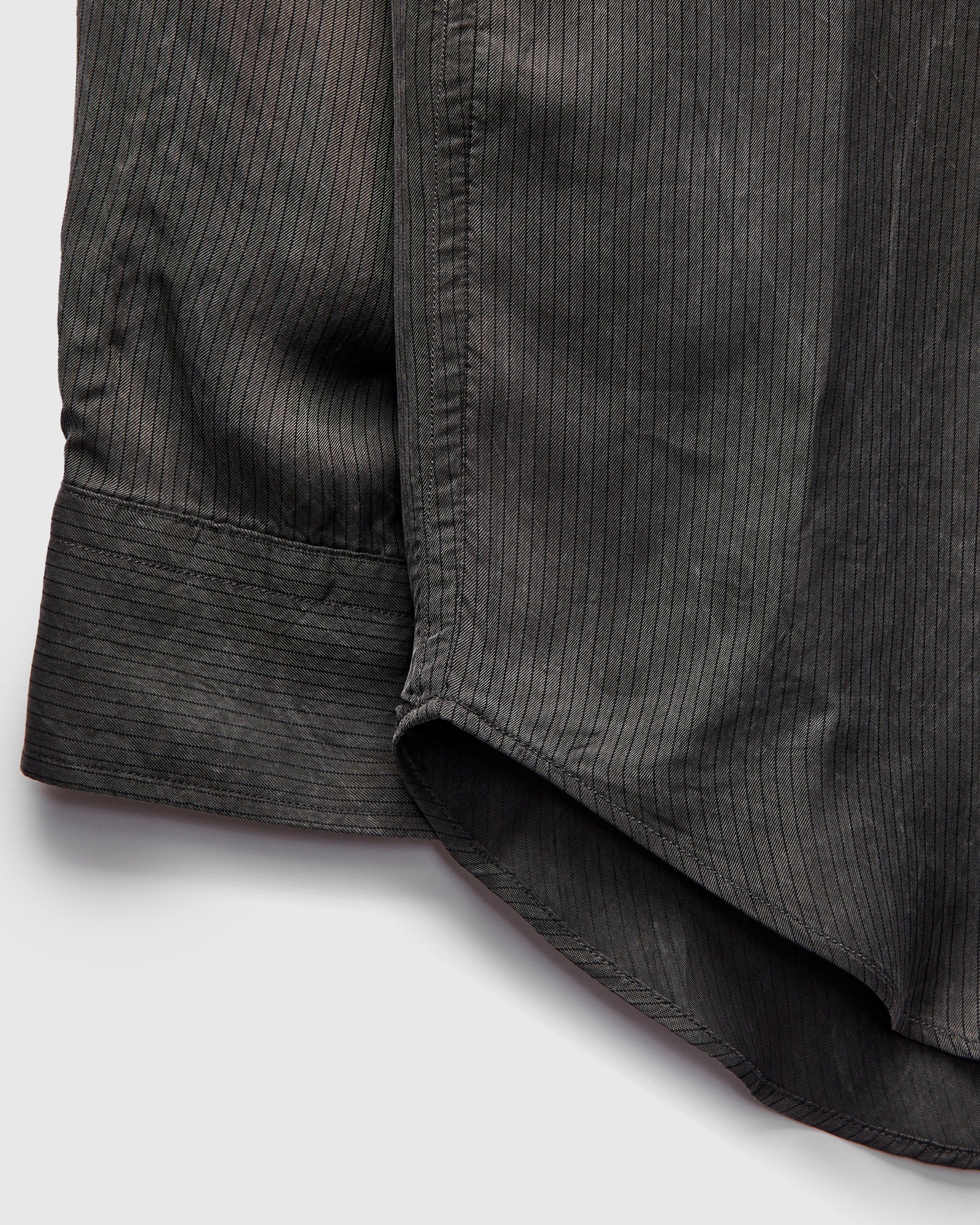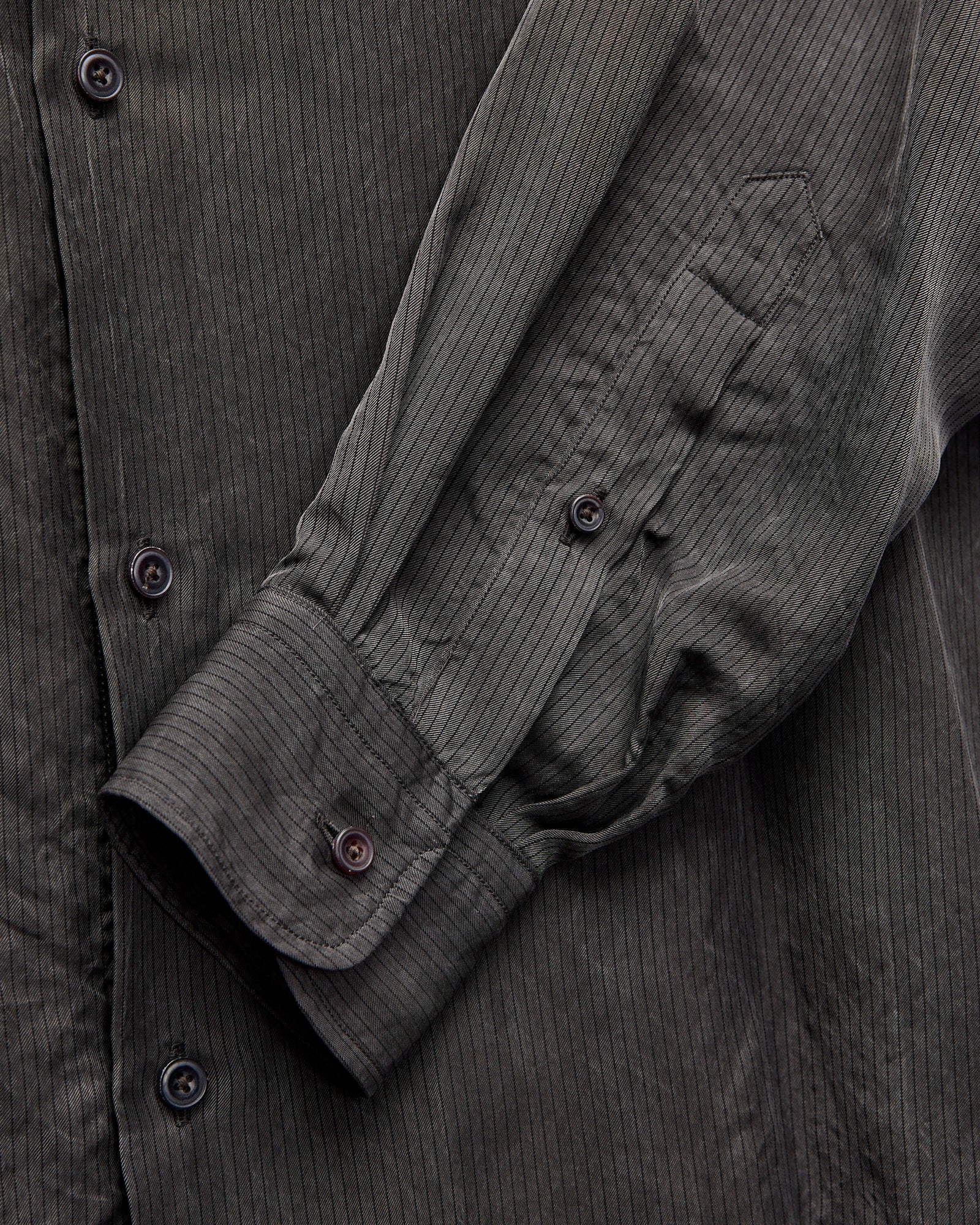 • Made using a pre-dyed striped cupra base, this shirt undergoes an additional charcoal overdye process giving the fabric its unique texture and uneven tone. Cut in Kaptain Sunshine’s Plain Button-Up silhouette, the shirt features a relaxed fit with a pointed collar, scalloped hem, and mother of pearl buttons. The striped cupra fabric is densely woven, lightweight, and smooth to the touch, offering an easy drape and fine hand feel.