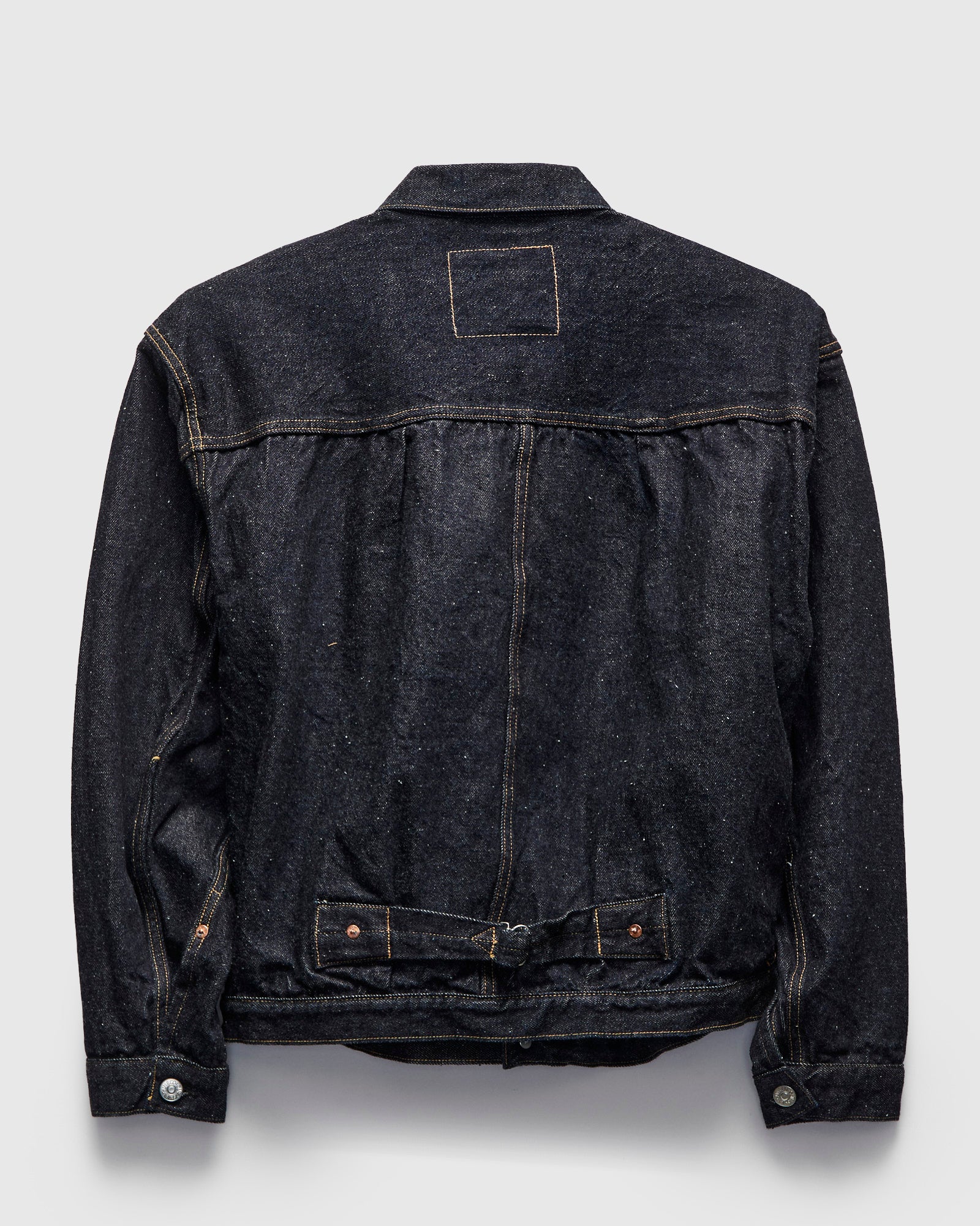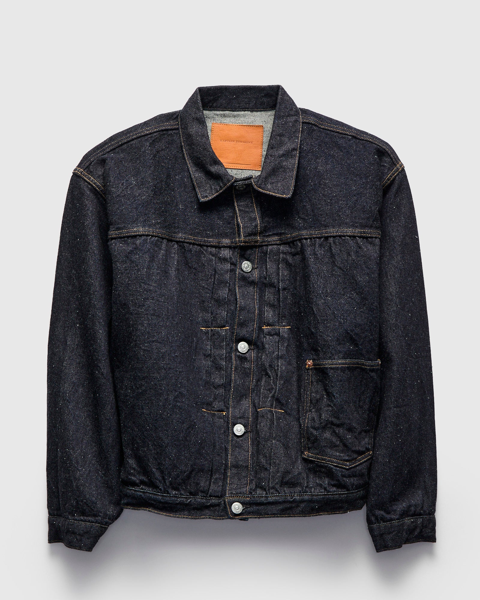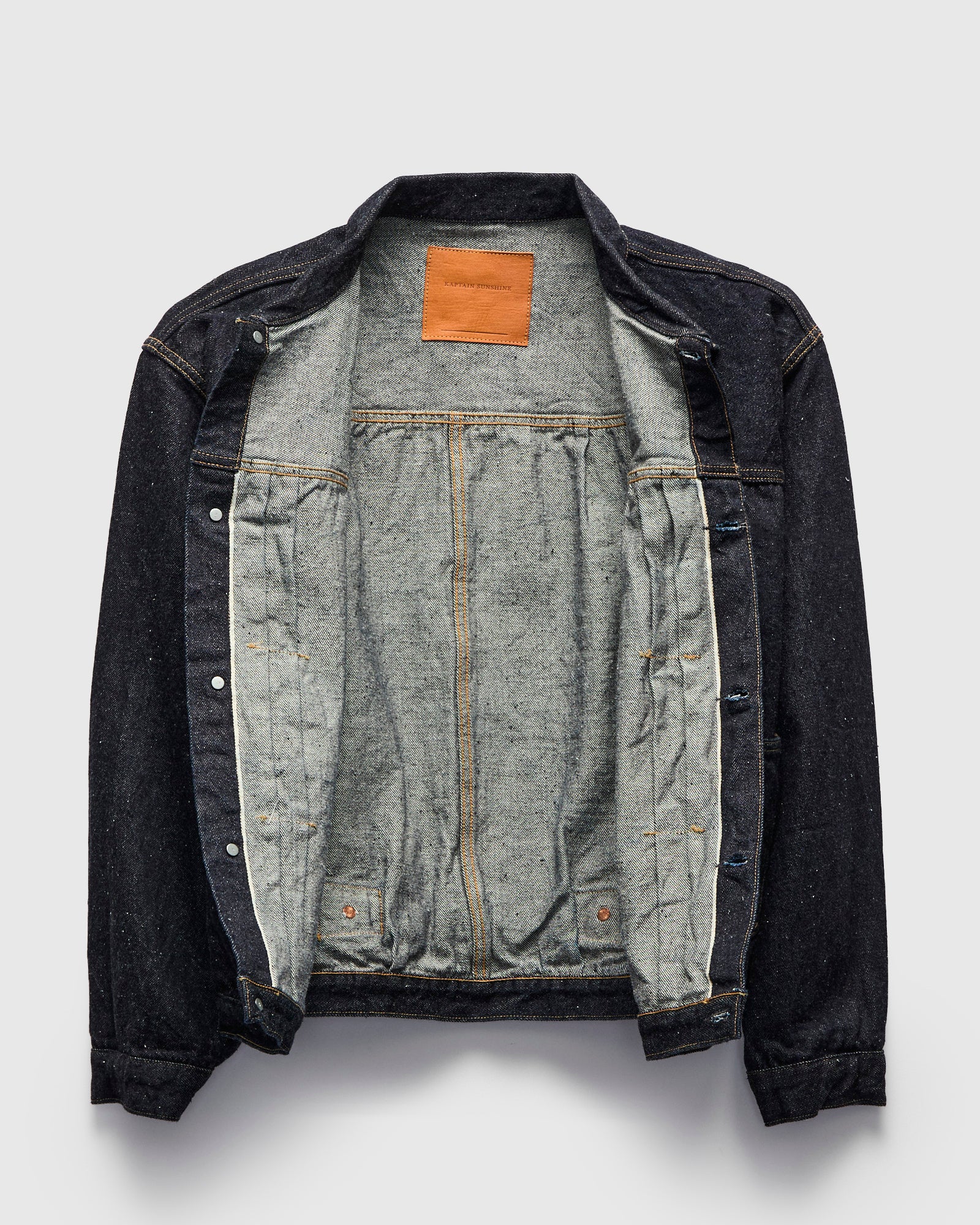 • Kaptain Sunshine uses American grown San Joaquin Cotton for their 13.5oz selvedge denim. Dyed with pure indigo, the denim features natural nep yarns for a distinct raised surface texture reminiscent of 1940s deadstock fabrics. The 1P Jacket references vintage Type-1 patterns, cut in a contemporary relaxed fit. Complete with custom hardware and deerskin leather patch.