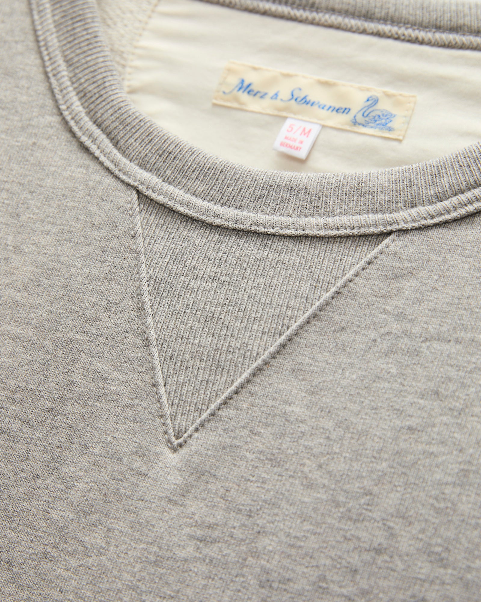 • Crafted on century old German loopwheel machines, Merz b. Schwanen's 3S48 Sweatshirts feature the brand's heavyweight triple-thread cotton terry fabric. The heavyweight sweatshirt fabric is woven using organic cotton yarns sourced from Greece at a hefty 12.4oz weight, giving the fabric a comfortable and substantial touch. Detailed with a vintage style v-insert at the collar, ribbed hem, under arm gussets, and added nape liner. This item will shrink half a size with the first wash.