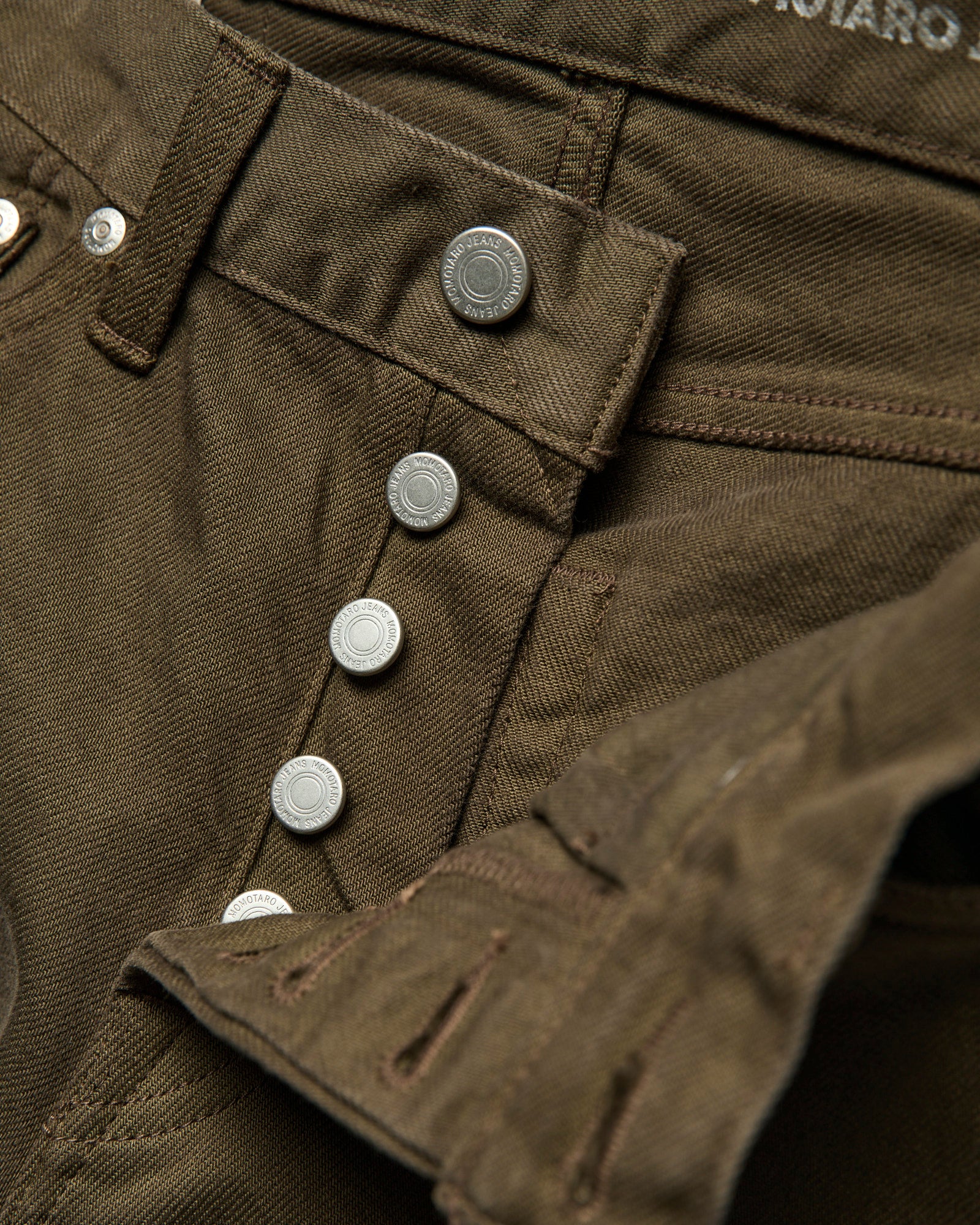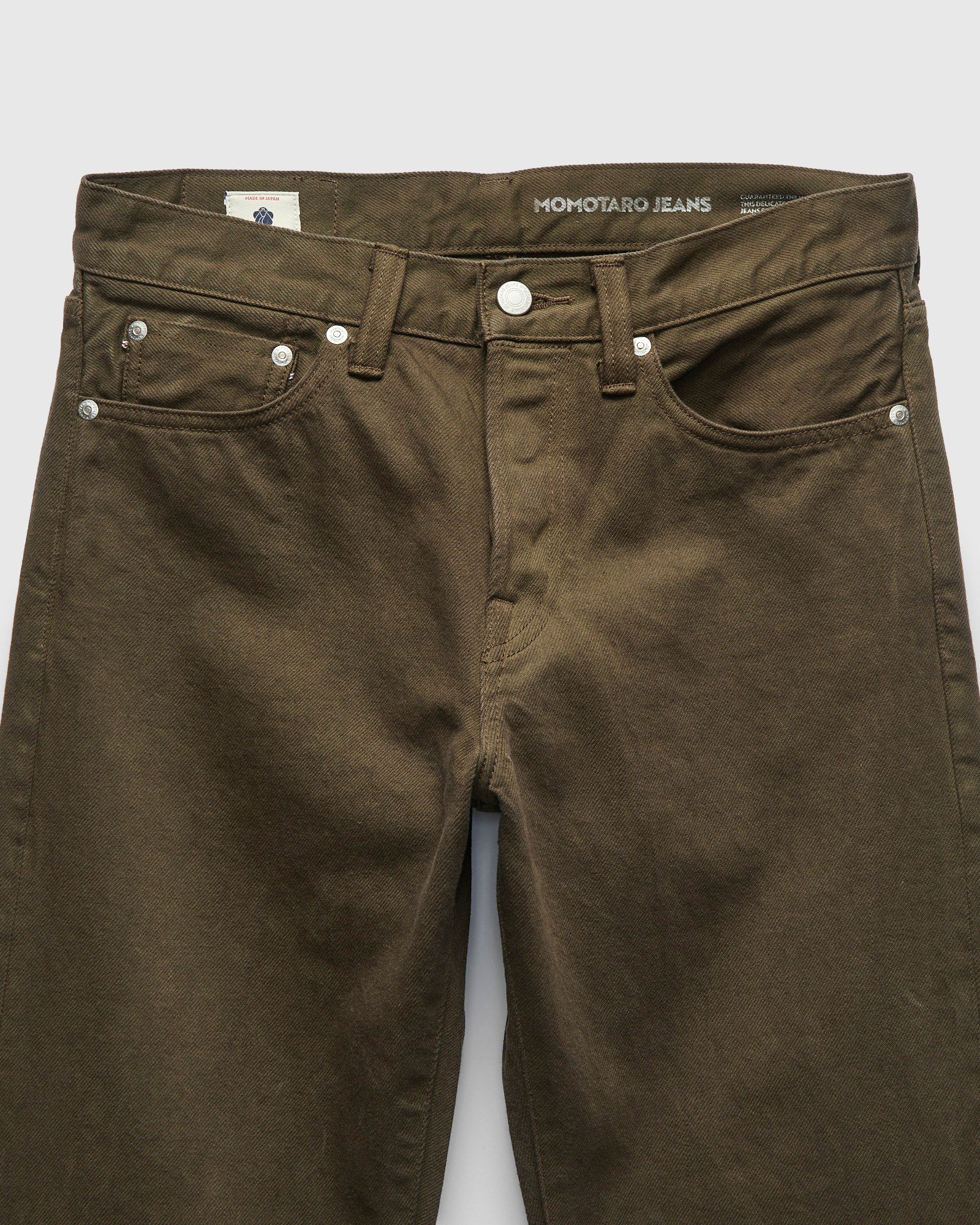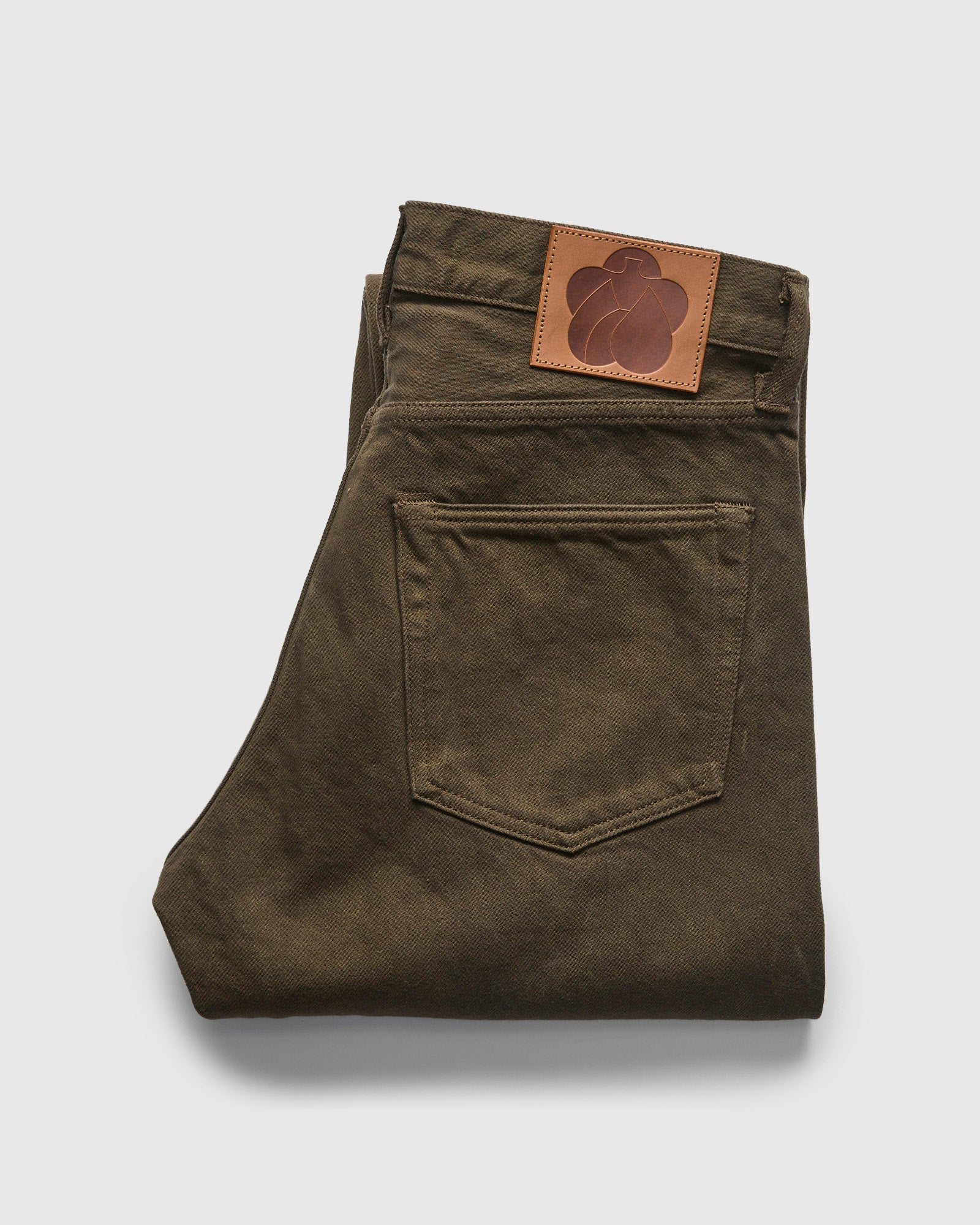 • Momotaro's Botanical Dye series features natural dye extracts applied to a newly developed 12.5oz selvedge denim. Inspired by foliage found on temple grounds and garden paths, the moss dye reflects Japan’s natural landscape through a rustic green-brown garment-dye finish. Woven using Zimbabwe cotton yarns the denim features a structured medium-weight weave and classic red selvedge ID. The jeans are finished with details paying homage to the Japanese folktale Momotaro receives its name from.