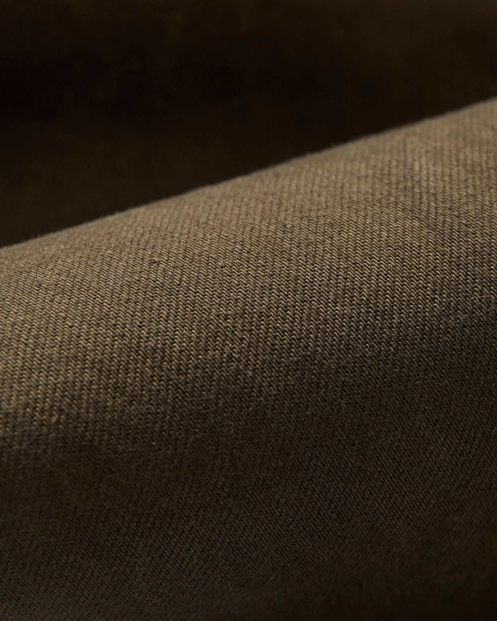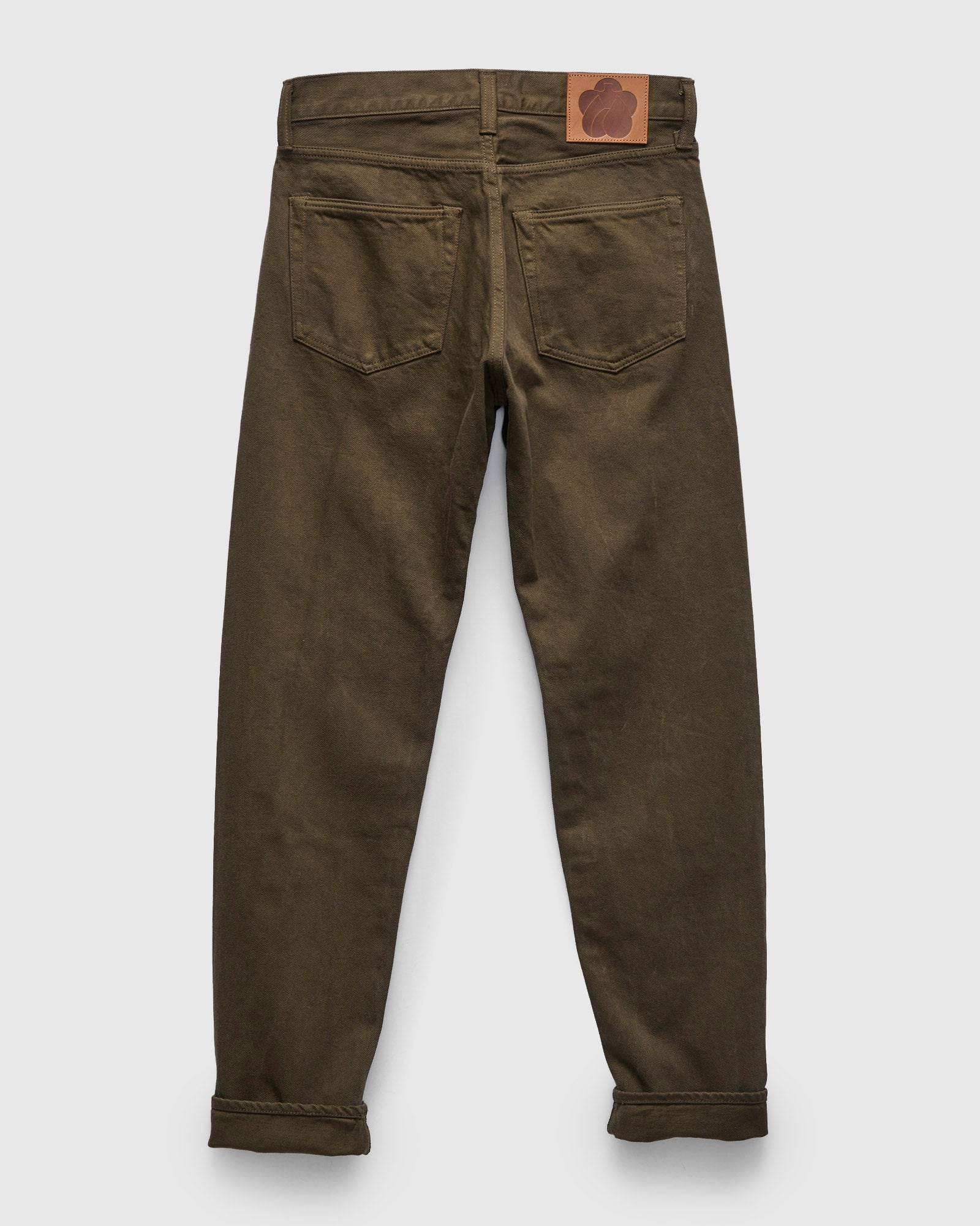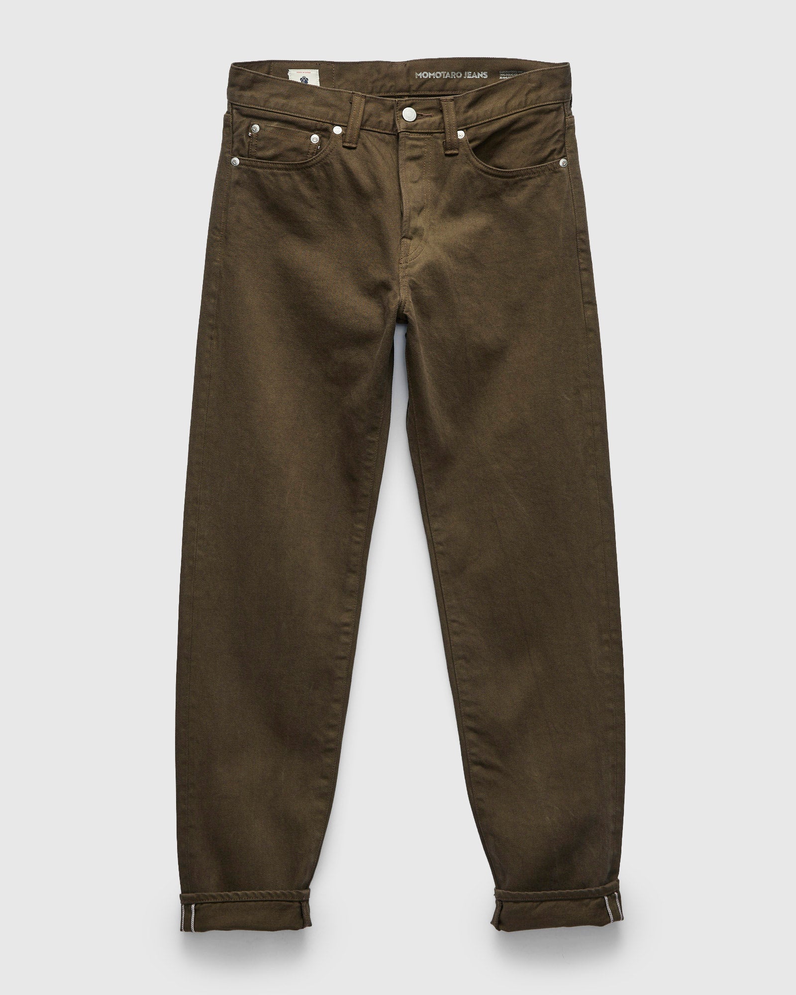 • Momotaro's Botanical Dye series features natural dye extracts applied to a newly developed 12.5oz selvedge denim. Inspired by foliage found on temple grounds and garden paths, the moss dye reflects Japan’s natural landscape through a rustic green-brown garment-dye finish. Woven using Zimbabwe cotton yarns the denim features a structured medium-weight weave and classic red selvedge ID. The jeans are finished with details paying homage to the Japanese folktale Momotaro receives its name from.