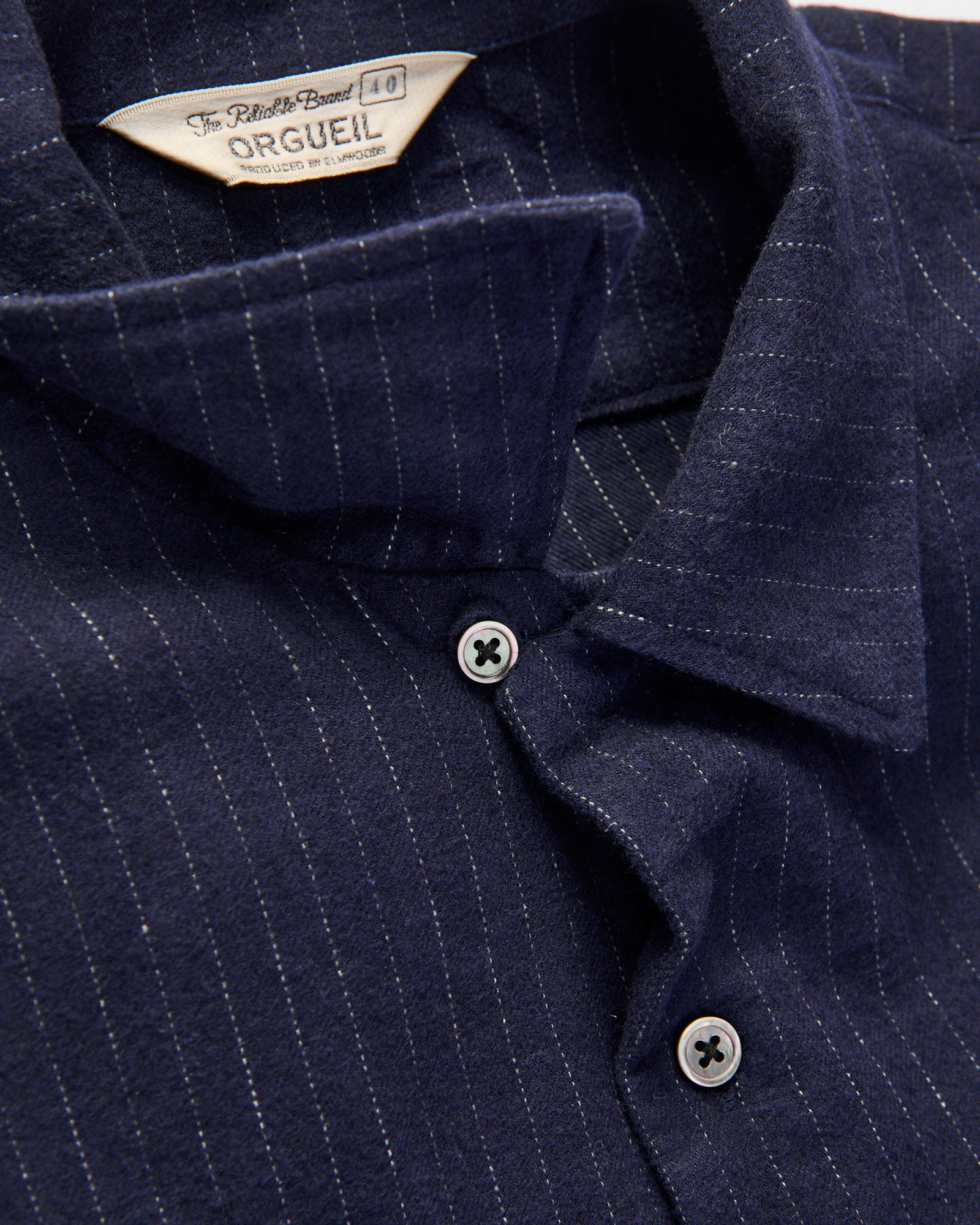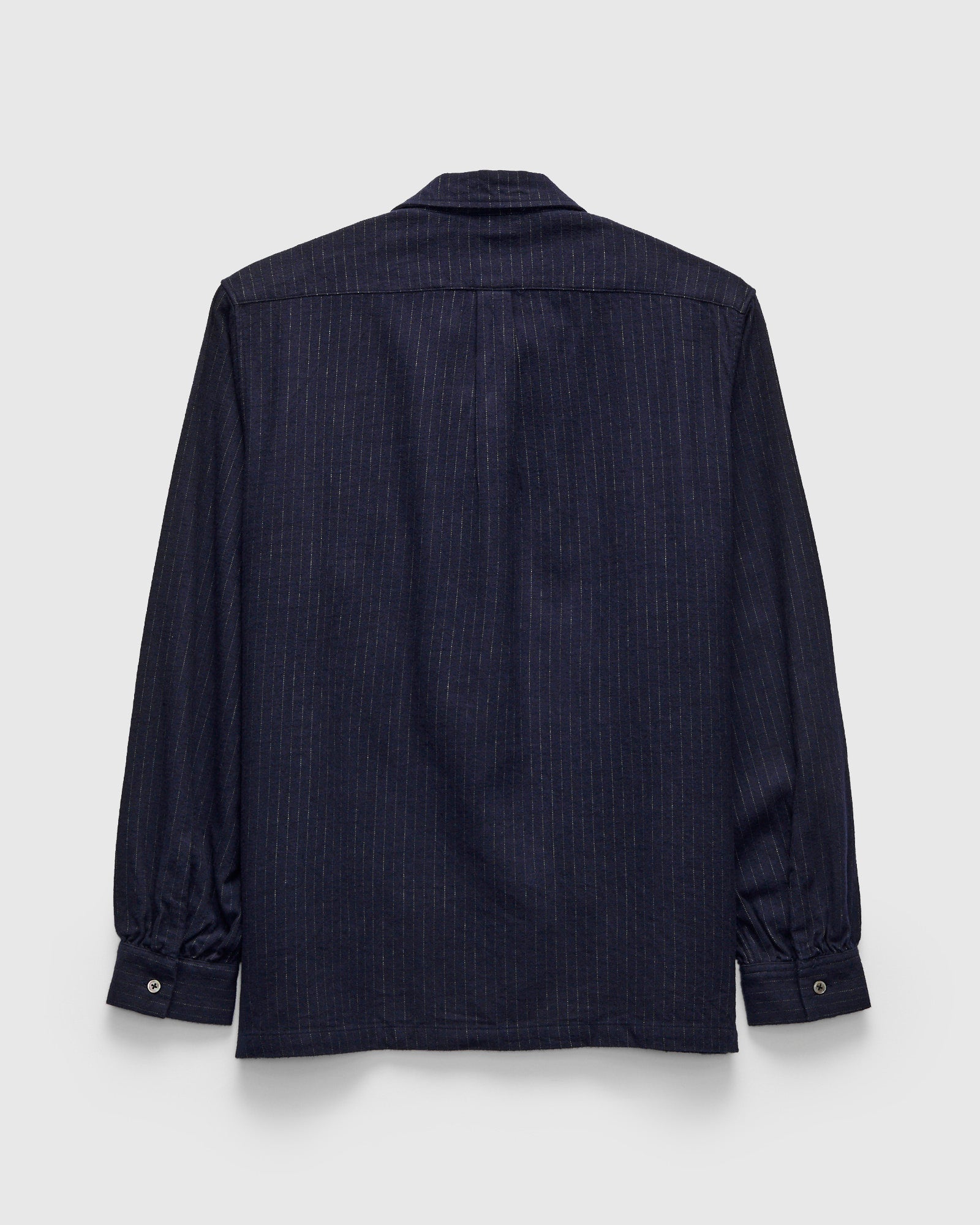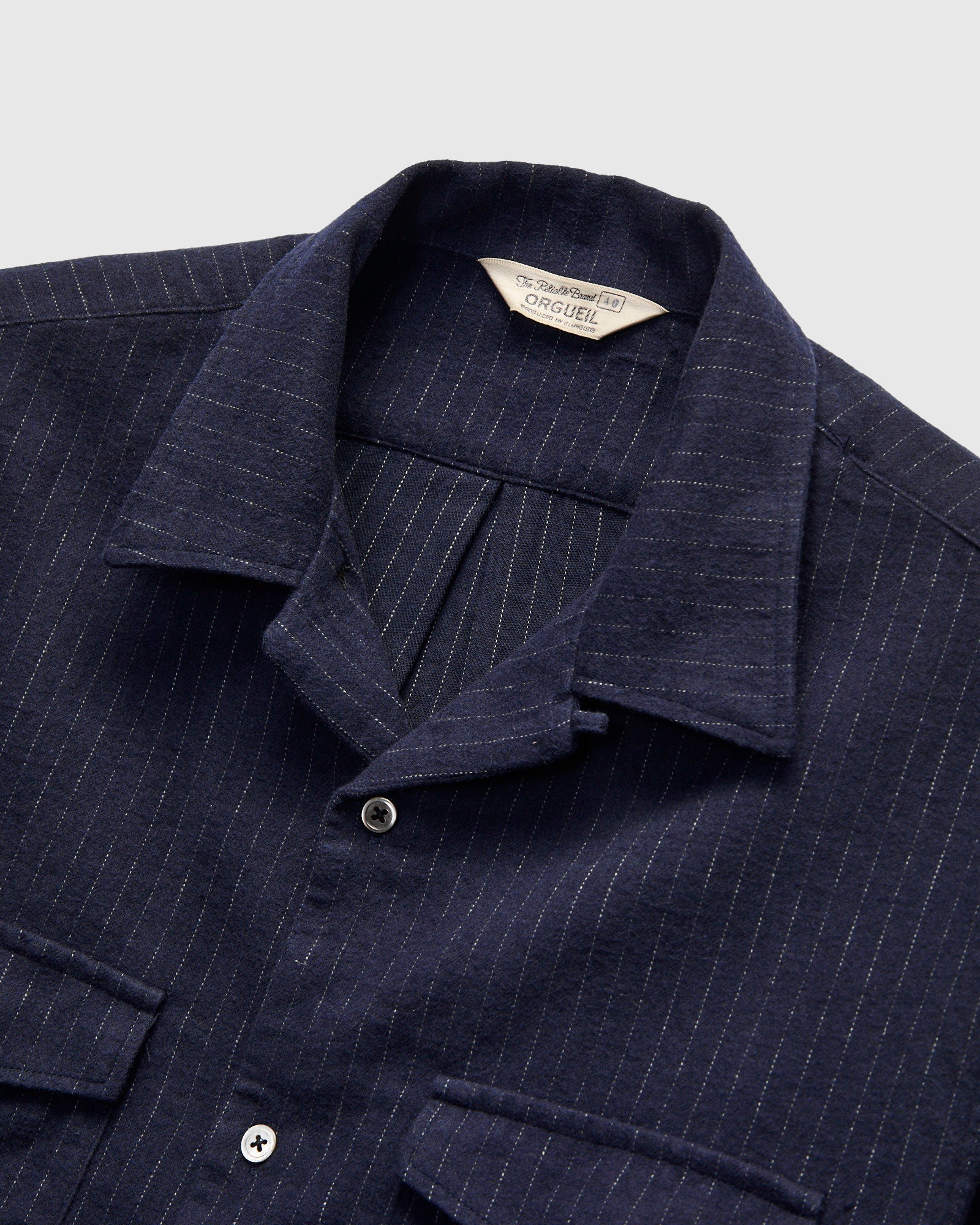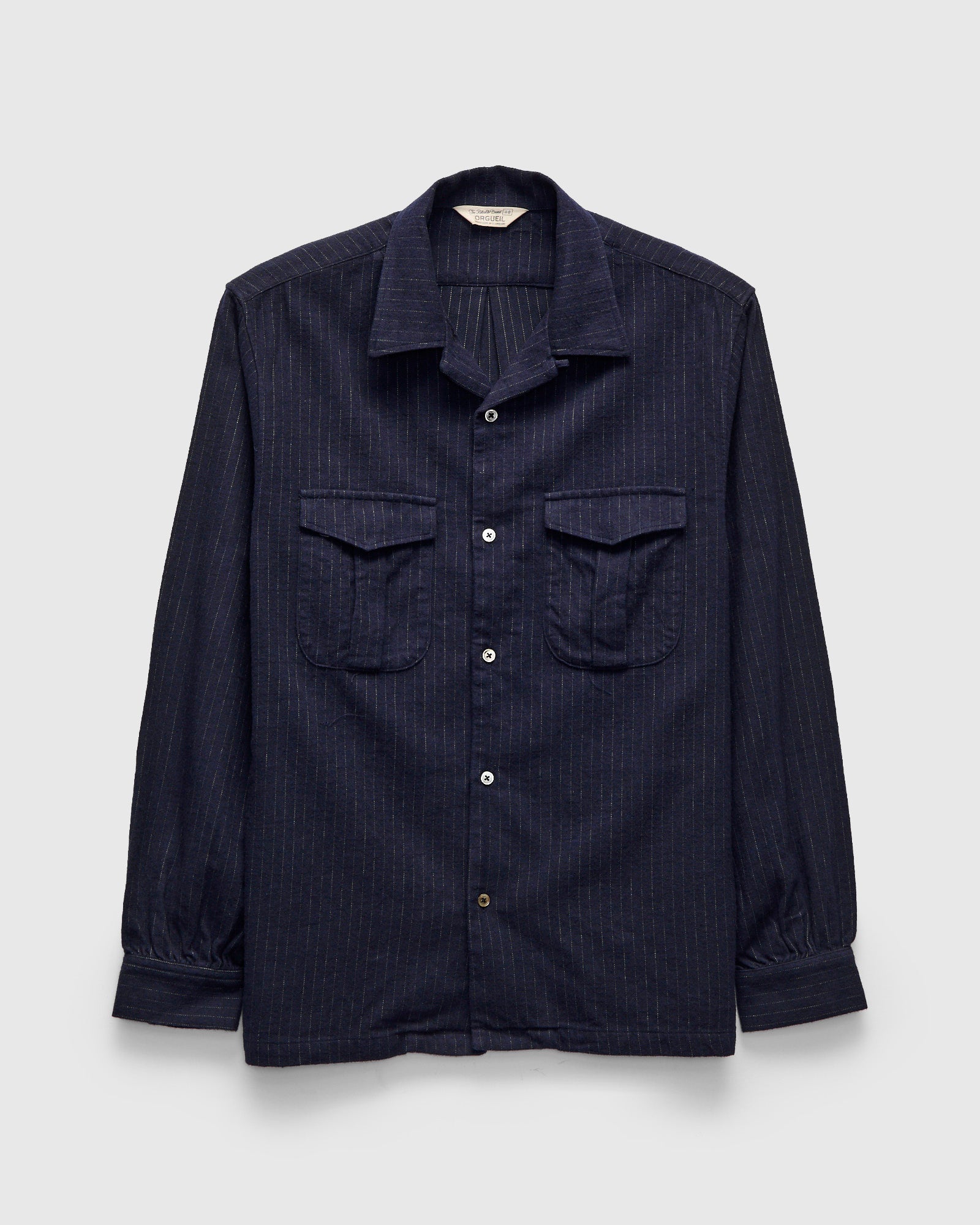 • Orgueil is an offshoot label of Studio D’Artisan referencing early 1900s French and American workwear. Receiving inspiration from 1930s gentleman's attire, this shirt features a custom cotton-linen-wool fabric. Crafted with an open camp collar, gusseted chest pockets, and mother of pearl buttons.