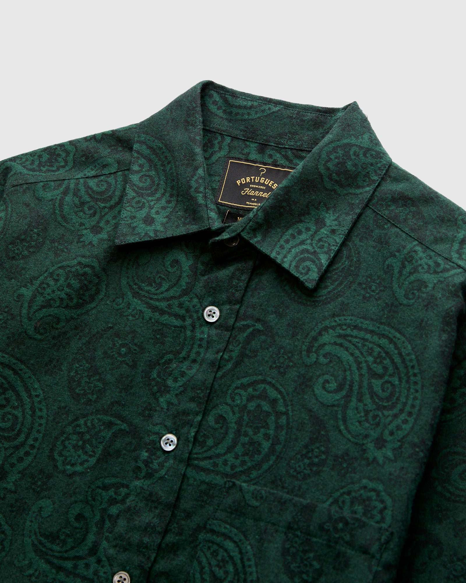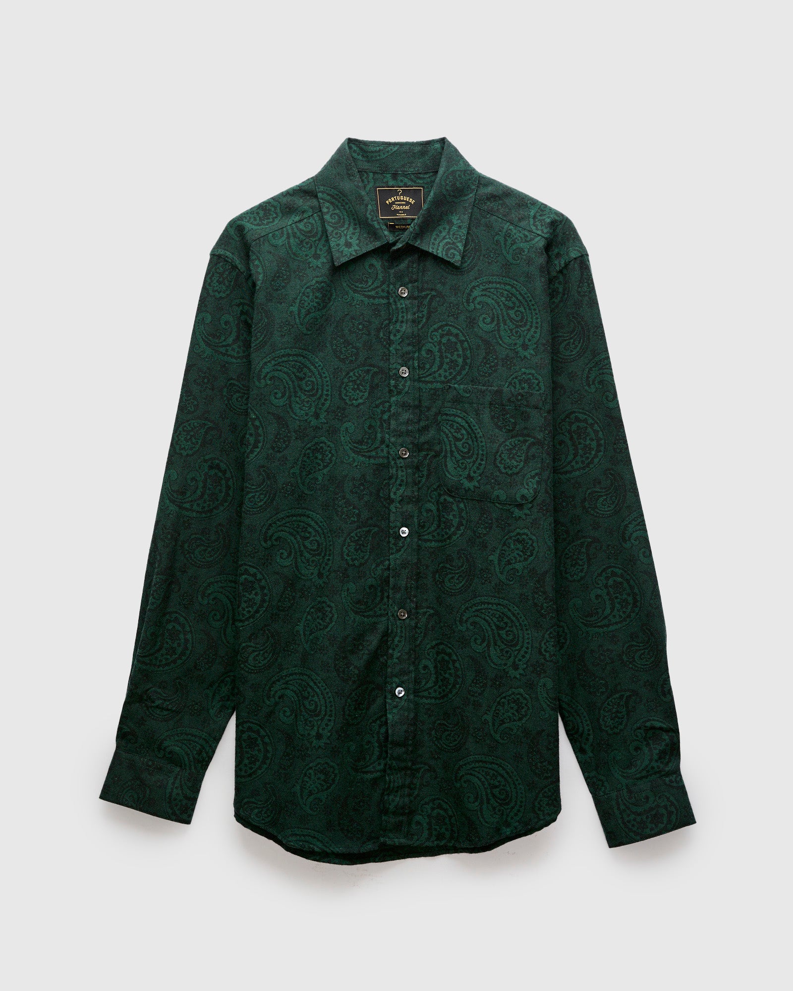 • The "Paisley" button-up from Portuguese Flannel is a timeless flannel shirt made using fabric from the brand's storied archive. Paisley Jacquard shirt is comprised of a soft jacquard flannel fabric woven with a floral paisley design. Fitted with a single chest pocket and cut in a slim fit silhouette with a curved hem.