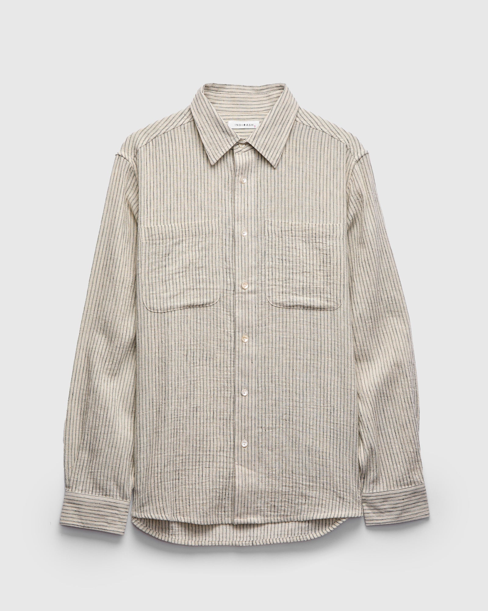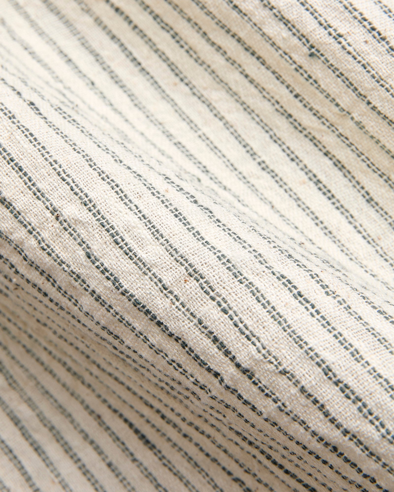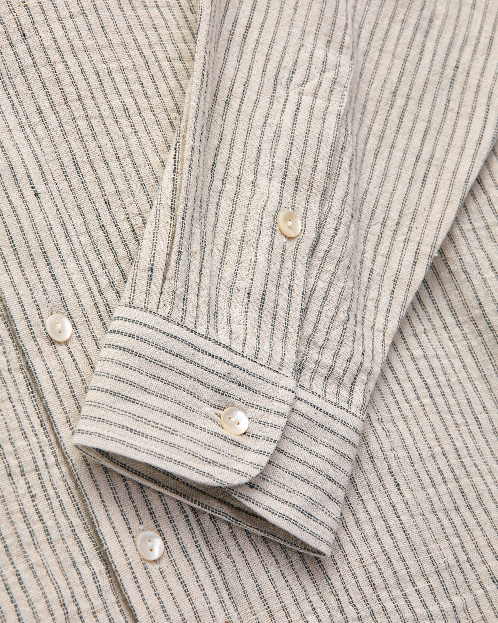 • The Rios Workshirt is a spread-collar work shirt designed with large utility patch pockets at the chest. This iteration is cut from handwoven kala cotton fabric, a purely rain-fed old world cotton with a soft touch and varied texture. Its teal yarns are dyed using a medley of natural ingredients including indigo and pomegranate, woven in a ticking stripe inspired by vintage railroad uniforms. Finished with Akoya shell buttons and sewn in a regular fit.