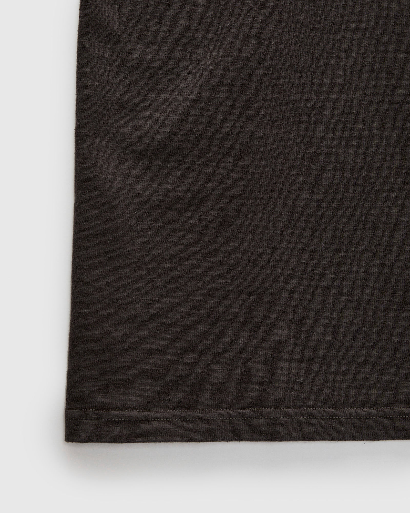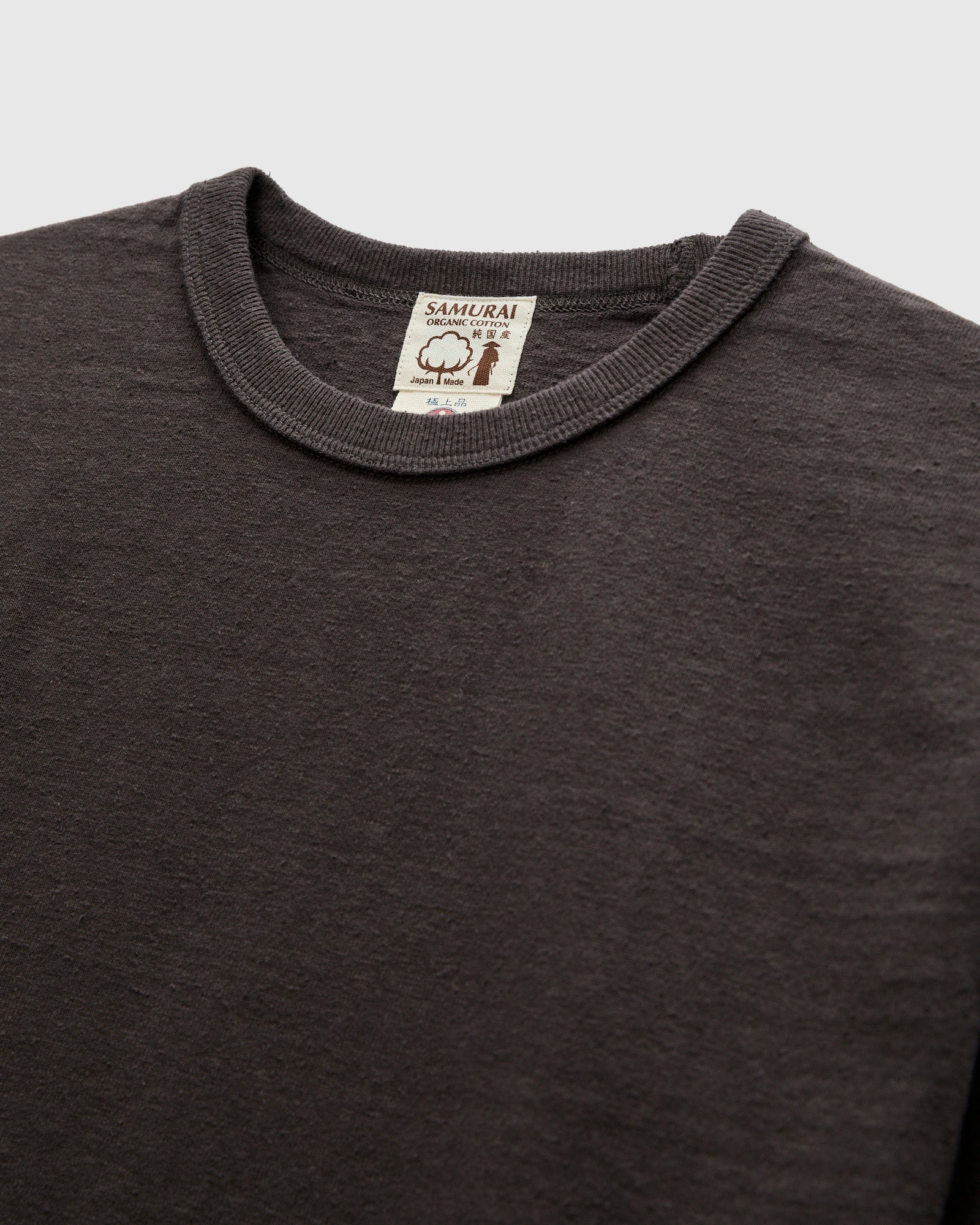 • Grown, harvested, and woven in Japan, this special edition shirt was originally conceptualized as a passion-project by Samurai Jeans founder Toru Nogami to produce a completely made in Japan denim from seed to stitch. Fittingly named the "Samurai Cotton Project," this project has created a new line of 100% Japan-made garments. Cherished for their beautiful fabrics and detail-oriented construction, this t-shirt is no different. Woven using natural slubby cotton, the shirt is finished on a 1960's vintage Union Special for an authentic vintage feel. This iteration receives it's dark color through a black bean 'kuromame' dye, giving the shirt a deep color that will transform overtime.