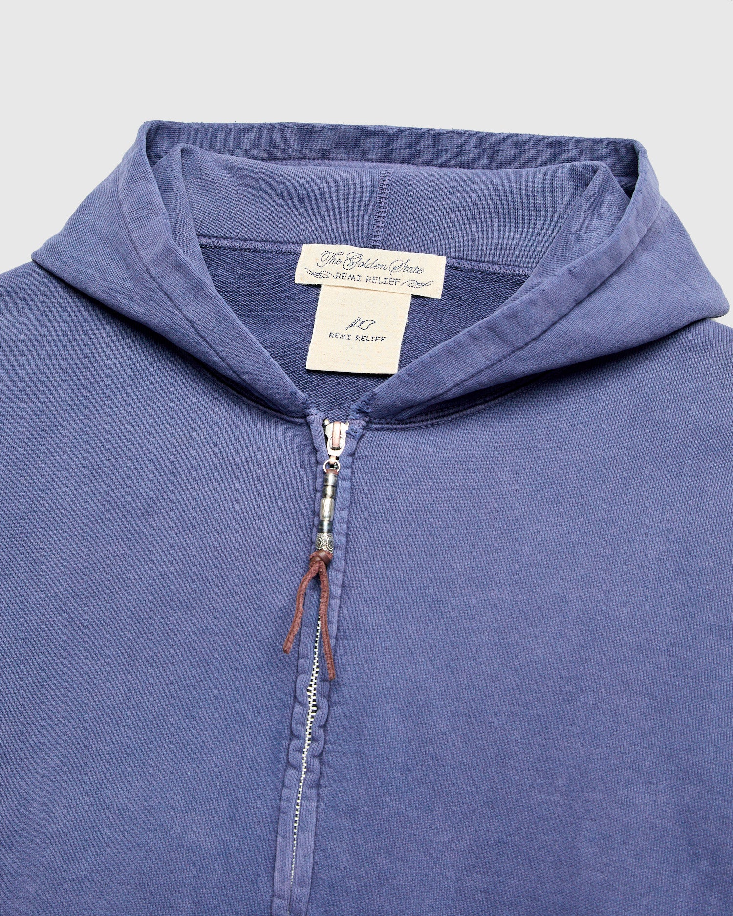 • Crafted entirely in-house, Remi's Special Finish sweaters are direct dyed and treated with an oxide-distress treatment to replicate the look and feel of naturally timeworn garments. The Special Finish Hoodie mimics sweatshirts from the 1930s to late 1960s, made using the brand's heavyweight cotton fleece and stitched with era specific detailing. Fitted with handwarmer pockets, western-leather tassel silver bead zip, and a streamlined hoodie free of drawstrings.