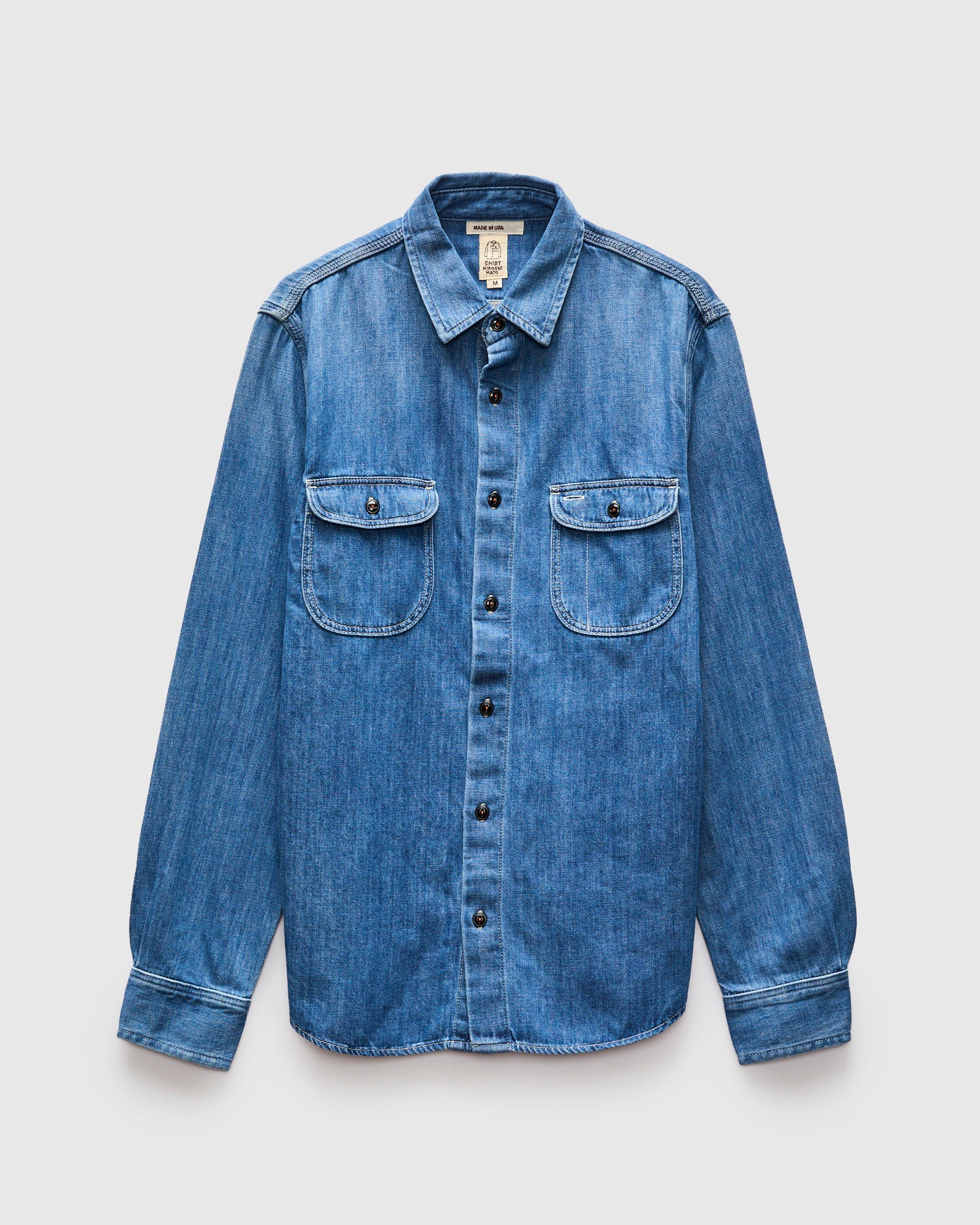 • Hiroshi Kato's Brace Shirt is a rugged workshirt sewn from a 7oz loose weave denim fabric. Cut in a regular fit, the shirt features two flap pockets at the chest, triple stitched shoulders, and chain-stitched side seams.