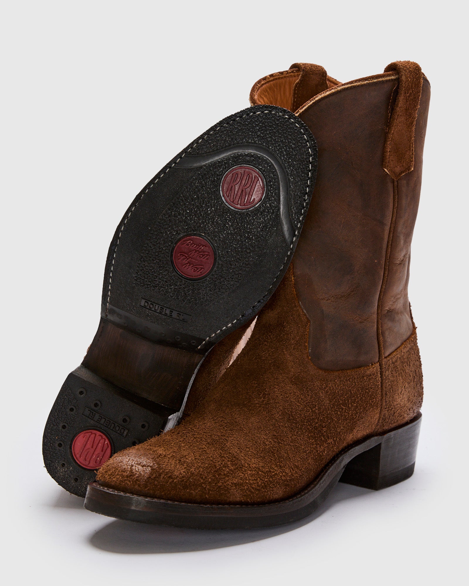 • The Walker Boot is a signature western style from RRL made using all-American vegetable-tanned leather. Handmade in a small Texas factory that has been constructing boots for over 160 years, these boots are built on a vintage shoe last from the 1940s that provides extra room in the heel for comfort and flexibility during riding. The boots are hand-lasted and reinforced with steel for a lifetime of durability, and feature custom-branded RRL soles, fully stacked leather heels, and a rubber heel tap.