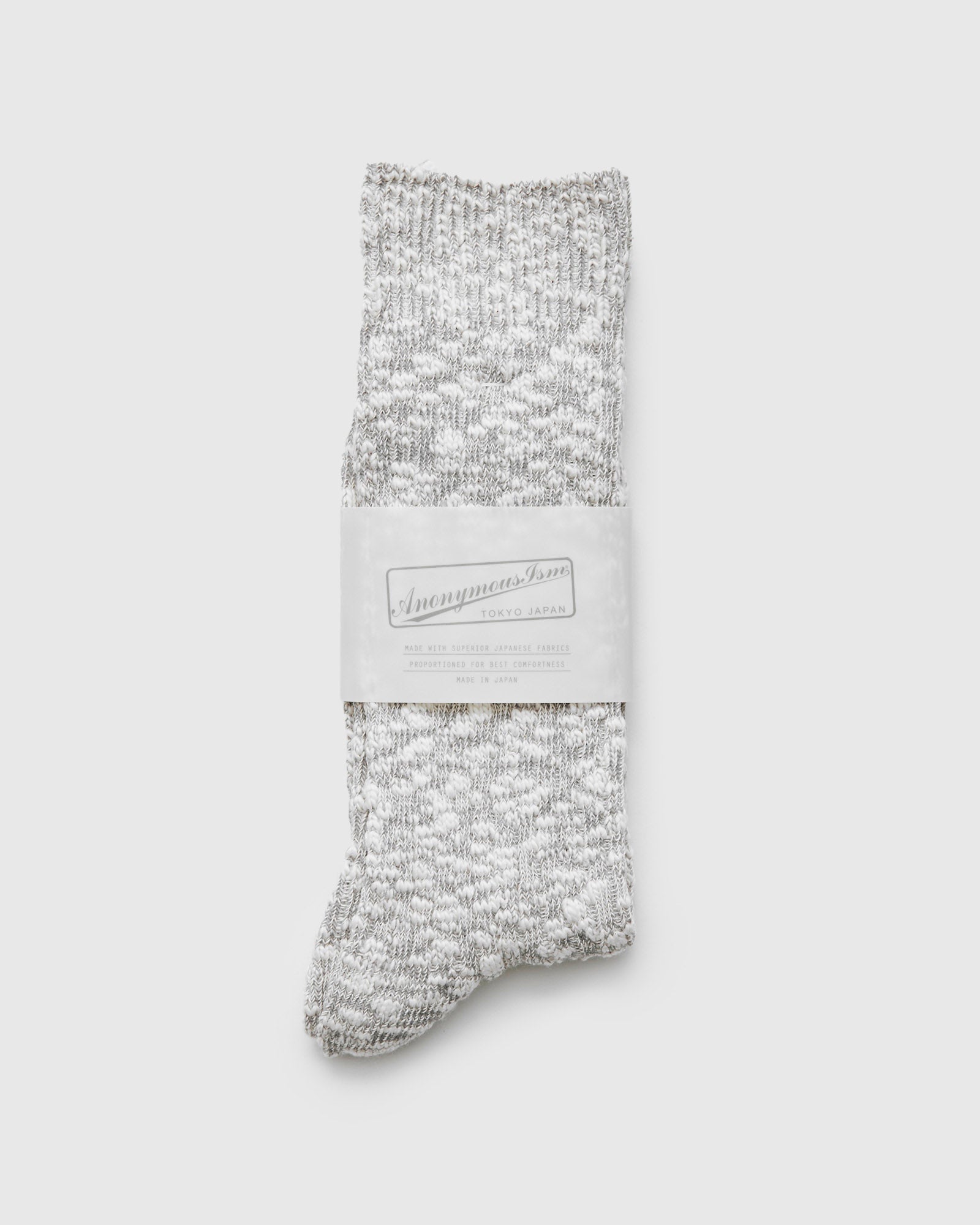 • The "Light Slub Crew" series from AnonymousIsm signature slub socks with a minimalist textured design. Woven using a slub weave yarn, the socks sport a tubular construction with ribbed knitting. Each pair of AnonymousIsm socks are expertly crafted by their team in Tokyo, Japan.