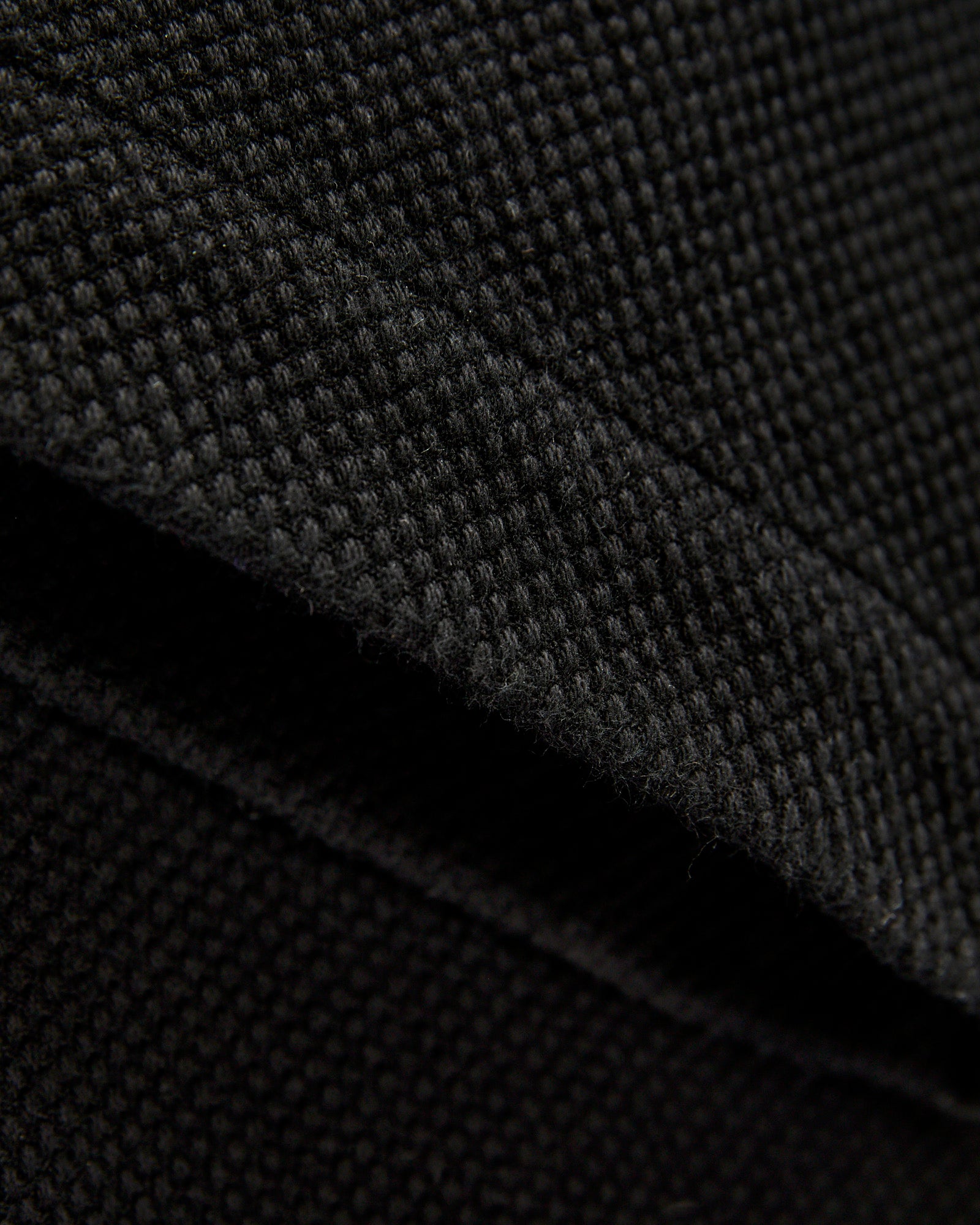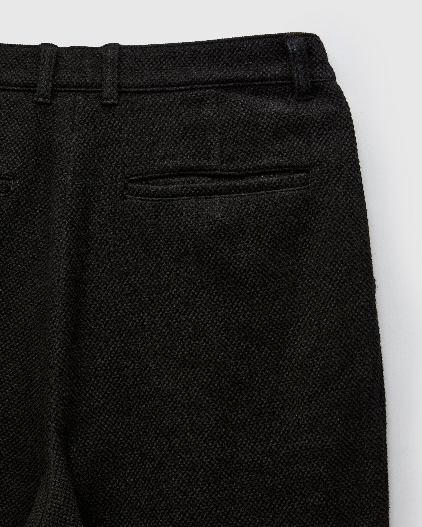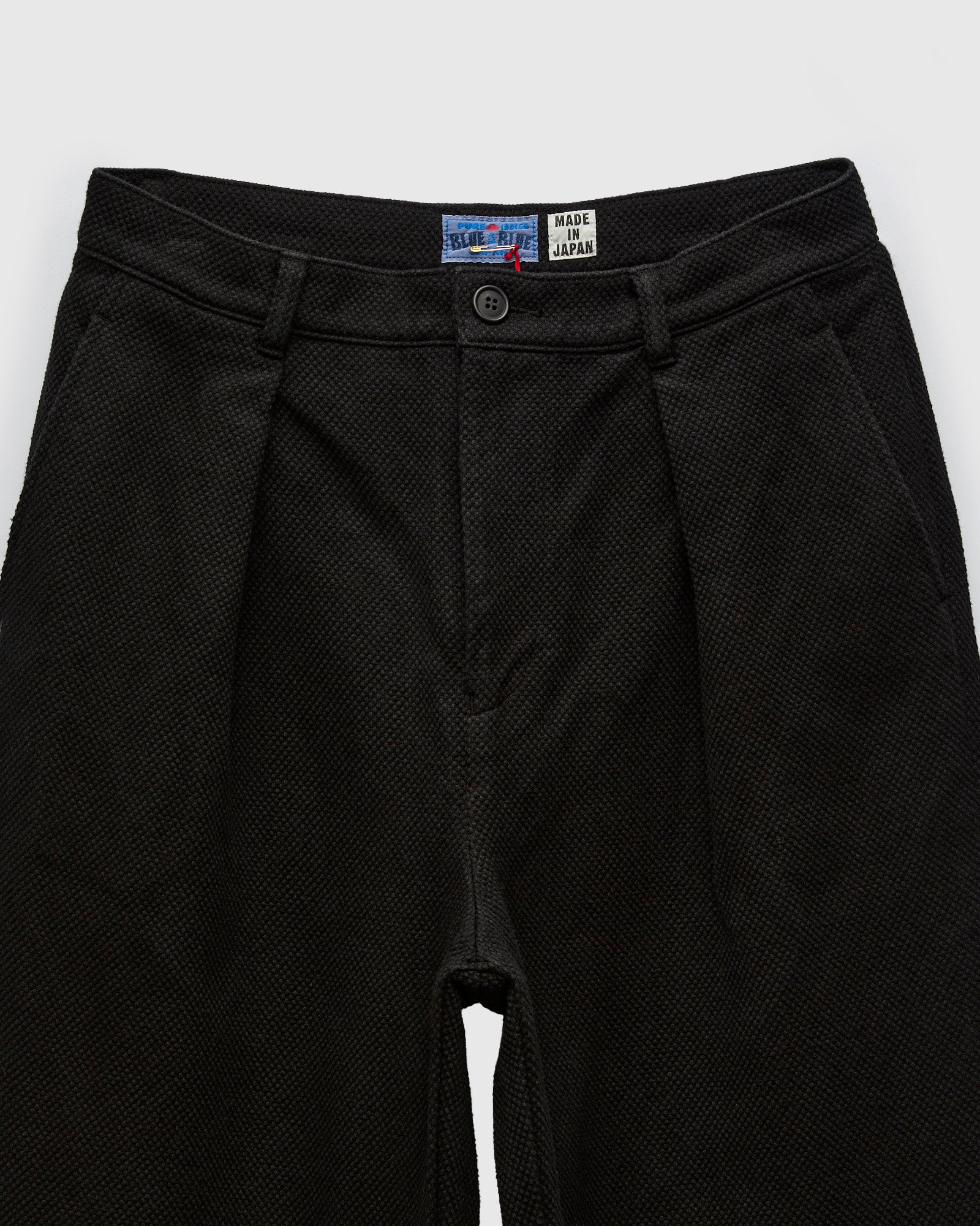 • The Double Cloth Sashiko Trousers by Blue Blue Japan blend contemporary tailoring with traditional Japanese textiles. Rooted in martial arts and Japanese workwear, the Double Cloth Sashiko fabric sports a heavyweight weave and textured surface. The trousers are hand-dyed a deep black color, yielding a soft solid tone.