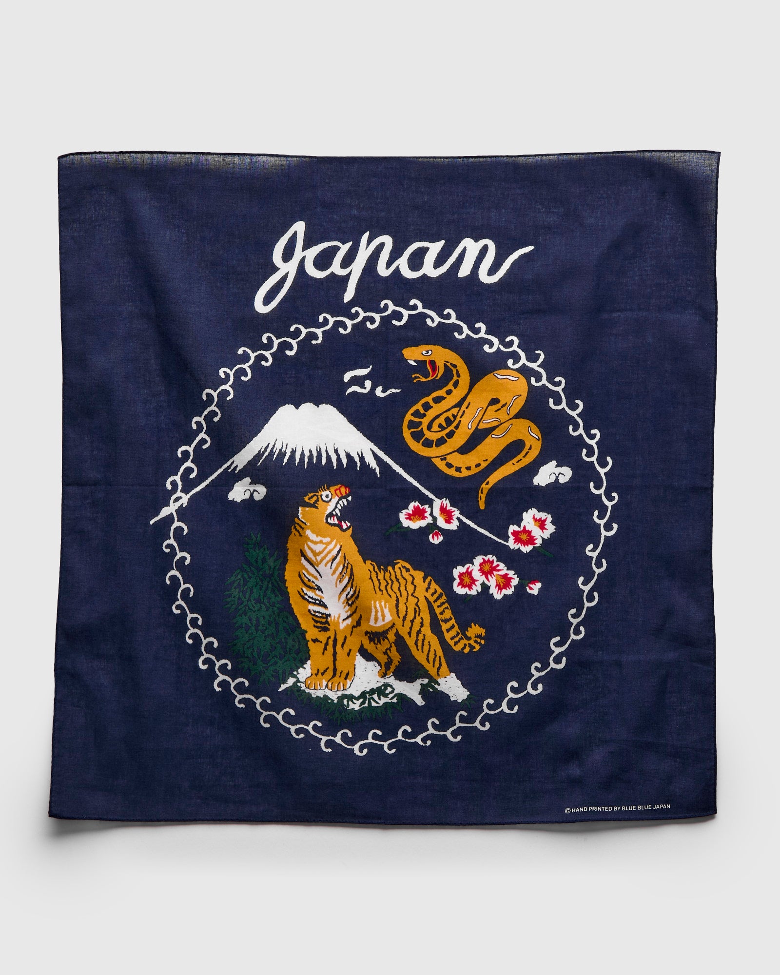 • Blue Blue Japan's bandanna's are crafted from pre-washed cotton with designs celebrating the brand's rich heritage. Translated to "Tiger in Fuji" the bandana references the zodiac featuring a tiger, wisteria flower, and snake.