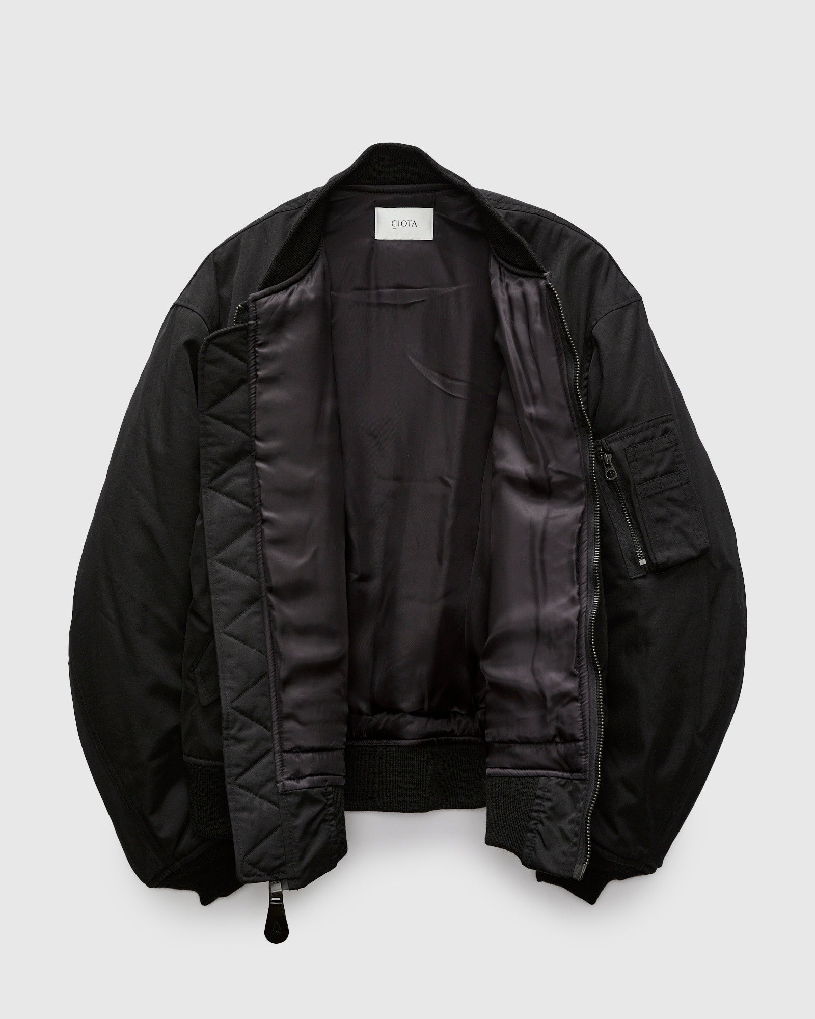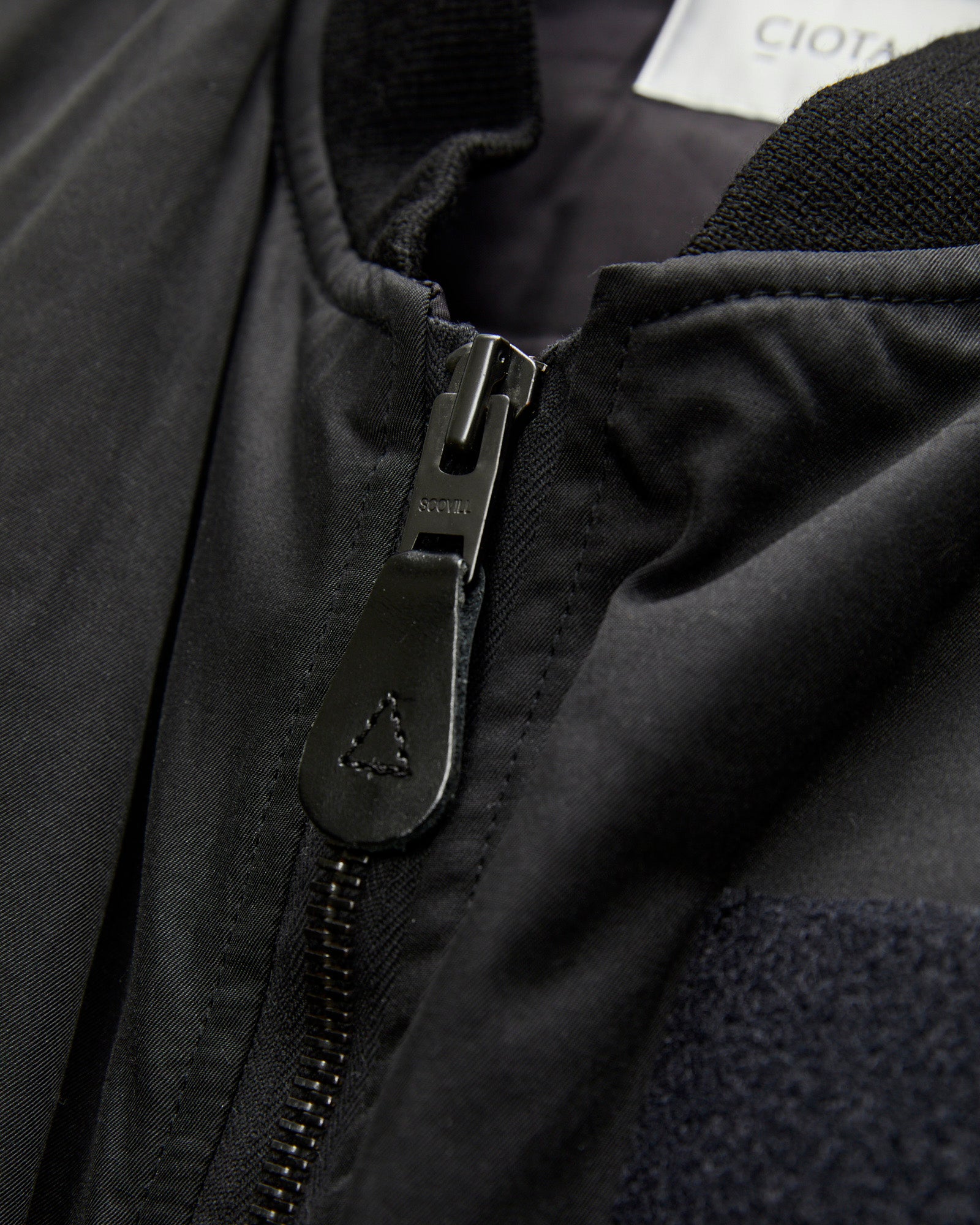 • Hyper-refining the MA-1 Flight Jacket, CIOTA's rendition balances military-heritage with contemporary styling. CIOTA produces a high-density twill for their MA-1; woven using Suvin cotton and Toray nylon yarns for a silk-like softness and relaxed drape. The jacket receives its color from a liquid “Jet” dyeing technique - a laborious process requiring repeated kneading through a continuous flow of dye solution to achieve deep color penetration with subtle tonal variations. The jacket is insulated with ultra-fine Toray fibers, a down alternative and lightweight fill chosen for its exceptional heat retention. Finished with handwarmer pockets, a Scovill zipper, and smooth cupro lining.