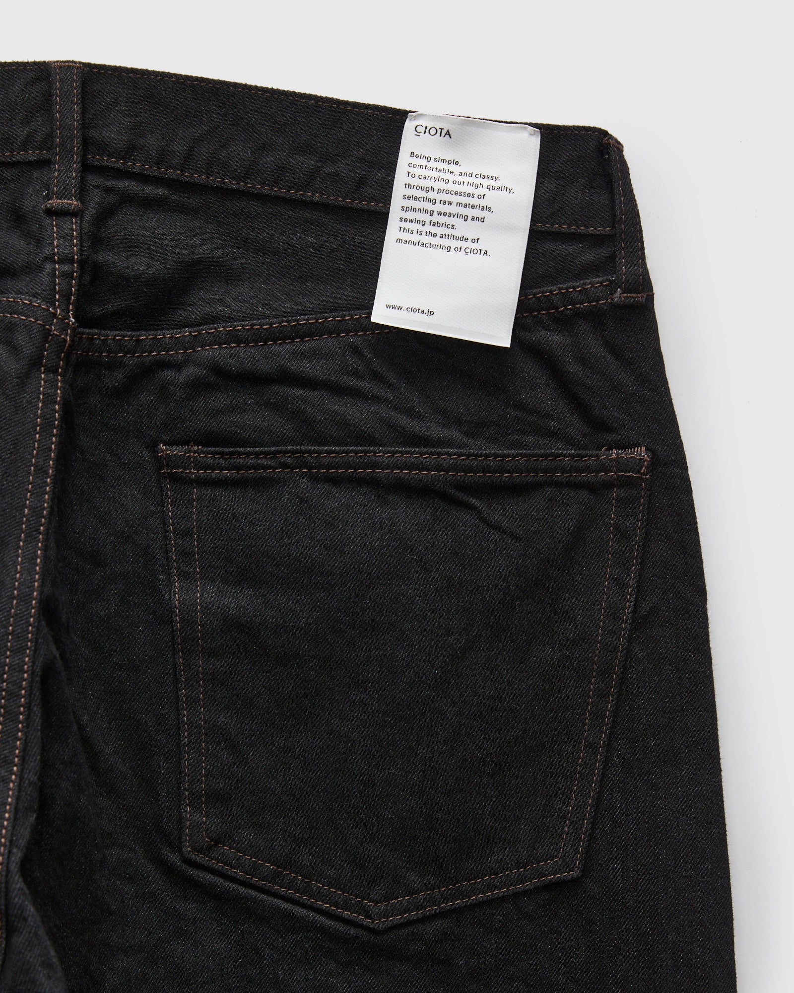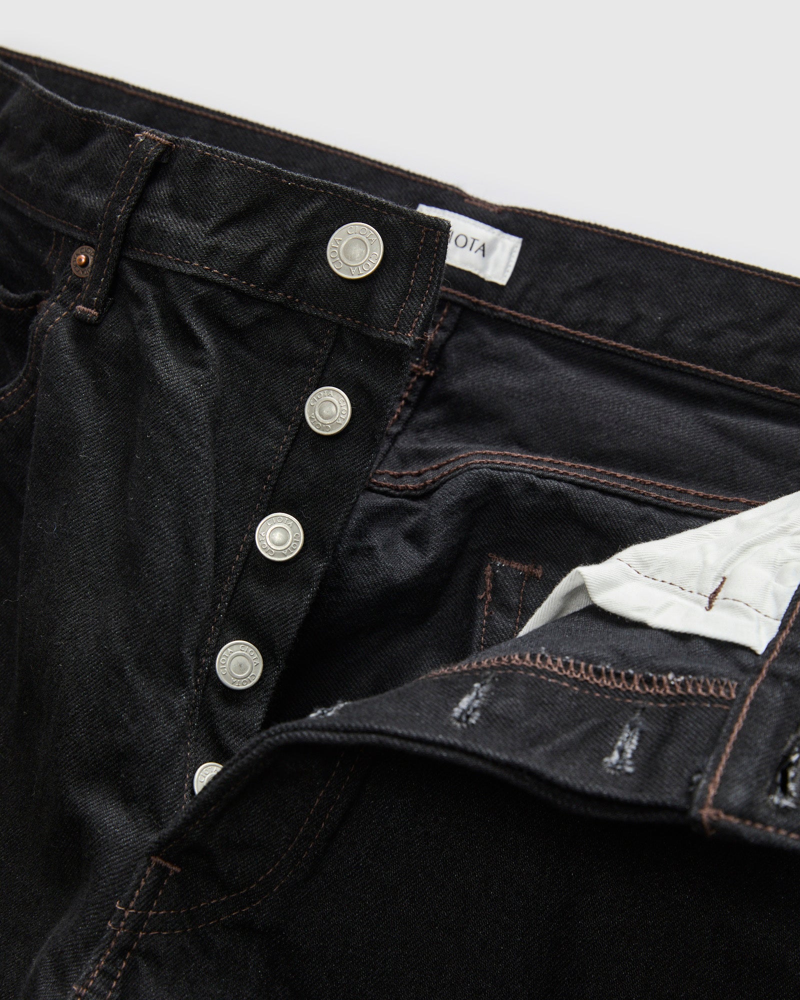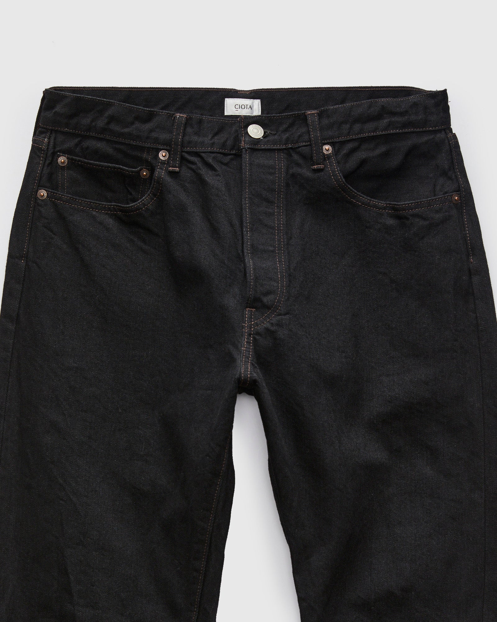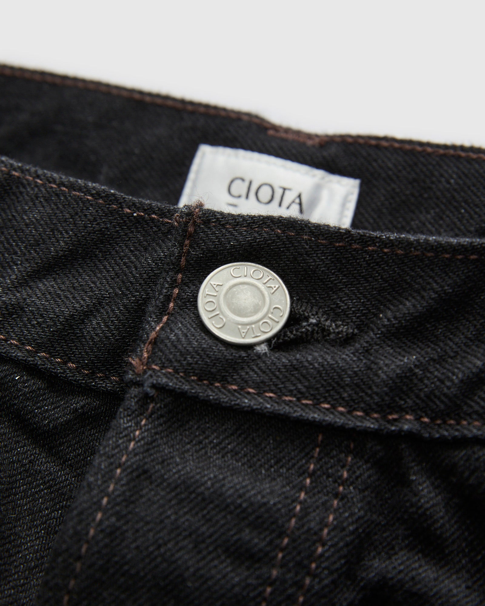 • CIOTA’s Straight Fit is a regular cut receiving design cues from pants worn throughout the 1970s. Woven on old-fashioned shuttle looms, CIOTA uses extra-long staple Suvin cotton yarns in their selvedge denim giving the fabric a durable tensile and natural softness. Rope-dyed sulfur black, the fabric has been rinse treated giving the denim a relaxed drape and soft tone. The pants are finished in a classic five-pocket silhouette, complete with custom hardware and detailing.