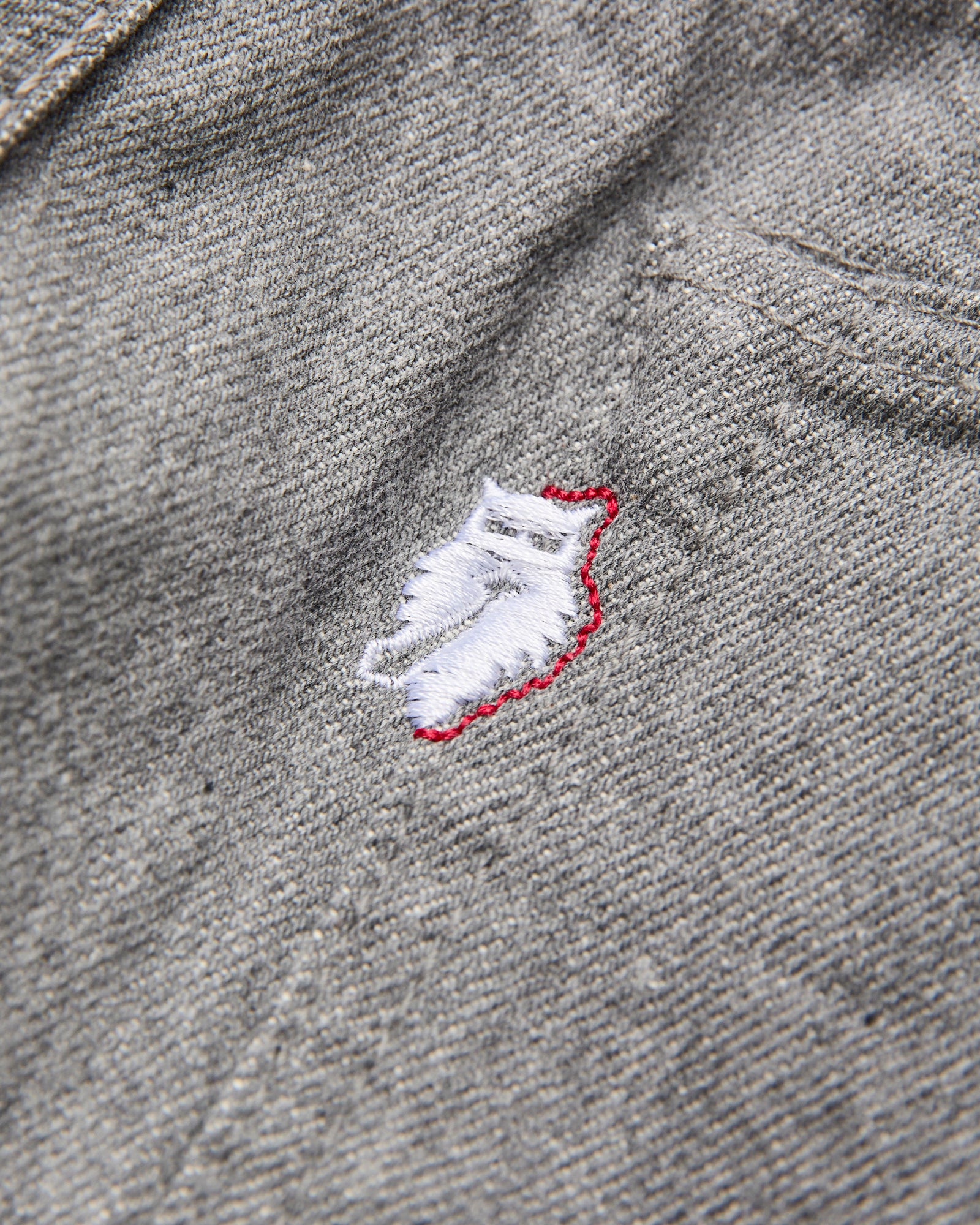 • Presenting the third installment in the Pure Blue Japan x Blue Owl collaboration series: the Moonrock Selvedge Denim. Built using Pure Blue Japan’s signature 14oz rinsed selvedge denim, this version features a light grey warp and classic white weft interior. With wear, the jeans will develop soft- muted fade patterns reminiscent of washed denim from the early 2000s. Finished with collaborative detailing, the jeans feature a custom grey deerskin patch and Blue Owl embroidered insignia in the style of PBJ’s indigofera leaf.