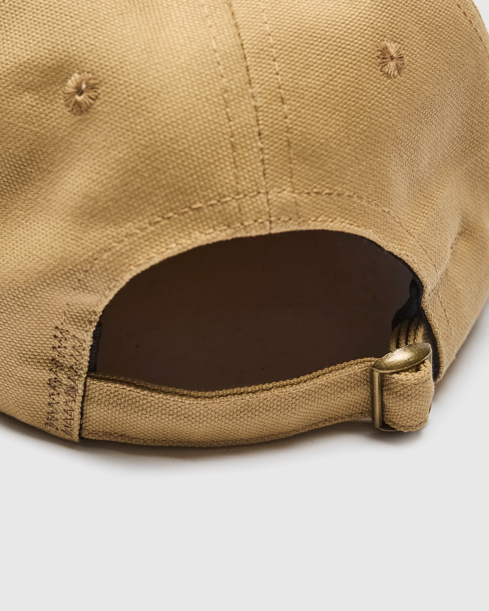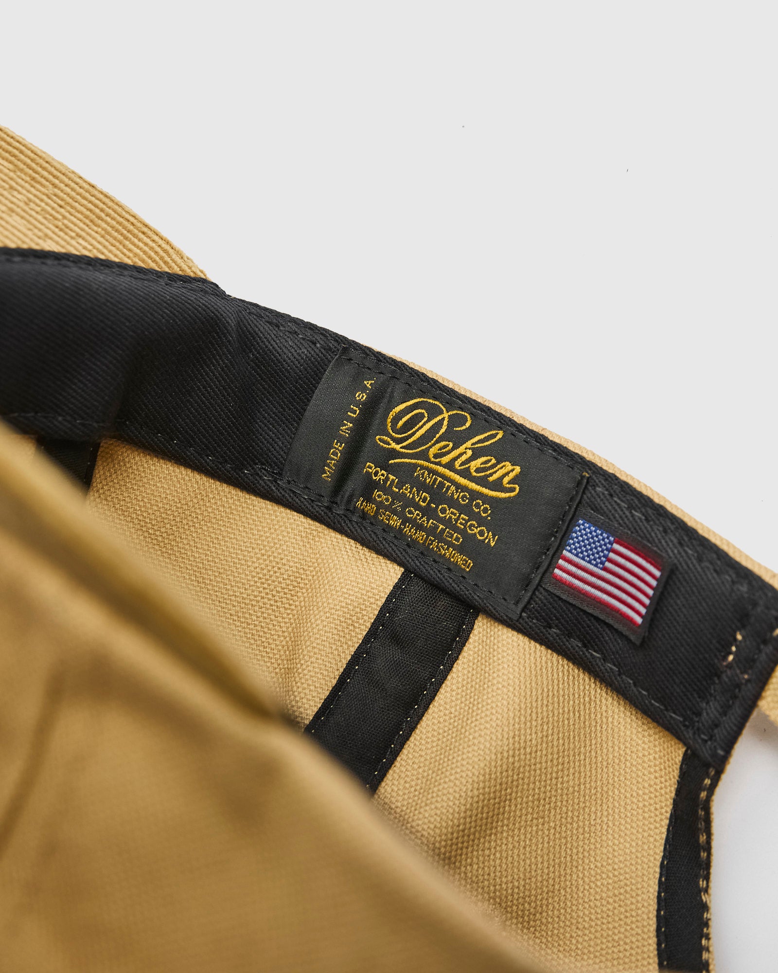 • Dehen's baseball hats are crafted in the USA using fabrics from the brand’s vast collection. Built from a combination of duck canvas and cotton corduroy, the hat features a classic six-panel design with an unstructured crown. It is finished with an adjustable strap back and a herringbone sweatband.