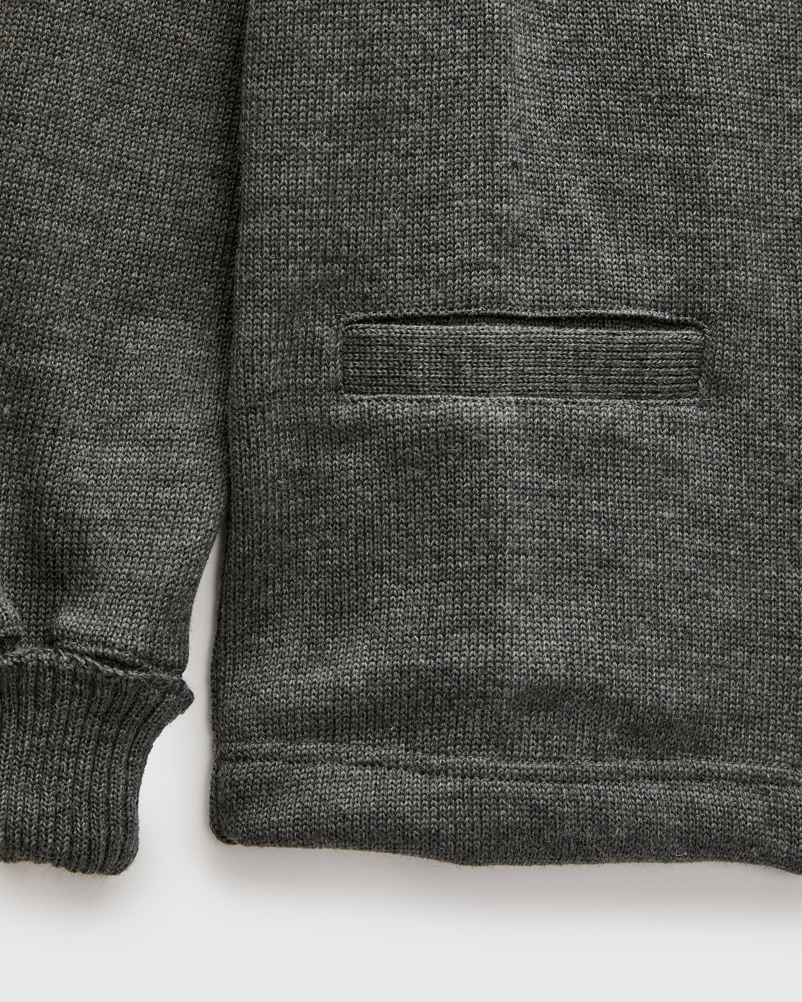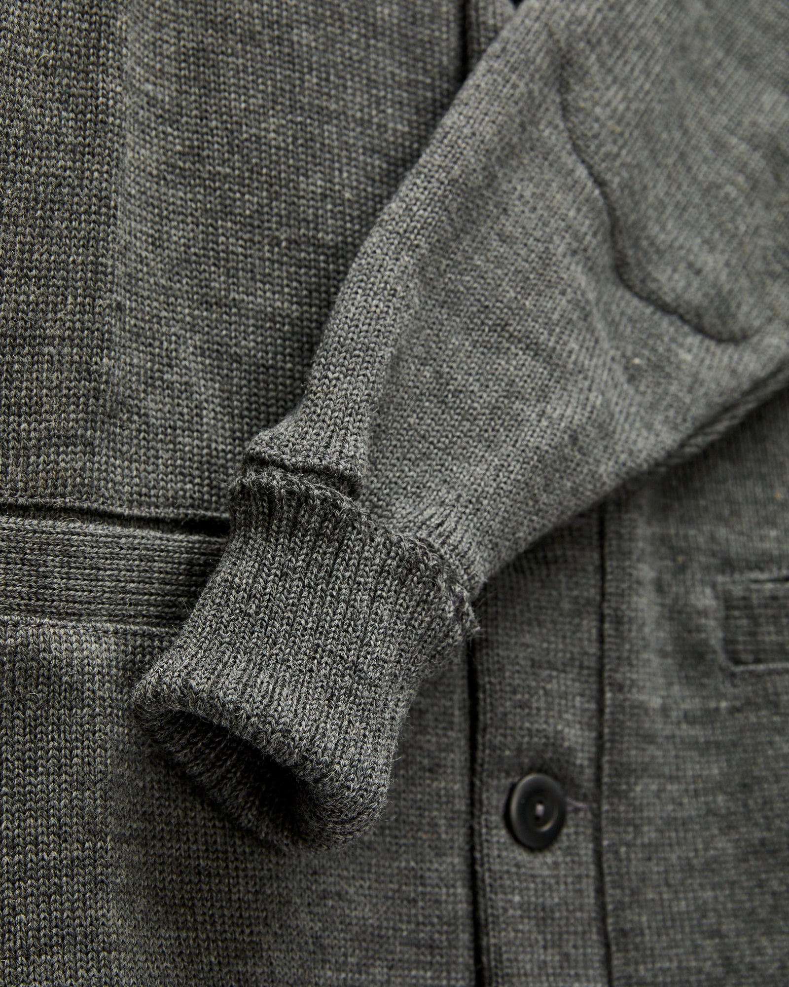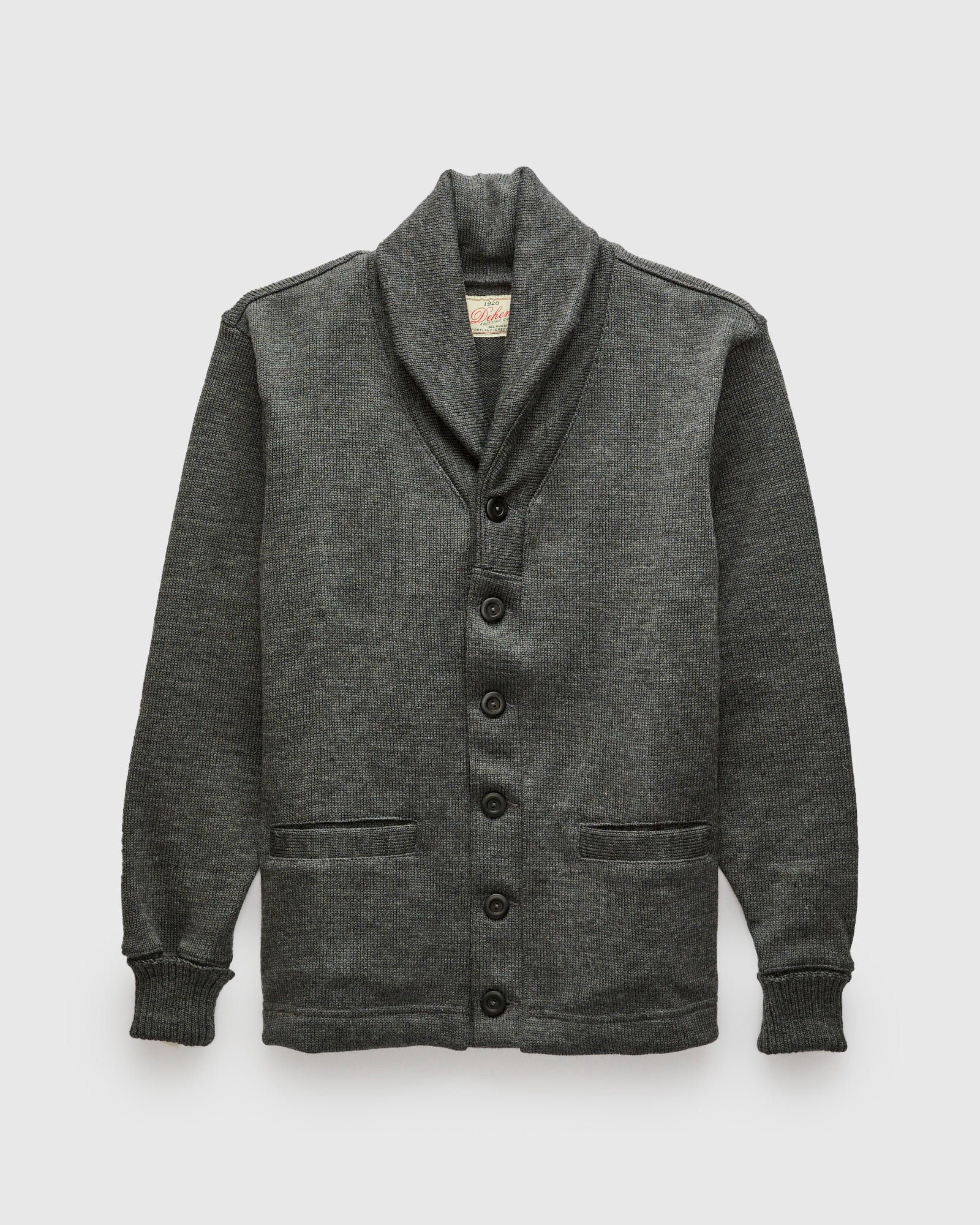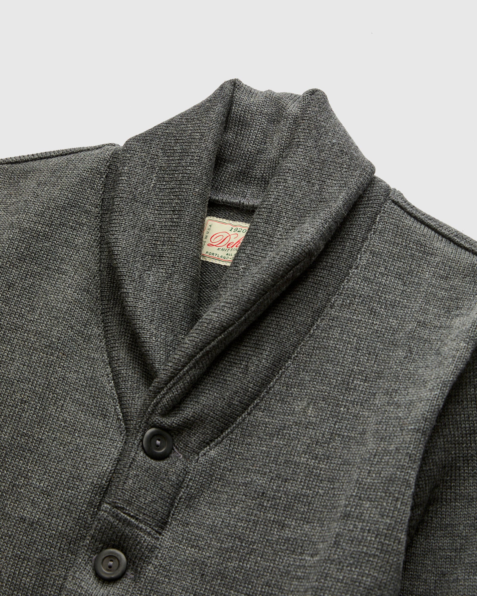• The Shawl Sweater Coat from Dehen 1920 is knit at the brand's Portland, Oregon factory using Dehen's extra heavy four-end jersey. Made using more than three pounds of 100% worsted wool yarn, this sweater is designed to withstand the test of time in both style and durability. The sweater is finished with welt pockets at the waist, interior elbow patches, fold back cuffs and custom corozo buttons.