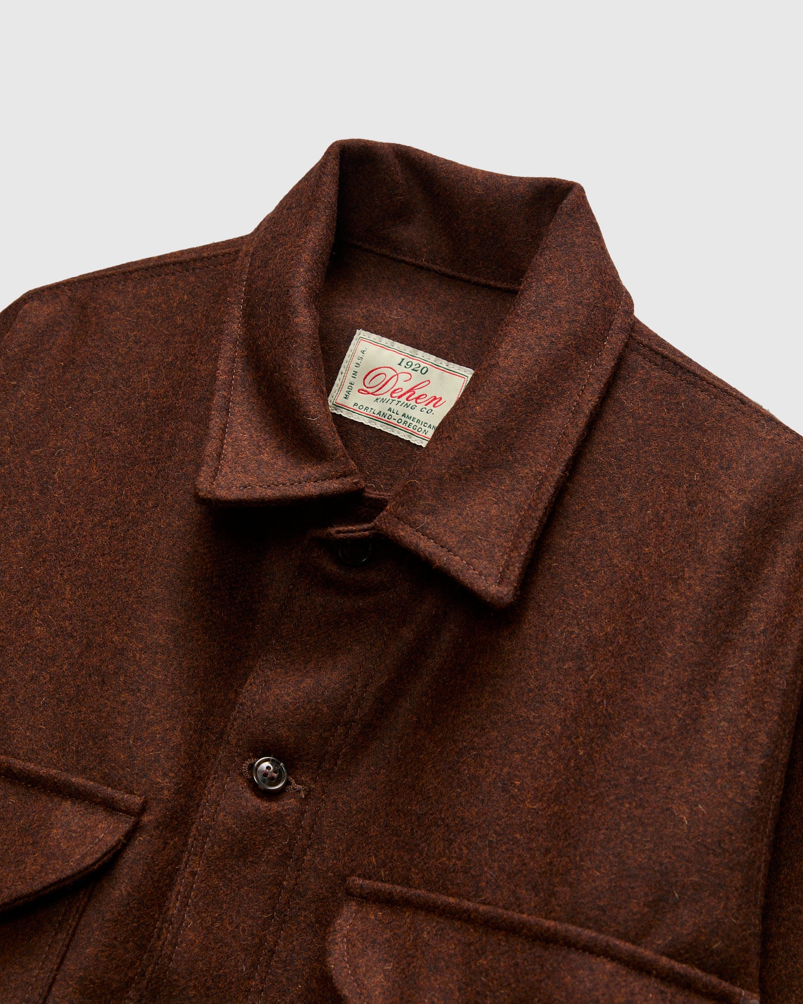 • Dehen's Skyline Overshirt is an unlined shirt jacket inspired by CPO shirts issued to naval officers throughout the 1950s. The overshirt features two large chest pockets and is sewn using a 16oz densely woven wool milled in the U.K. by Abraham Moon & Sons.
