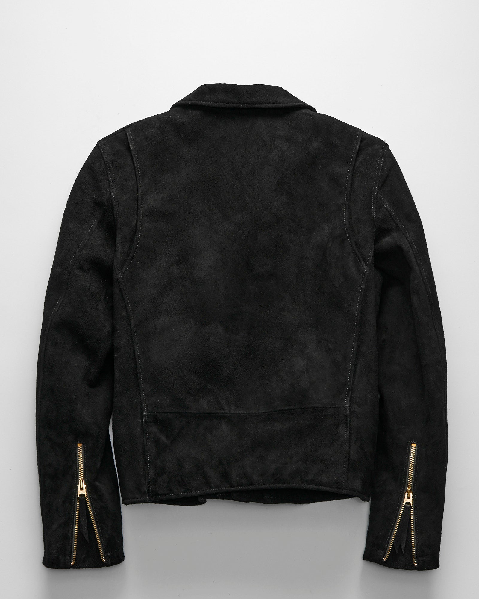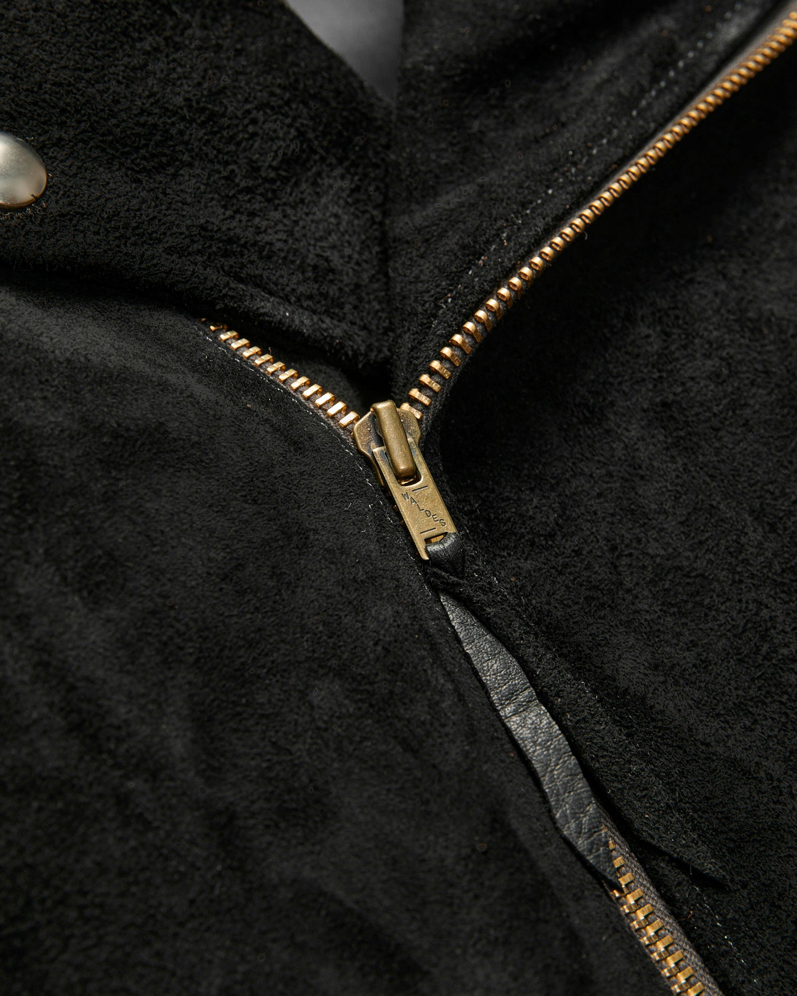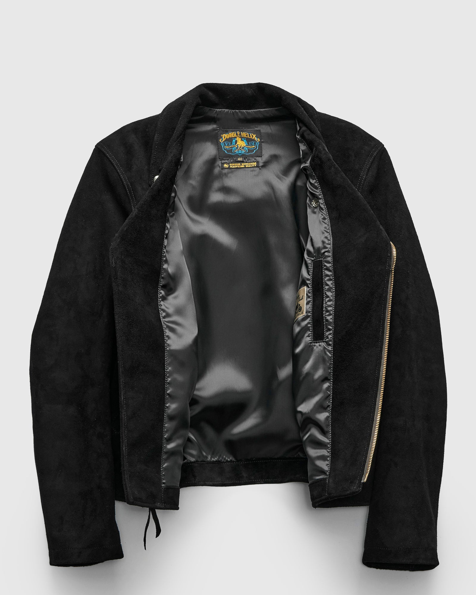 • The Deviant is an asymmetrical double-riders jacket absent of traditional epaulets and waist belts for a cleaner, more streamlined silhouette. Crafted from lightweight horsehide suede, the jacket offers a soft, supple hand with a deep pitch-black color. Finished with a smooth cupro lining, interior chest pocket, handwarmer waist pockets, and antique brass hardware.