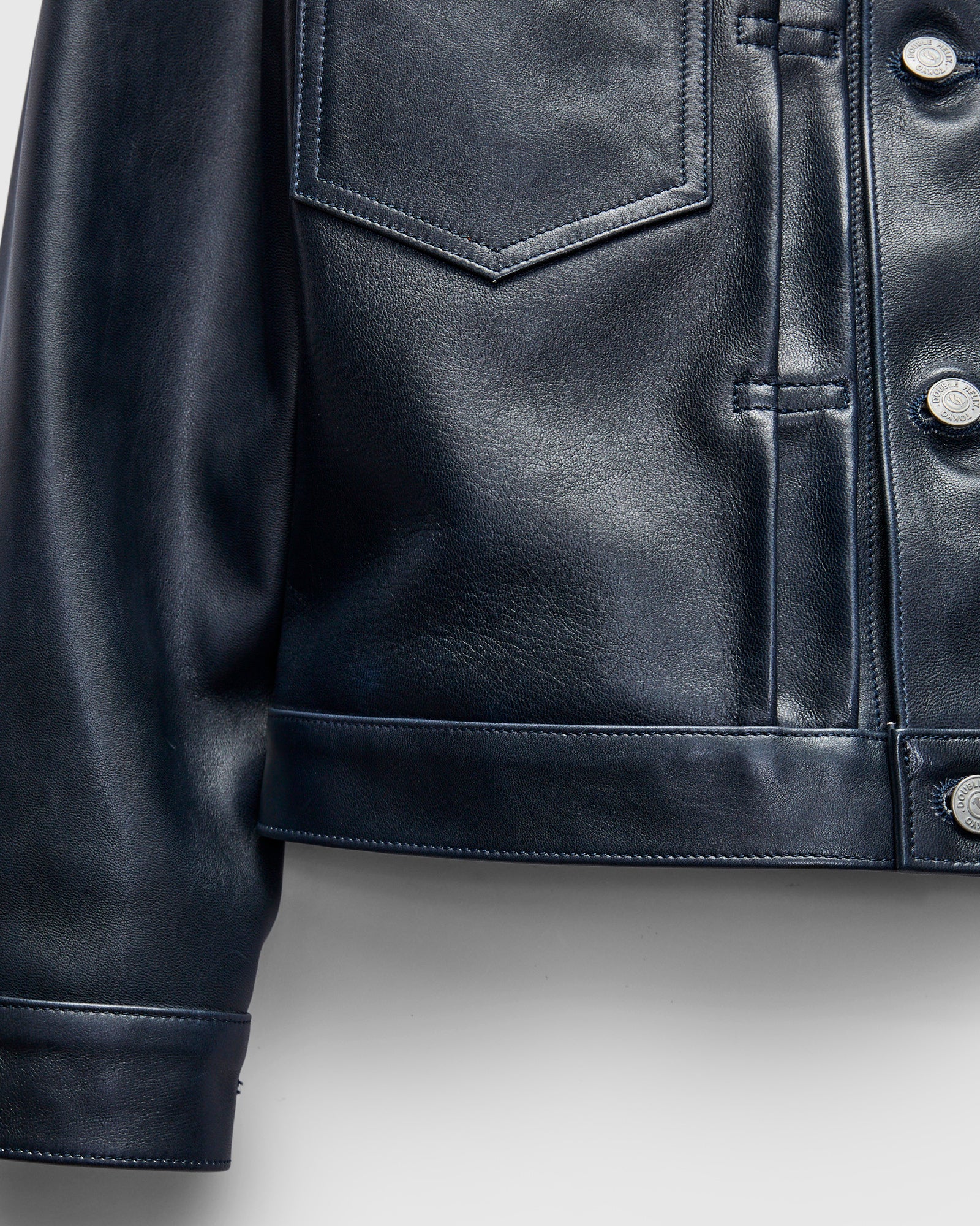 • Crafted from indigo-dyed leather, this limited release from Double Helix offers the style and fading of a denim jacket in a heavy-duty horsehide. Developed exclusively for Double Helix, the leather undergoes a special wash treatment to create a bone-white hide, which is then surface-dyed with genuine indigo the same way denim yarn is often dyed. The result is a deep navy blue finish that retains its white core, allowing the jacket to fade and evolve beautifully over time, just like a vintage denim jacket. The jacket comes finished with custom hardware, large flap pockets, and a smooth cotton twill liner.