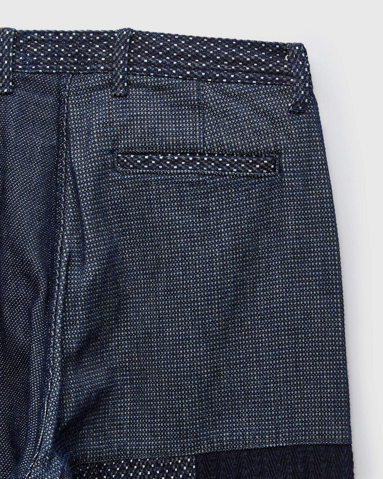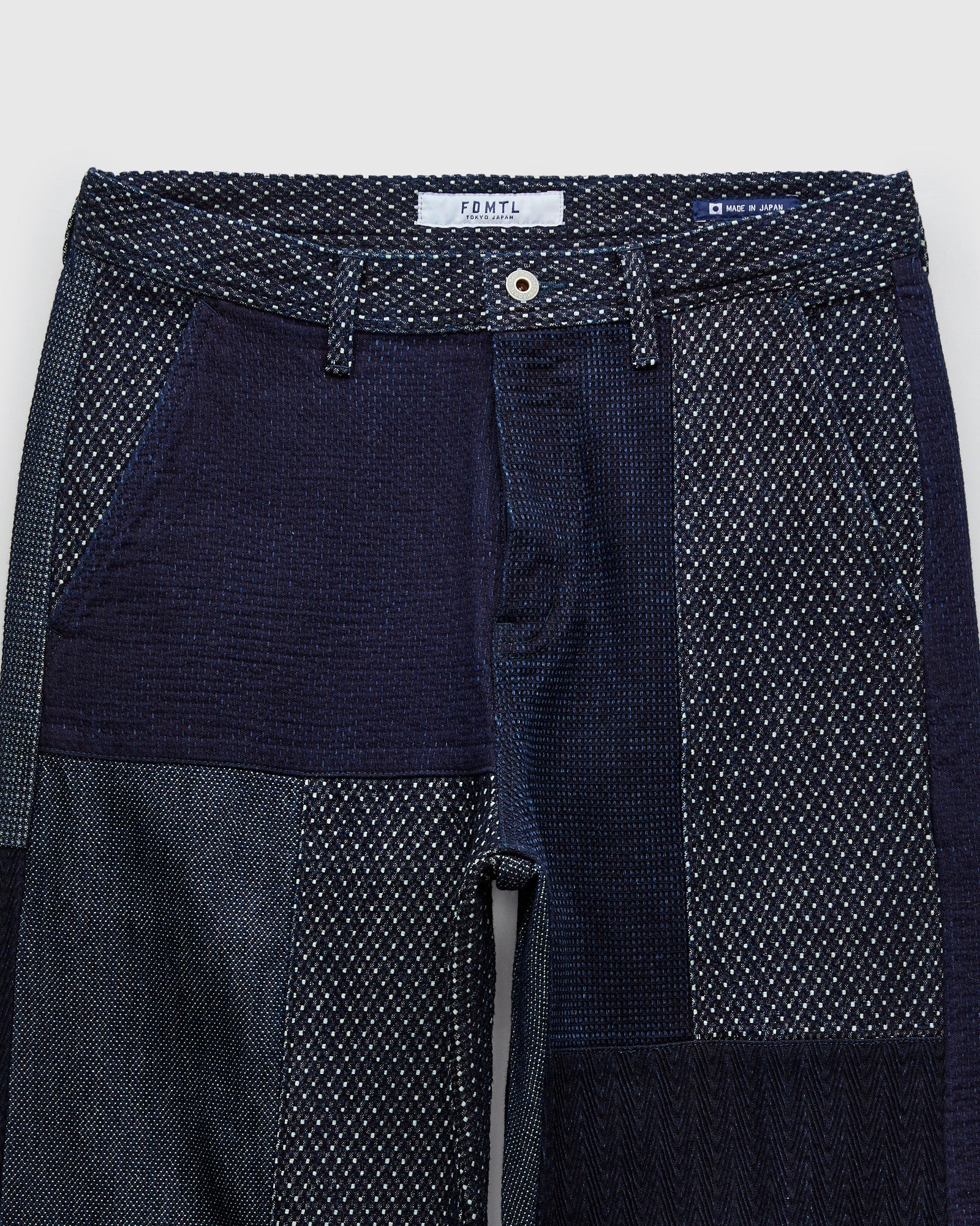• These patchwork pants from FDMTL are built using a variety of indigo-dyed sashiko fabrics in a boro-patchwork design. With wear, the pants will fade to show a variety of colors and textures. Cut in a wide leg fit with slant pockets at the waist and welt pockets at the rear.