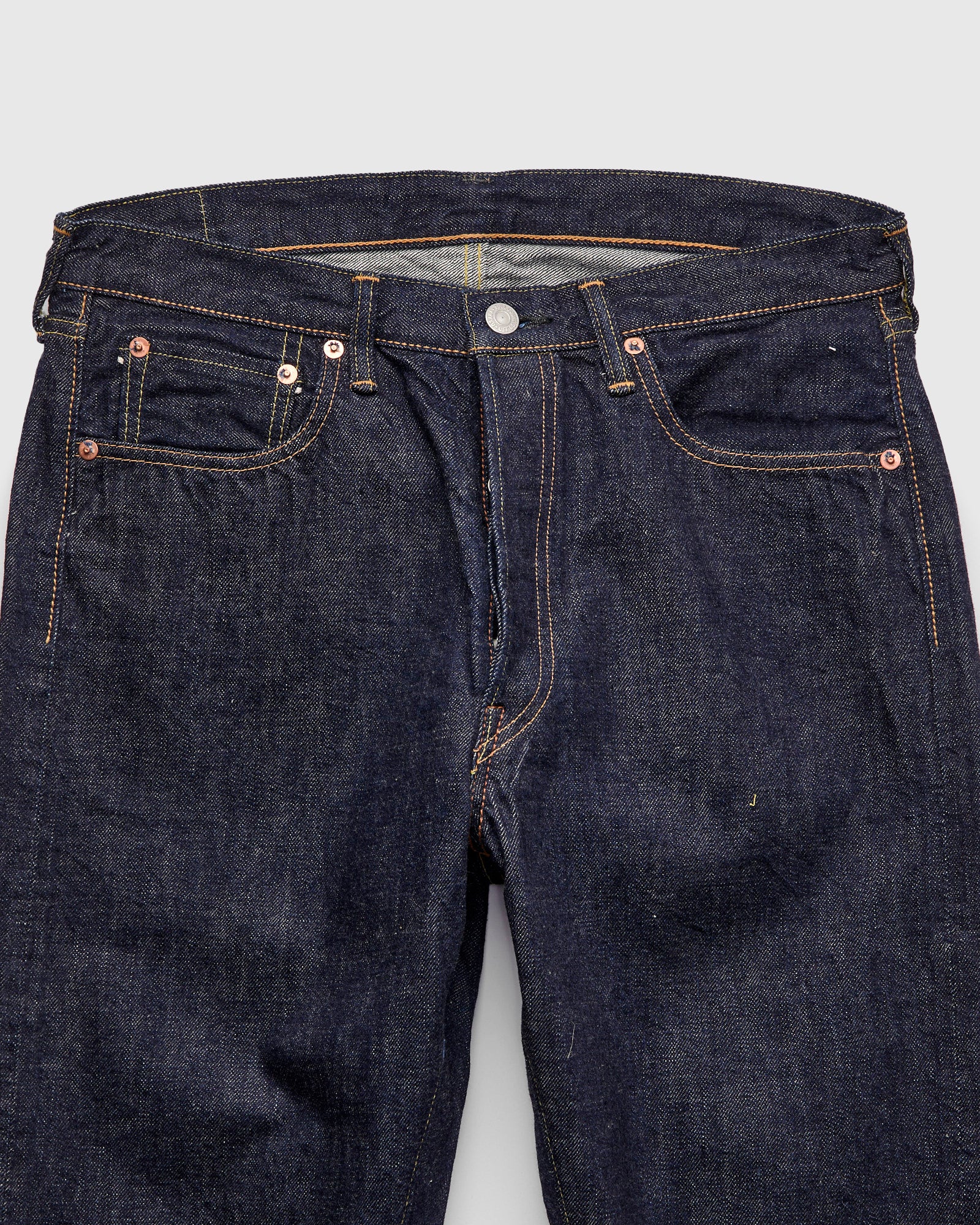 • Fullcount’s tapered fit has a medium rise, ample thigh room, and a strong taper through the leg