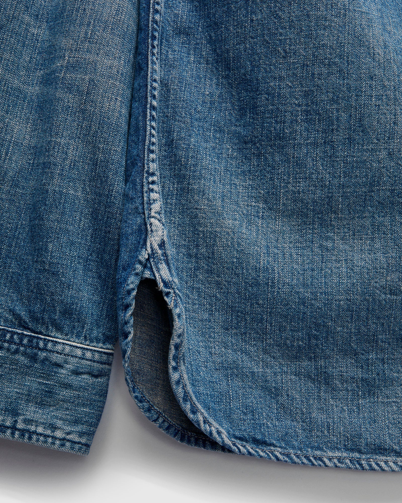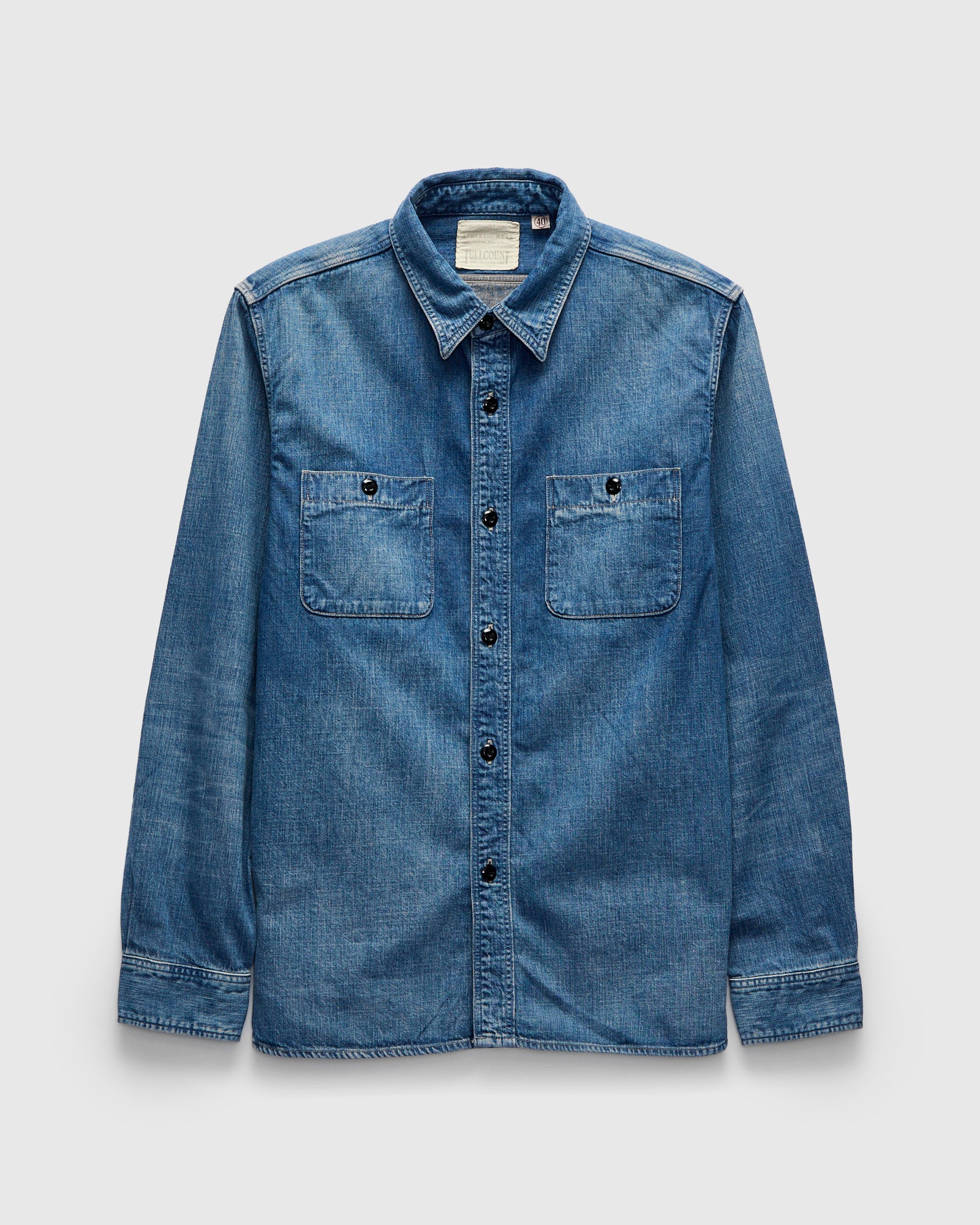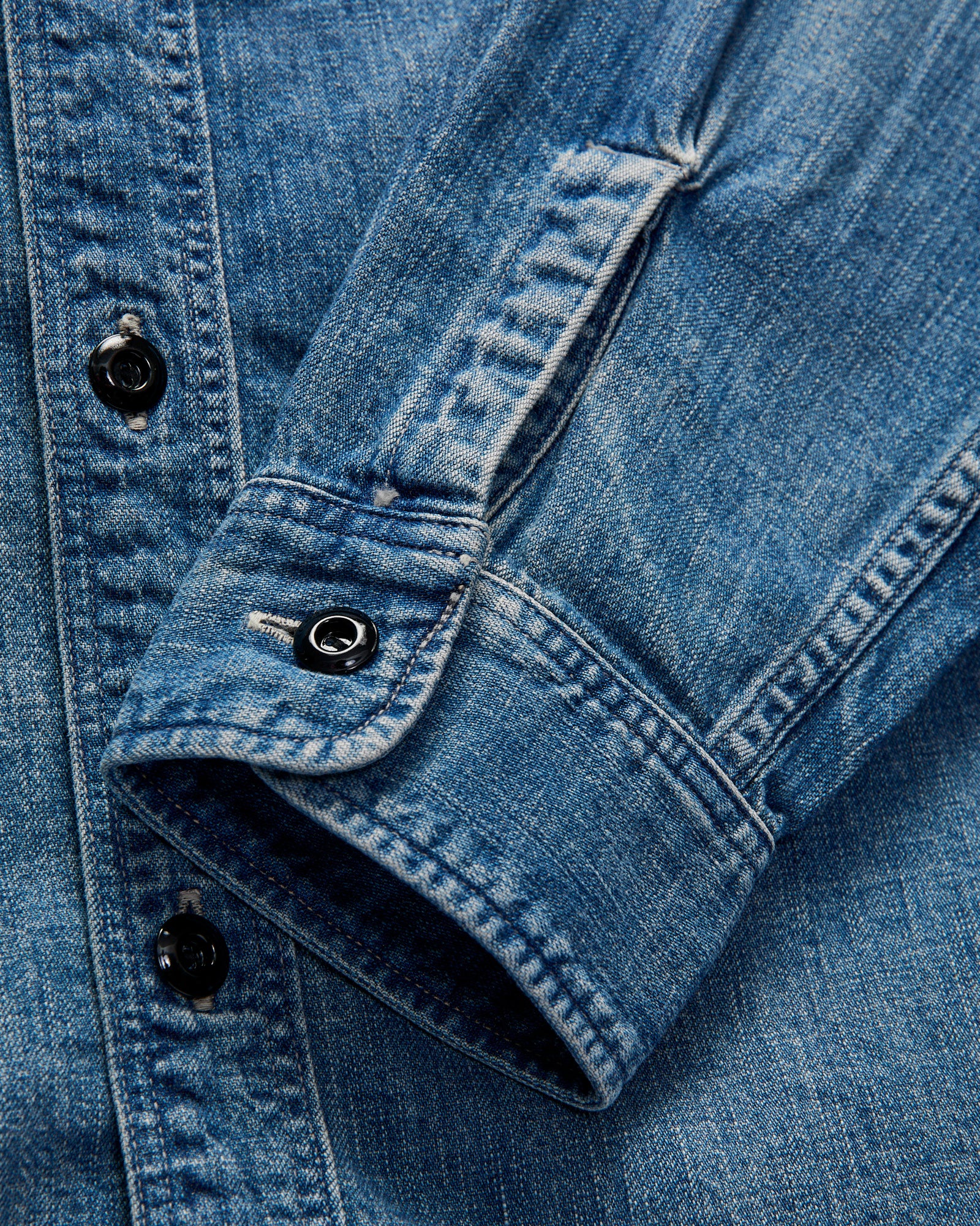 • Fullcount's Denim Work shirt is crafted from a Zimbabwe cotton selvedge denim fabric. The HW "Hand Wash" features a distress and wash treatment resembling natural wear and patina patterns. Modeled after 1940s shirting, this work shirt is equipped with large patch pockets at the chest, period-correct buttons, and flat felled seams.