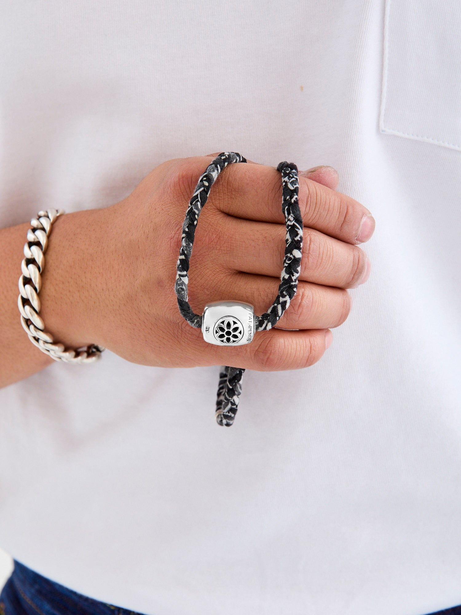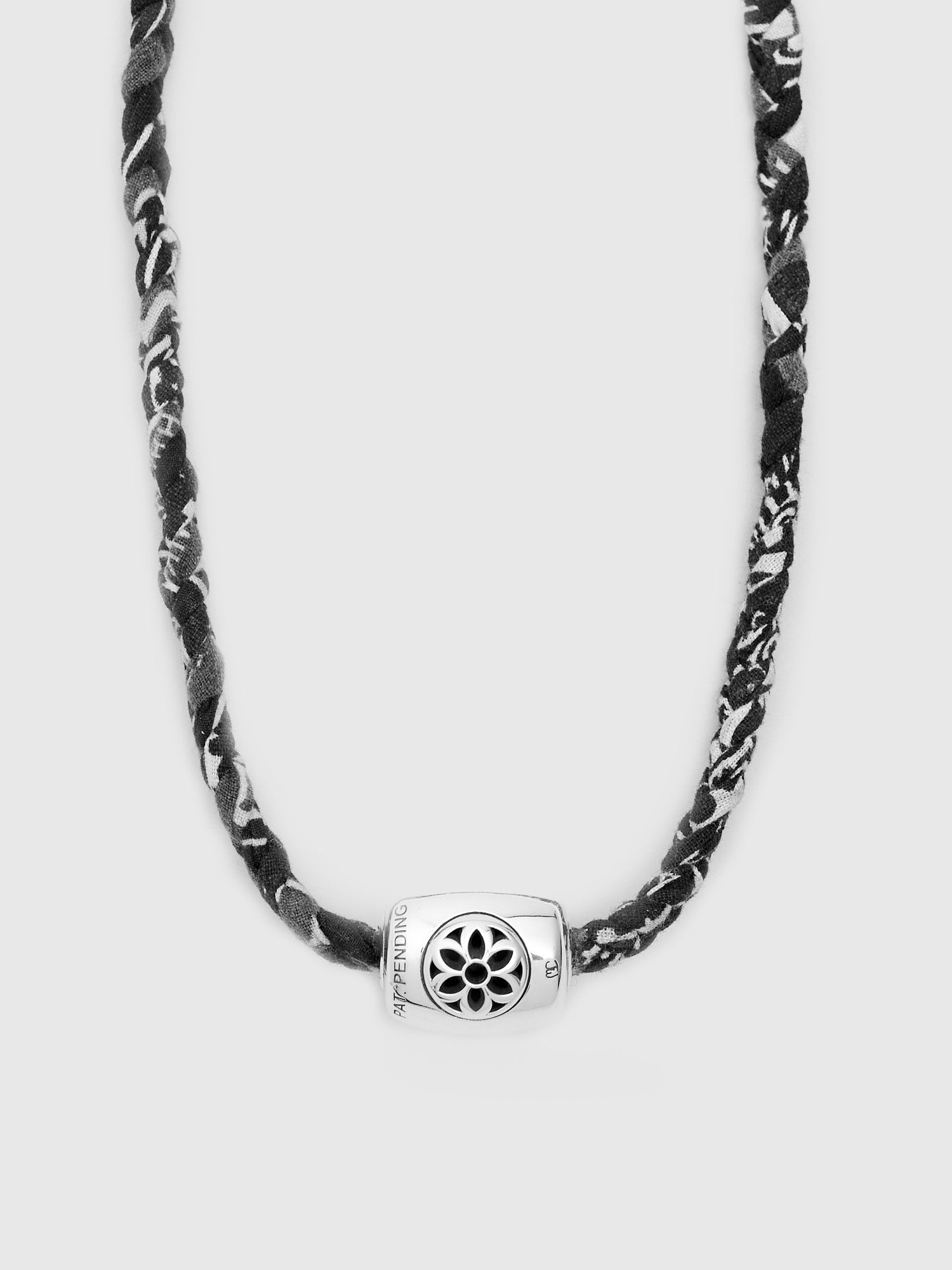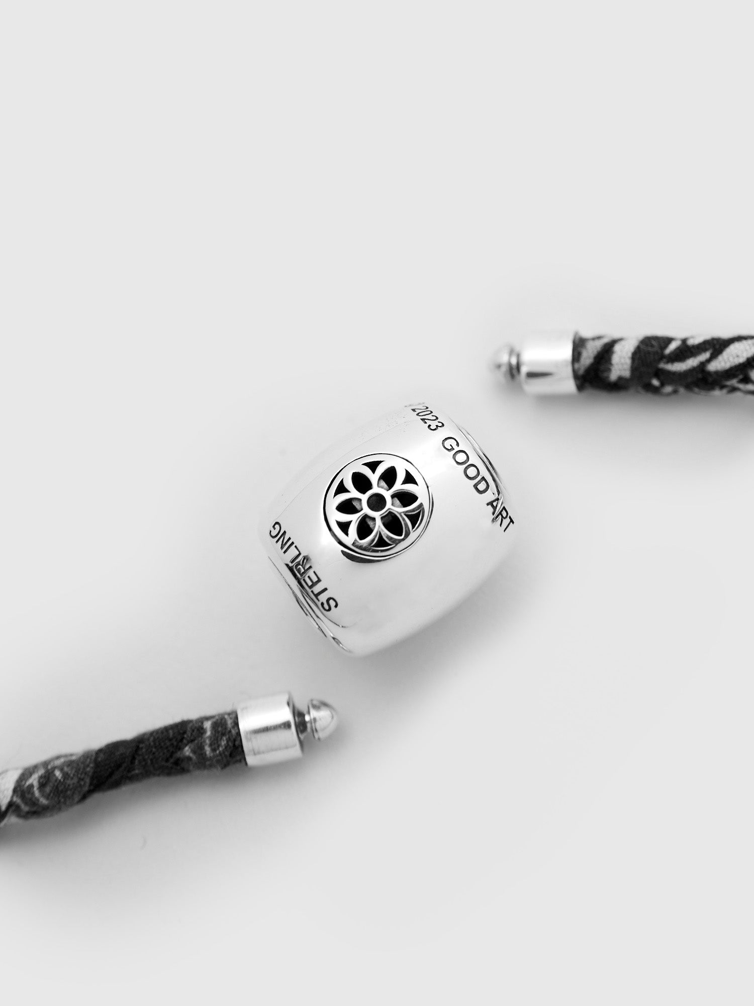 • Rooted in Hawaiian history and popularized by surf culture, Good Art brings their interpretation of the iconic seaside necklace. This iteration features Good Art's signature rosette motif; the rosette has been with Good Art HLYWD since even before the brand's onset, when founder Josh Warner began drawing the floral motif after being inspired by iconography found on tombstones in the United Kingdom. The Necklace comes attached with a 21" black vintage Bandanna cord with a pop socket function for the Pooka clasp