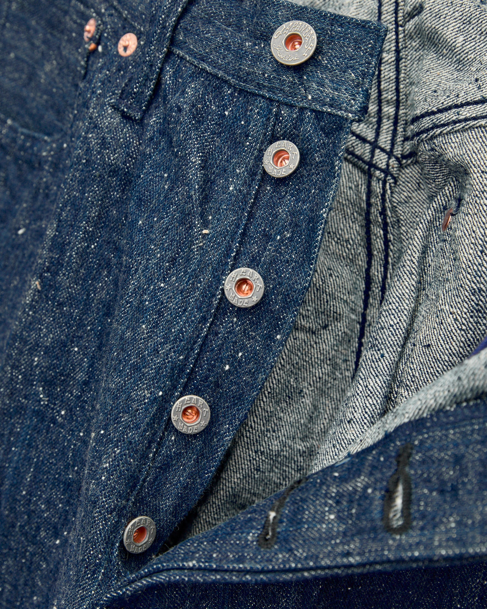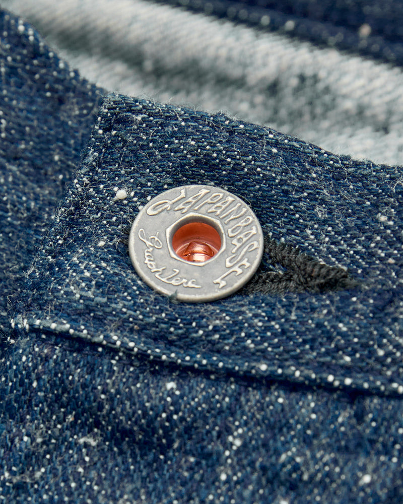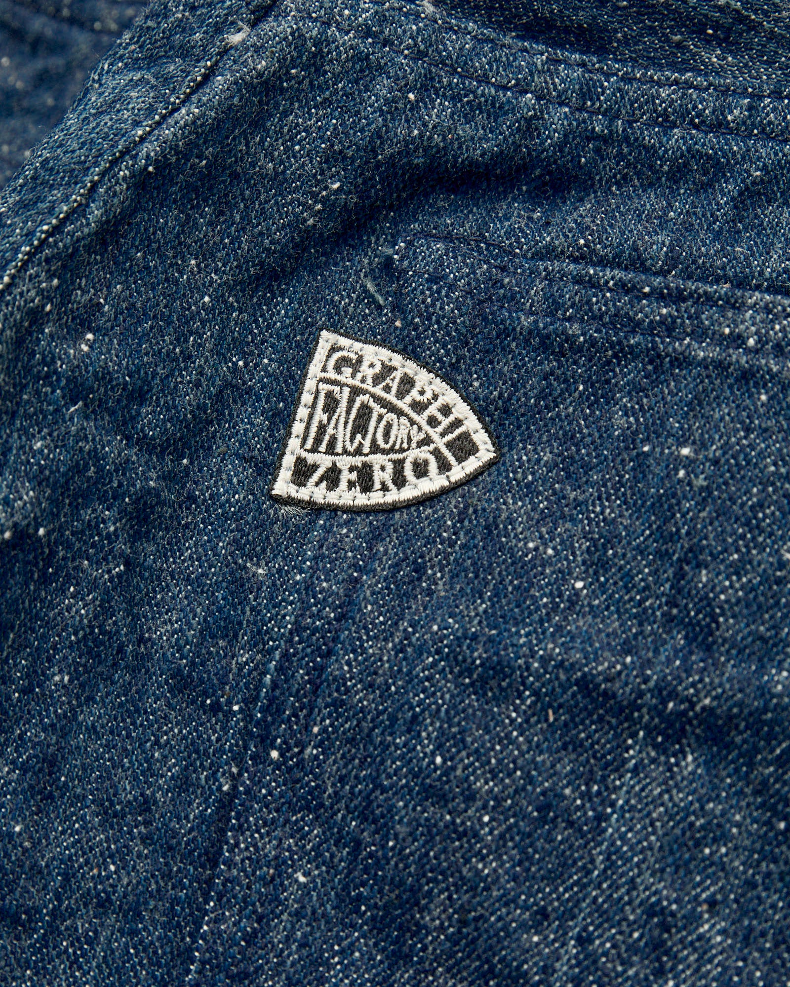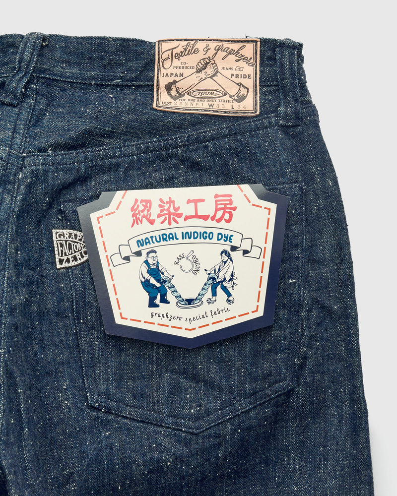 • Graph Zero’s 13oz nep selvedge denim is woven with irregular nep yarns at both the warp and weft, creating an uneven, bumpy surface texture with a pronounced vertical slub. The Aizome denim features natural indigo rope-dyed warp yarns, producing varied shades of blue throughout the fabric. Each pair is finished with custom hardware and signature Graph Zero detailing designed to age and evolve with wear.