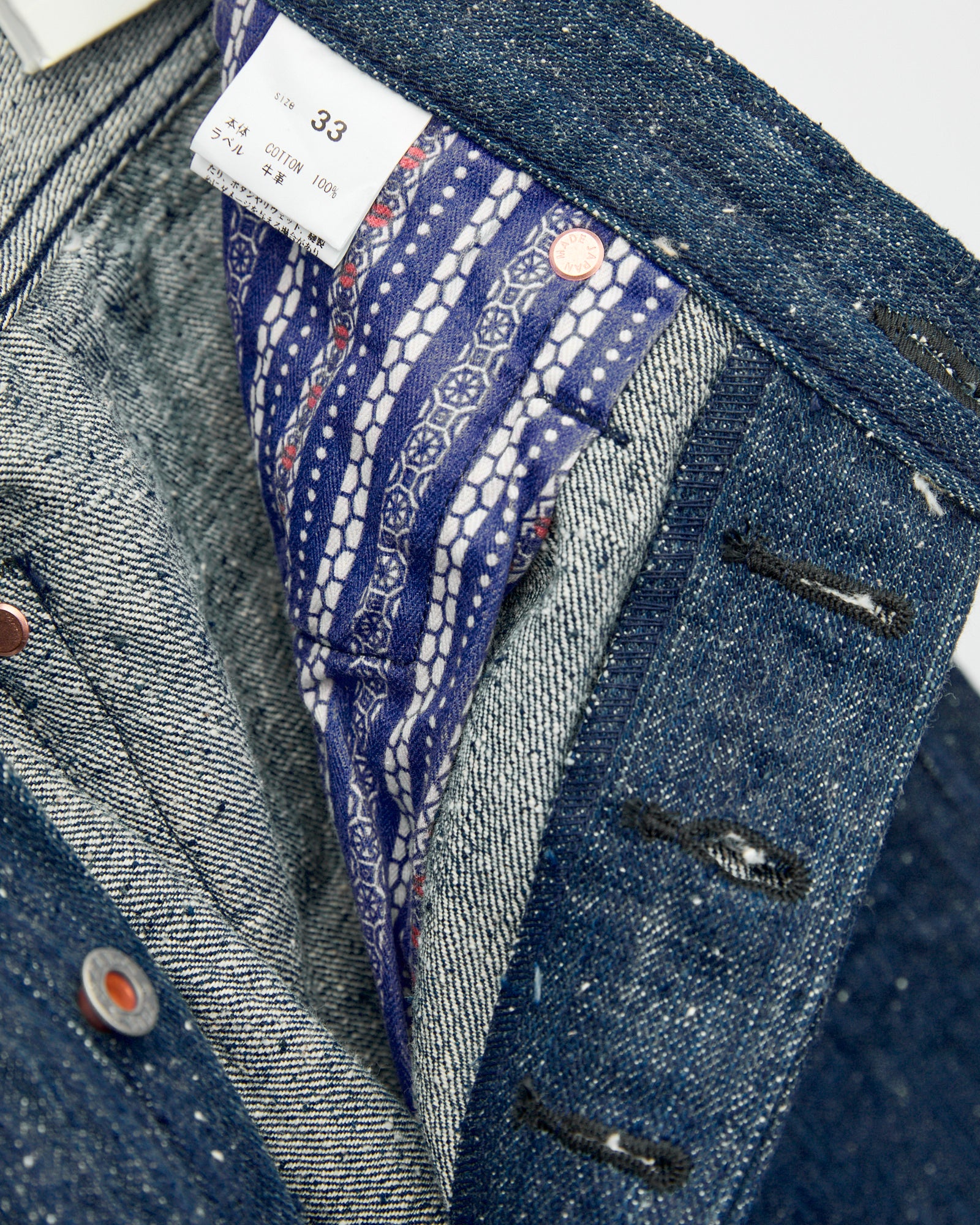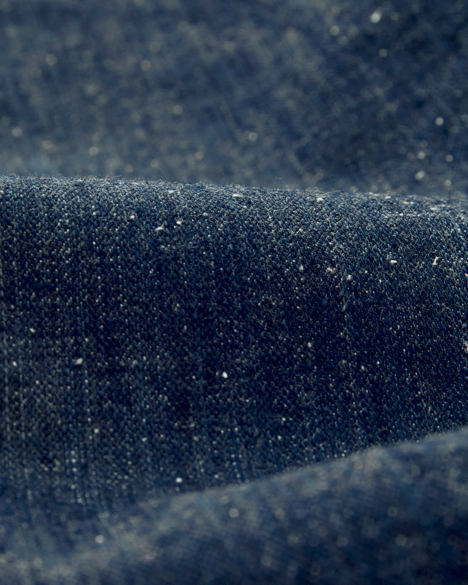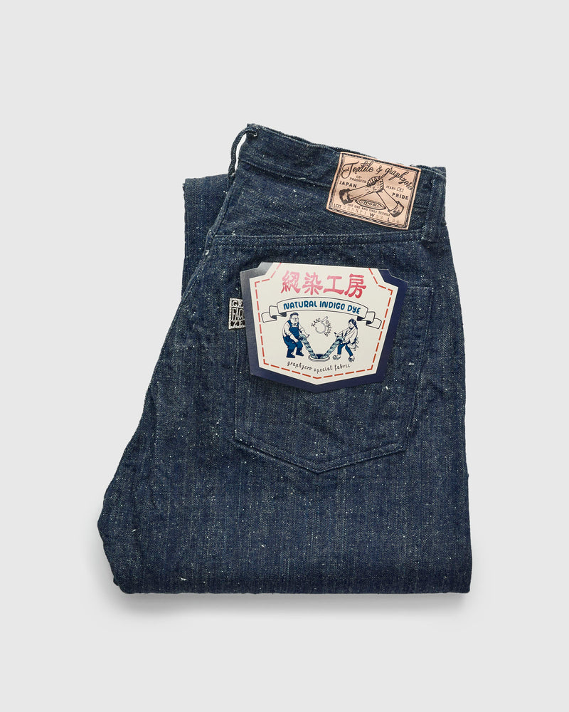 • Graph Zero’s 13oz nep selvedge denim is woven with irregular nep yarns at both the warp and weft, creating an uneven, bumpy surface texture with a pronounced vertical slub. The Aizome denim features natural indigo rope-dyed warp yarns, producing varied shades of blue throughout the fabric. Each pair is finished with custom hardware and signature Graph Zero detailing designed to age and evolve with wear.