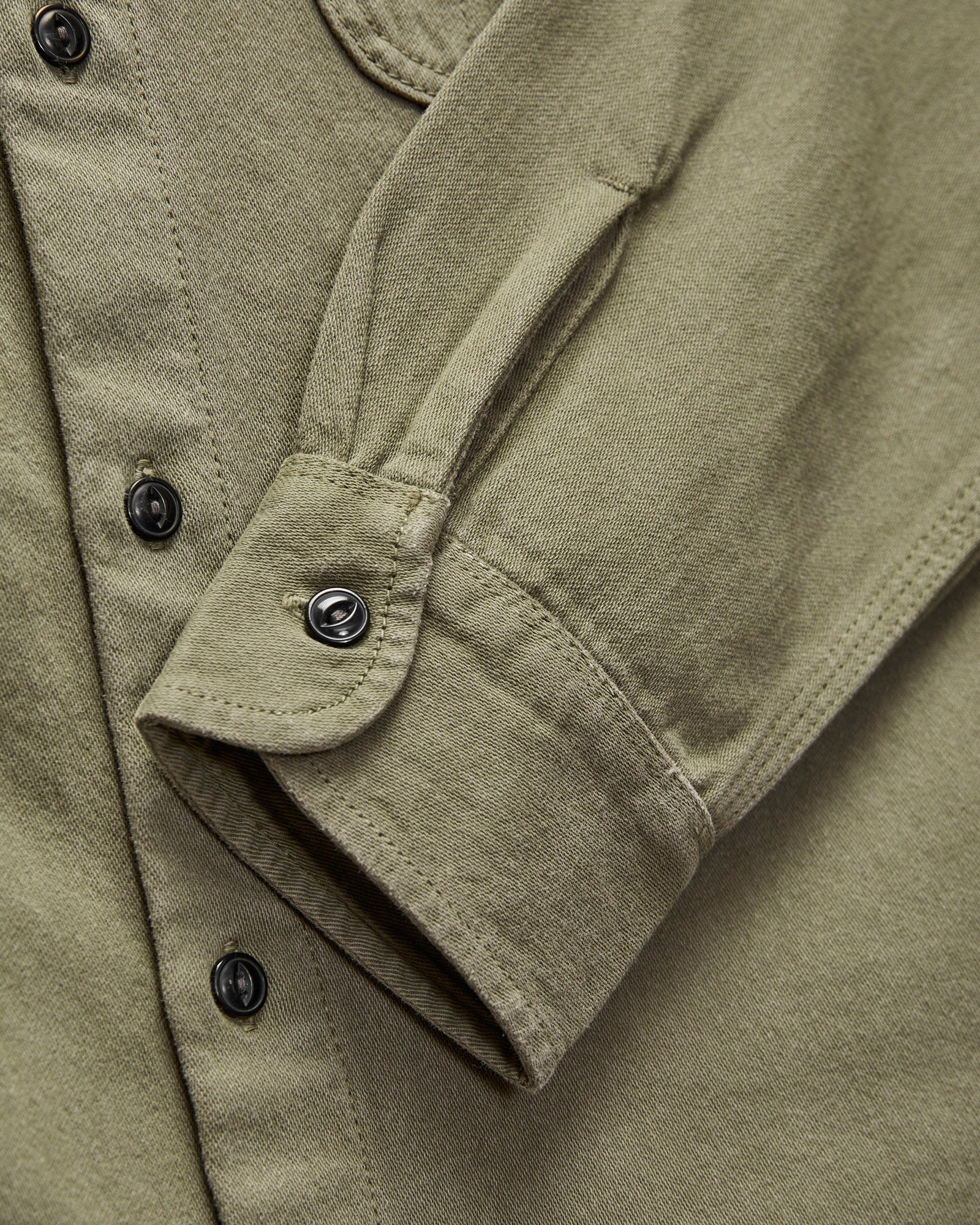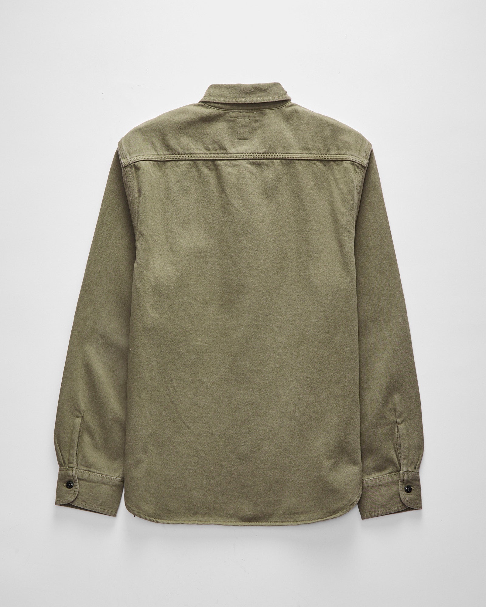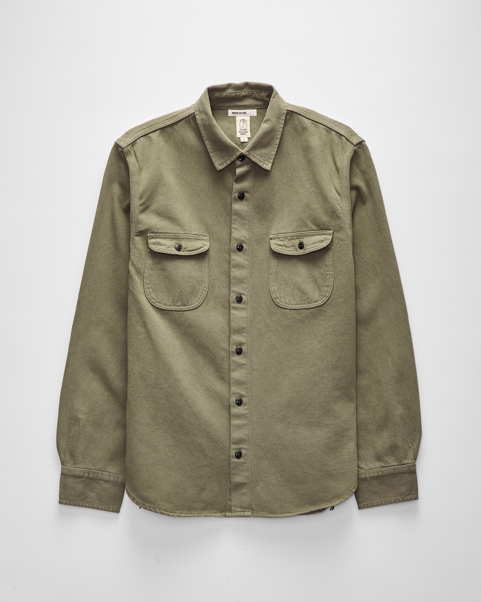 • Hiroshi Kato's Brace shirt is a rugged workshirt sewn from a garment-dyed 13oz back sateen fabric. Cut in a regular fit, the shirt features two flap pockets at the chest, triple stitched shoulders, and chain-stitched side seams.