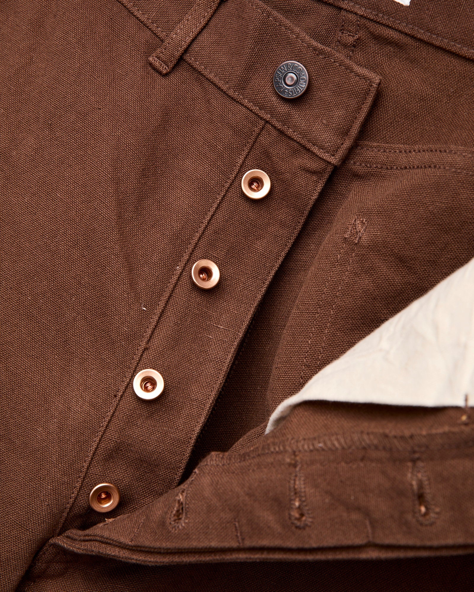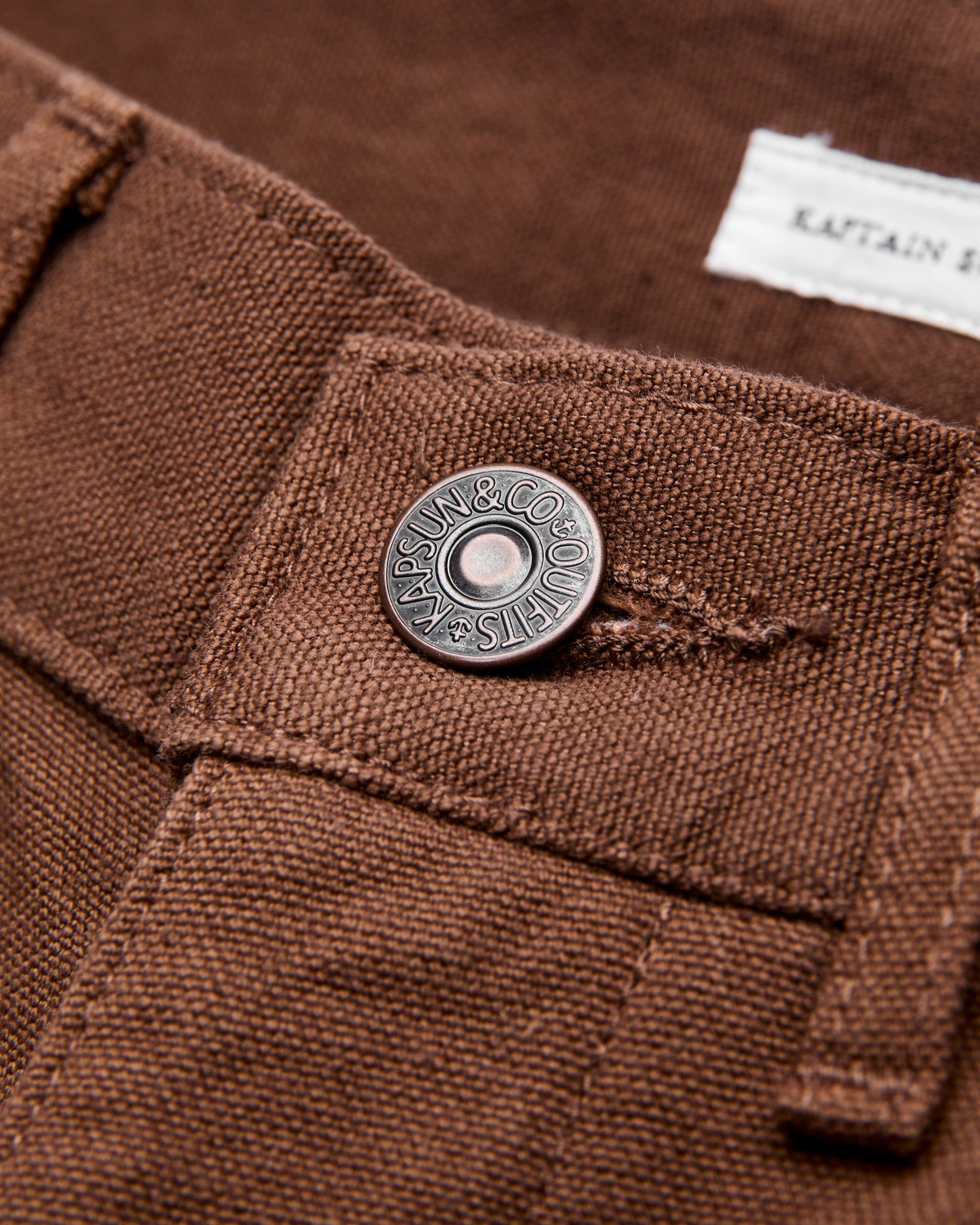 • Kaptain Sunshine's Painter Pants are crafted from a heavyweight oxford fabric, densely woven using cotton yarn at the warp and thick hemp at the weft. The result is a hard-wearing fabric with a varied surface texture and breathable weave. Dyed a deep rust-brown using Kakishibu tannins, the pants have undergone a rinse process to bring out the fabrics texture and reduce shrinkage. Fitted with canvas pocket bags, metal button fly, and large patch pockets at the rear.