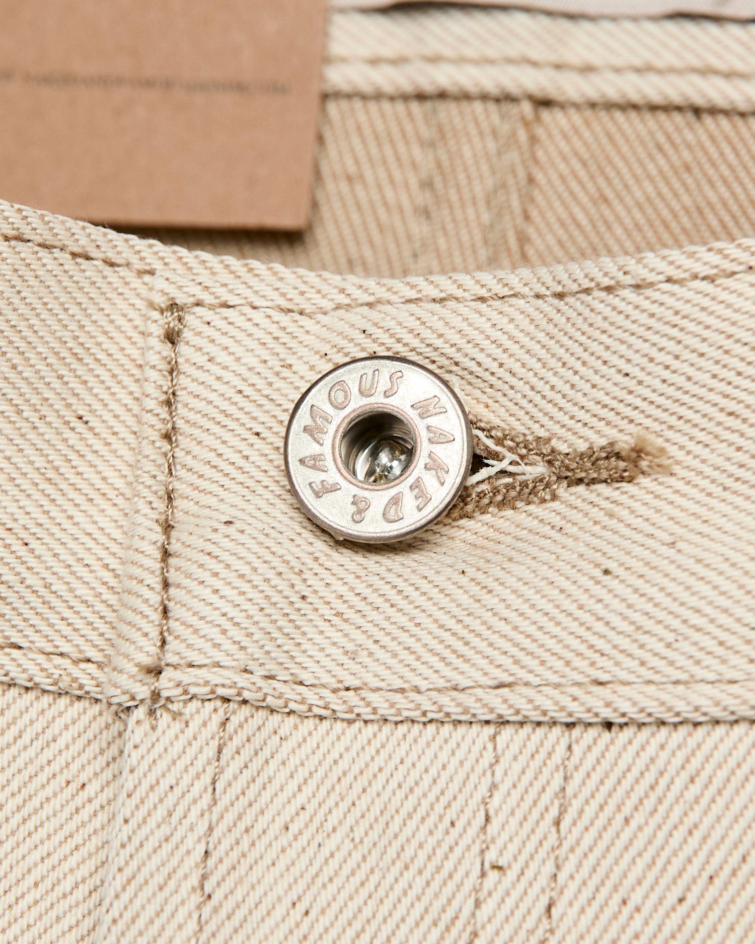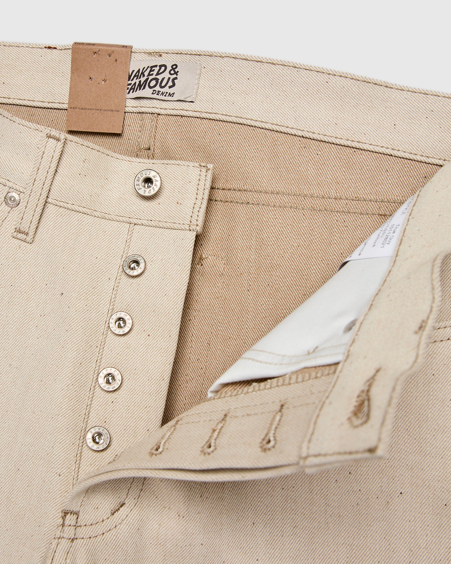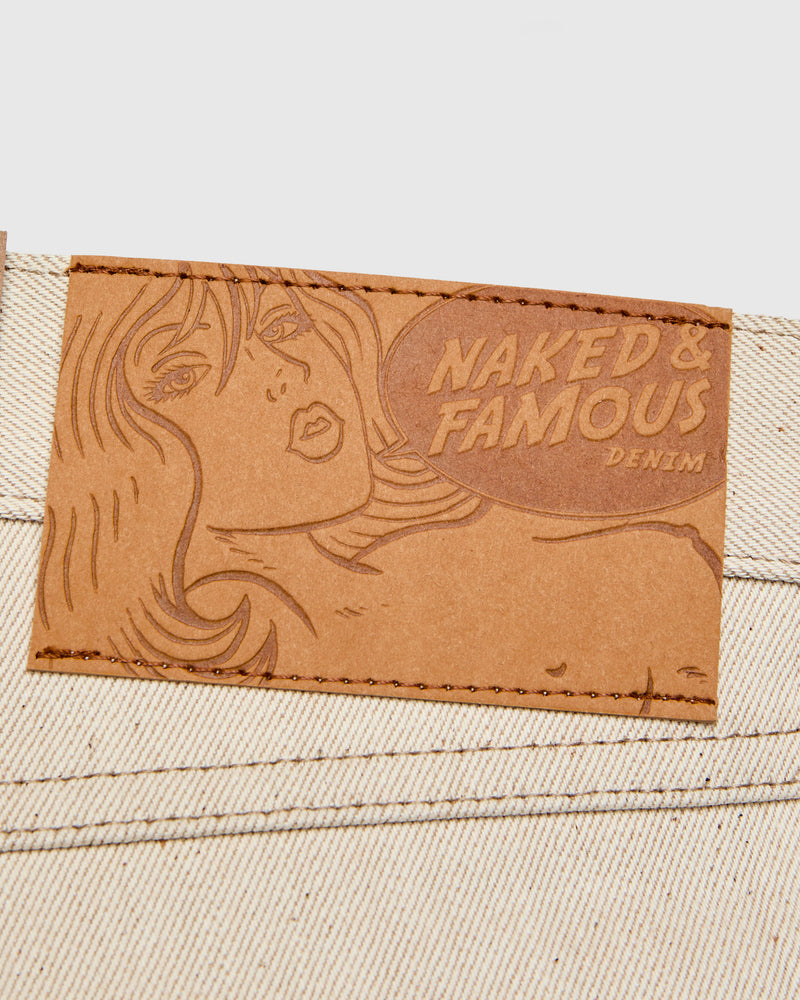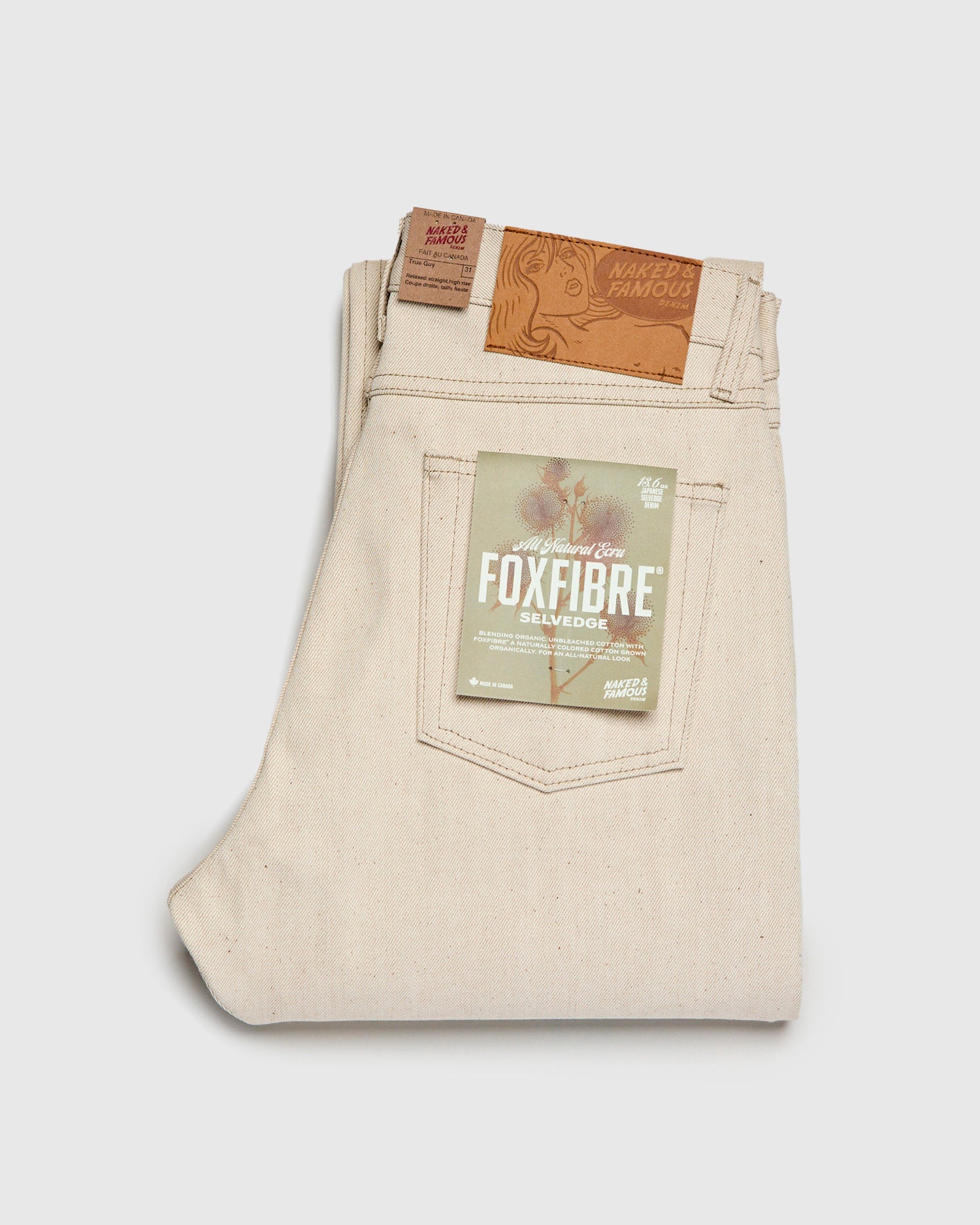 • The All Natural Foxfibre Selvedge Denim from Naked & Famous is made using FoxFibre organic cotton, a natural cotton from Texas which is grown to achieve unique colors naturally. By using Fox Fiber Brown cotton on the weft the denim achieves a warm, earthy tone without the need for any dyeing. Finished with a white selvedge ID, pressed paper patch, and custom Naked & Famous hardware and details.