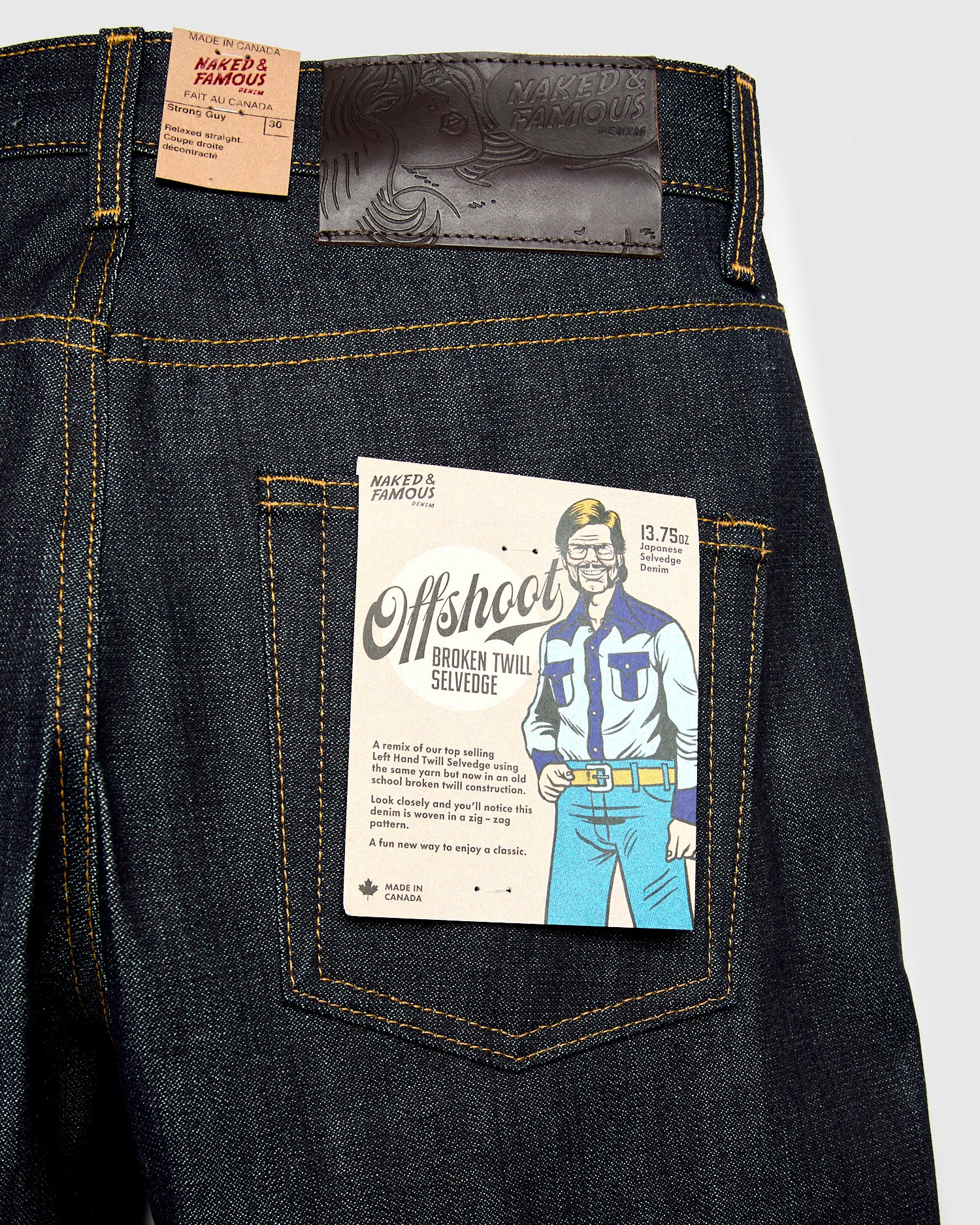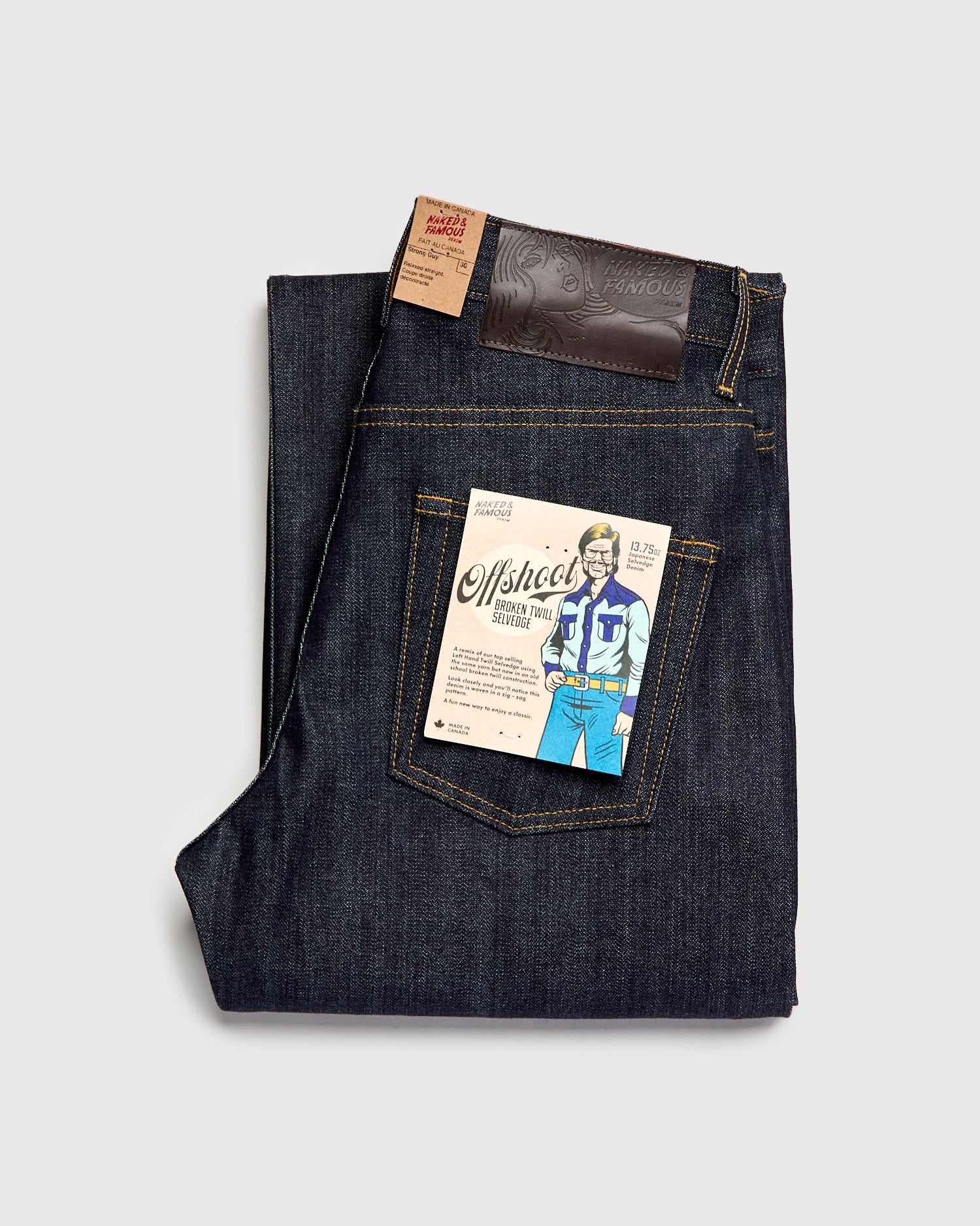 • The Offshoot Broken Twill denim reimagines the brand’s best-selling Left Hand Twill Selvedge Denim by reworking the warp and weft yarn into a broken twill weave, providing a zig zag texture across the surface of the jeans. Broken twill denim has a smoother surface texture due to a lack of traditional diagonal twill lines, making for a jean with no leg twist. The jeans are presented in a classic indigo color, at a comfortable 13.75oz weight for year-round wear.⁠ Equipped with custom Naked & Famous hardware and details.