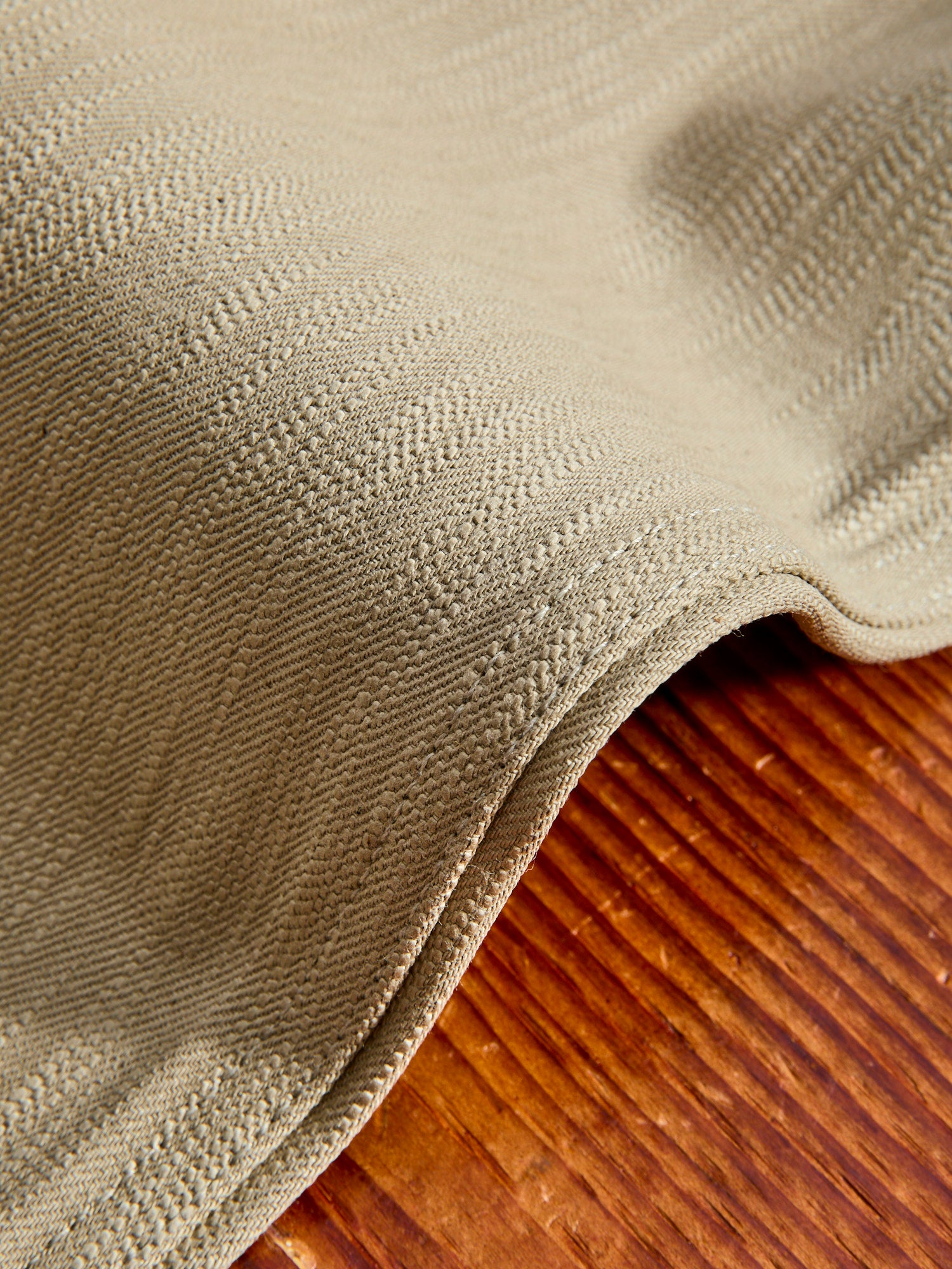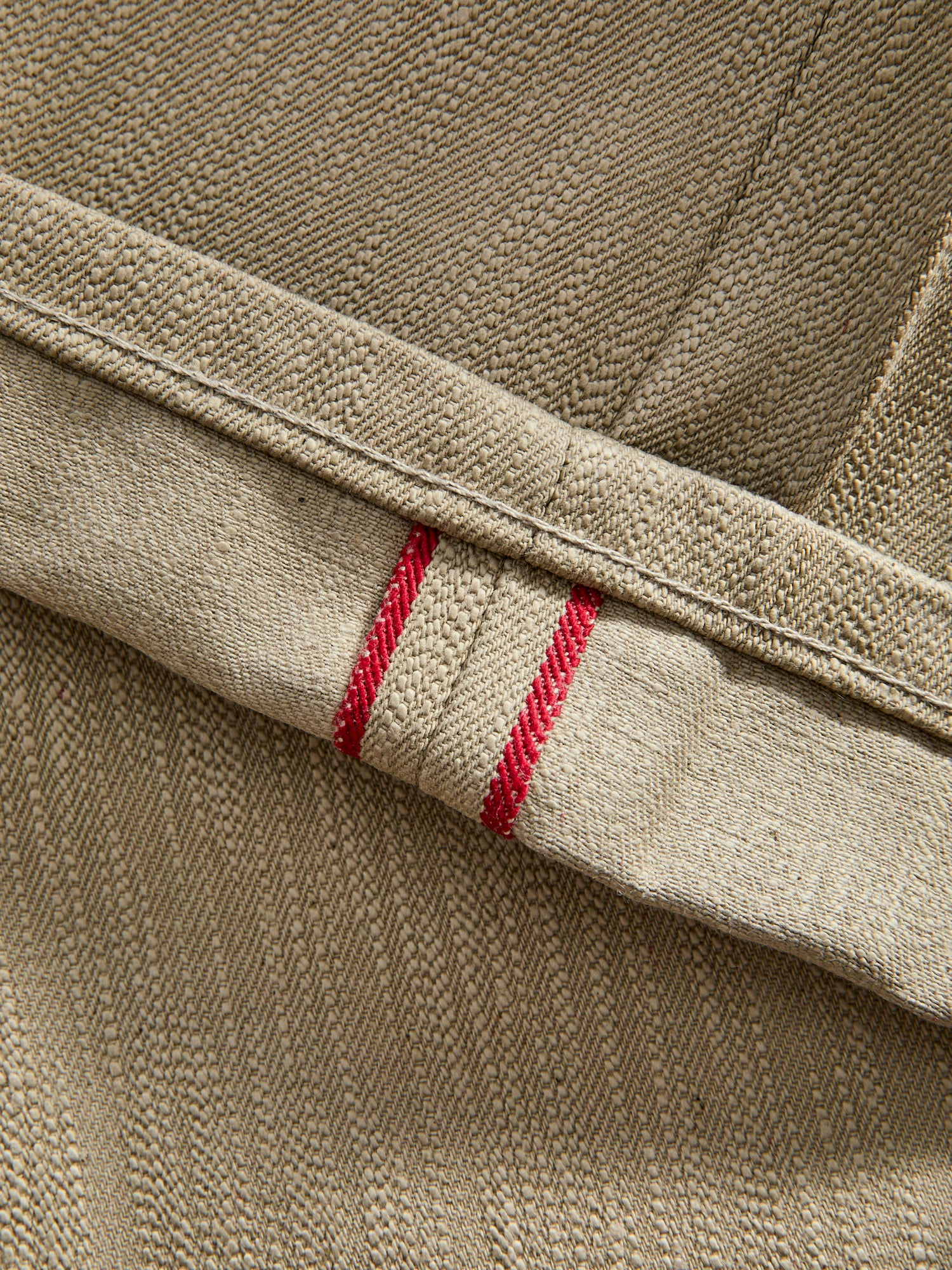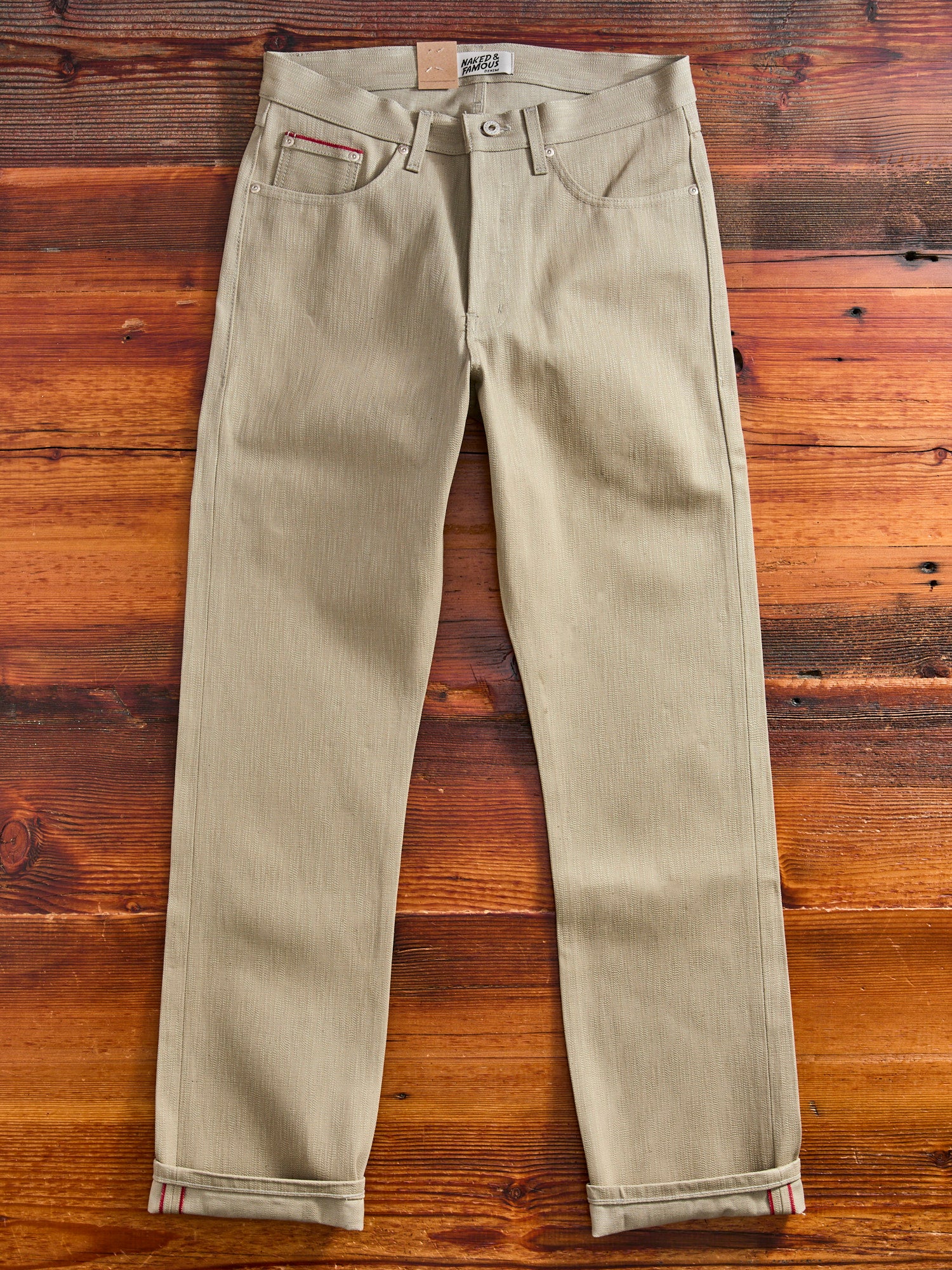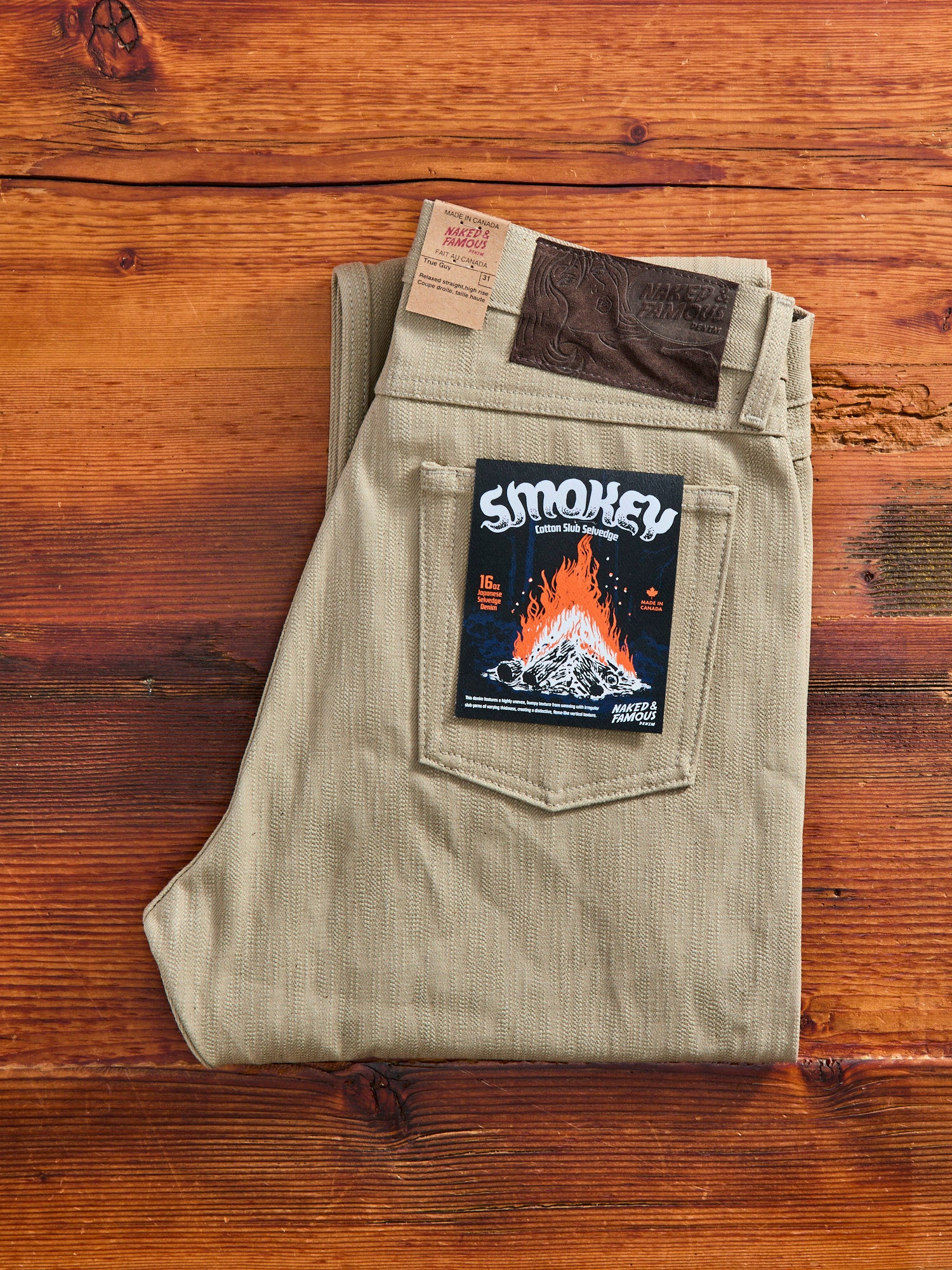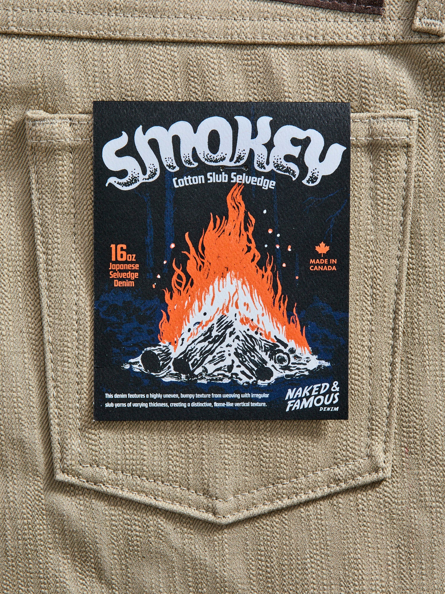 • The "Smokey Cotton Slub" fabric from Naked & Famous is Japanese Selvedge denim dyed to a warm earthtone for a unique alternative to your standard indigo denim. Woven on vintage shuttle looms using irregular slub yarns, this denim sports a textured hand-woven appearance and heavyweight characteristics. Sanforized to remove shrinkage, the jeans maintain a rigid feel that will yield a soft touch after break in. Cut, sewn and built in North America, the jeans are fitted with tonal stitching, red selvedge ID, brown suede leather patch, and custom silver metallic buttons and rivets.