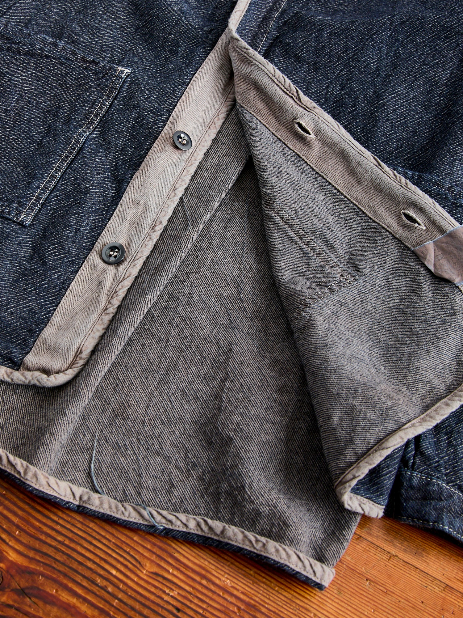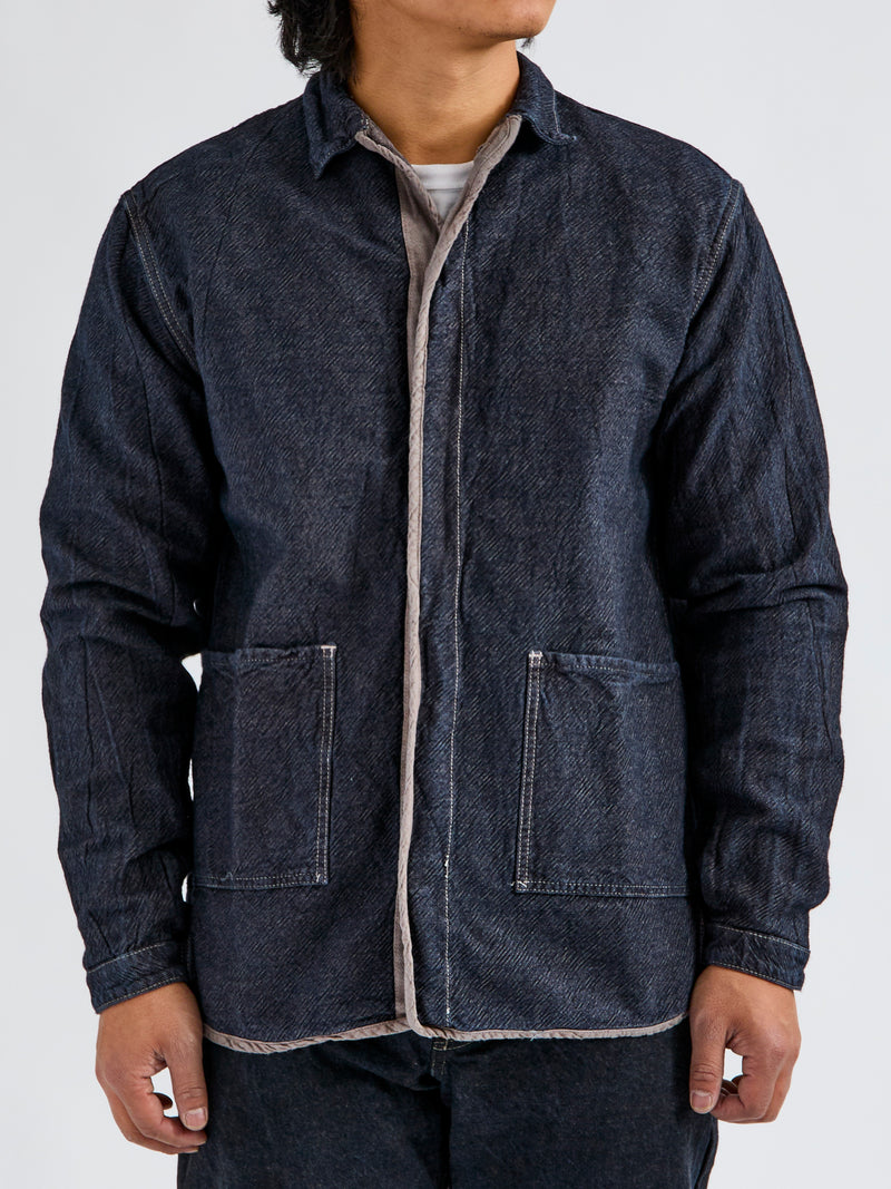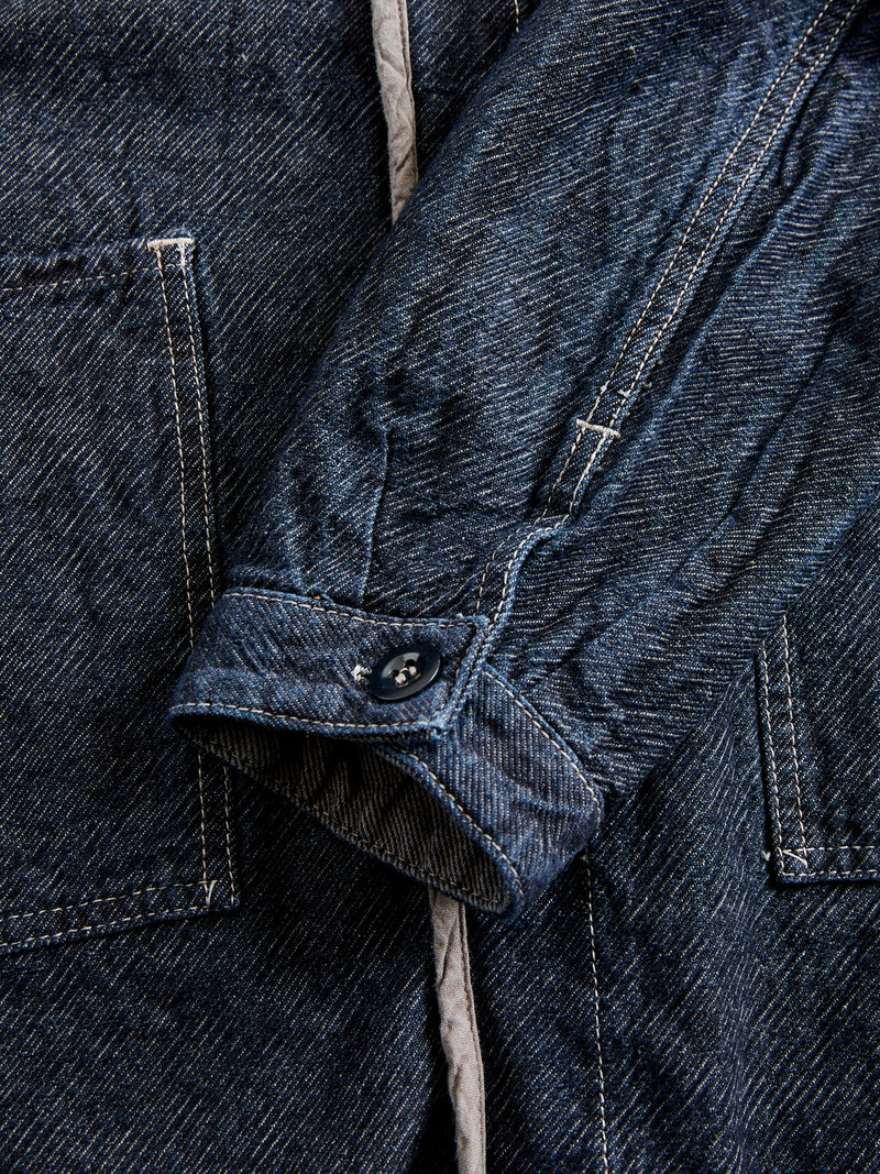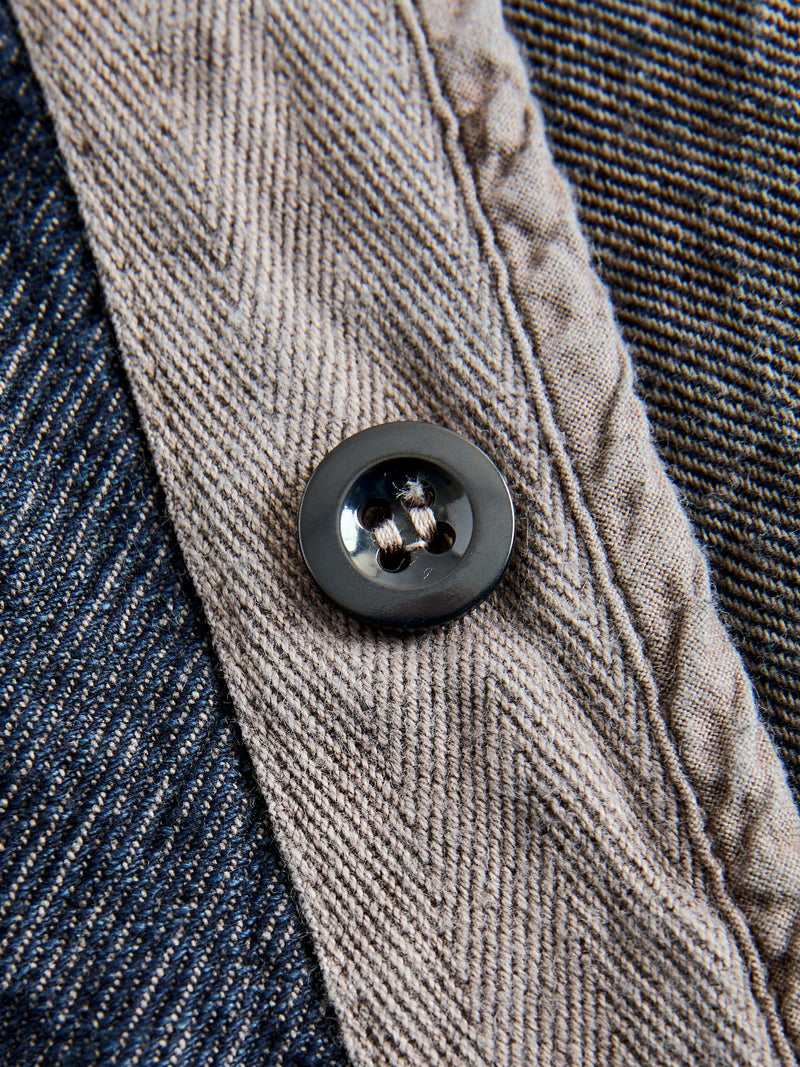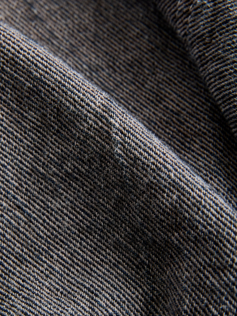 • Tender's 464 shirt is a long sleeved shirt made from a 10oz cross weave denim fabric. While traditional denim features an indigo warp and ecru weft, Tender's Cross Weave fabric reverses this - using an unbleached cotton warp and Japenese indigo-dyed weft. Extra weft yarns are also stuffed into the weave, resulting in a deep color with a very textured surface. This iteration is overdyed using natural dyes, receiving its color from a wattle bark bath that has been "saddened", or darkened, with iron. The shirt is cut in a relaxed fit from three large panels with patch pockets at the front.