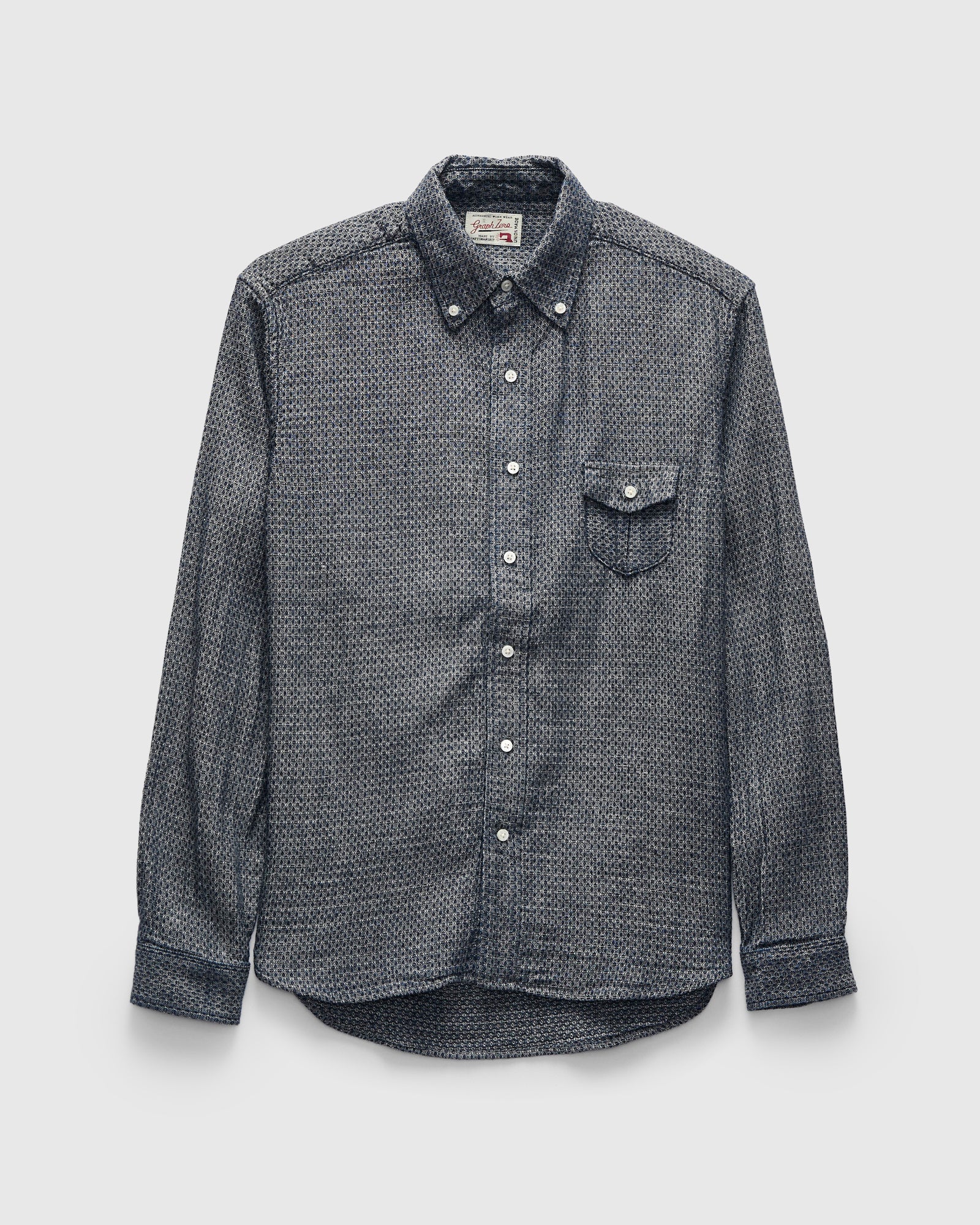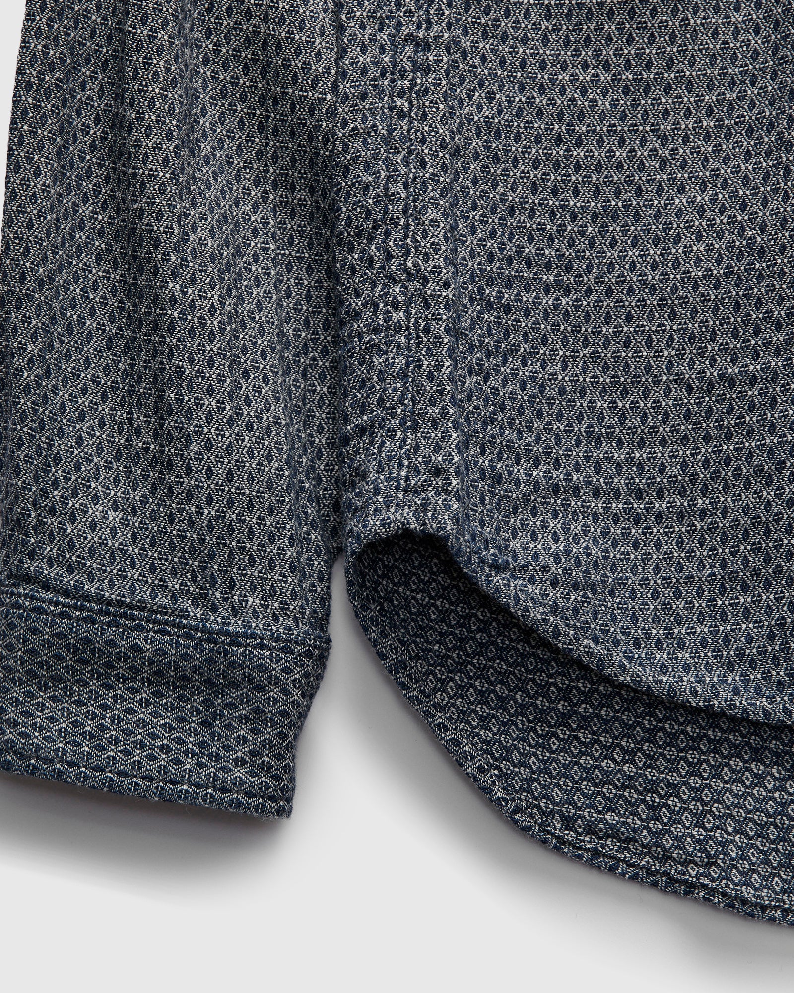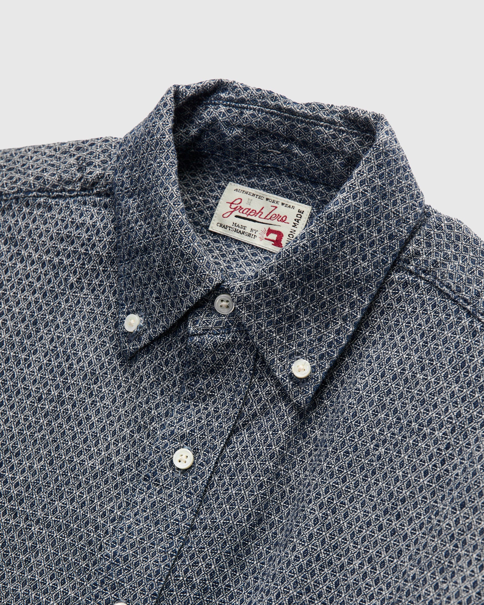 • Crafted from a custom sashiko jacquard fabric, Graph Zero's Standard Button-Down pulls inspiration from 1940s shirting. The shirt is woven using rope-dyed indigo yarn in a diamond stitch pattern. With wear, the fabric will fade and transform over time. Finished with a pocket at the chest and natural shell buttons throughout.