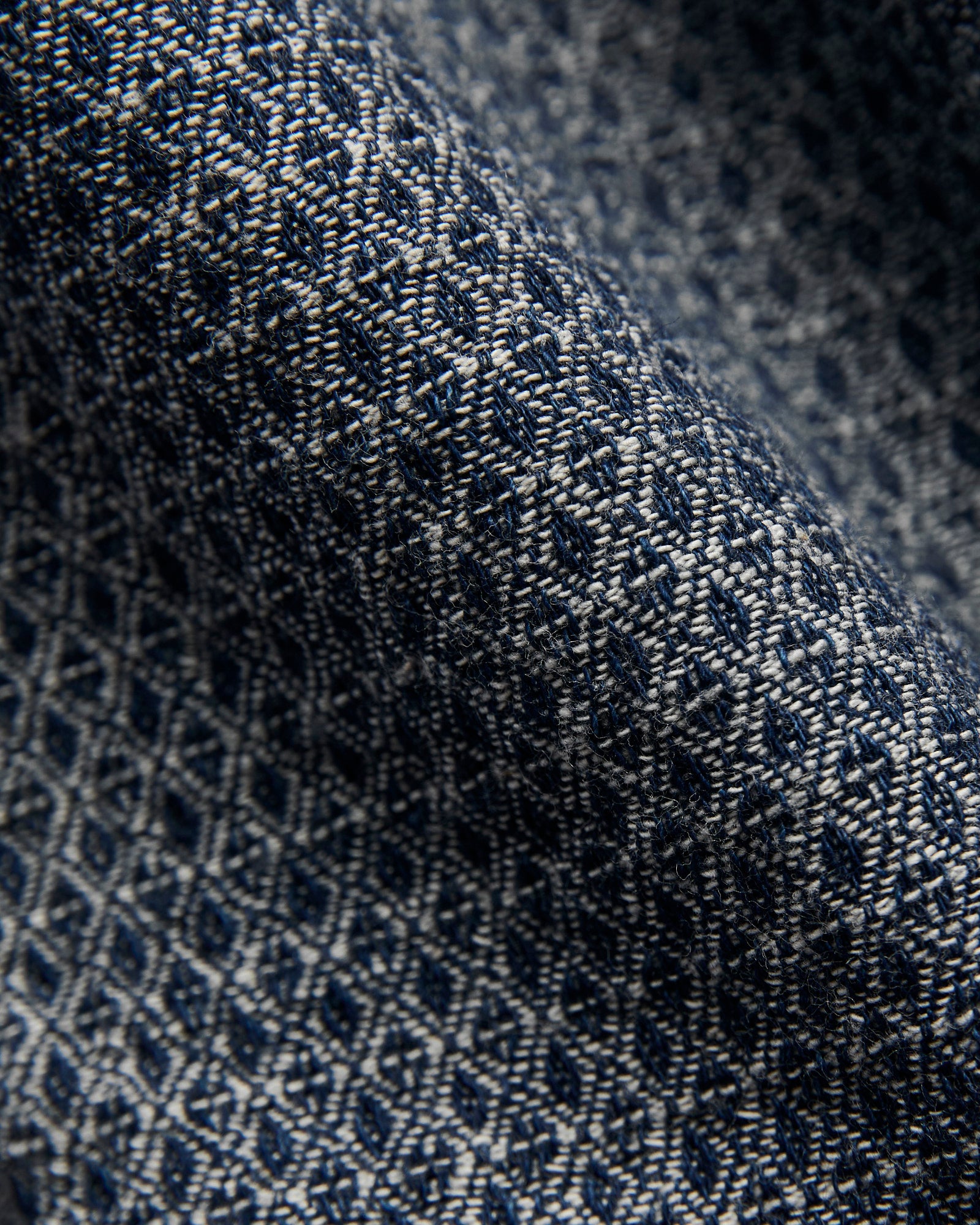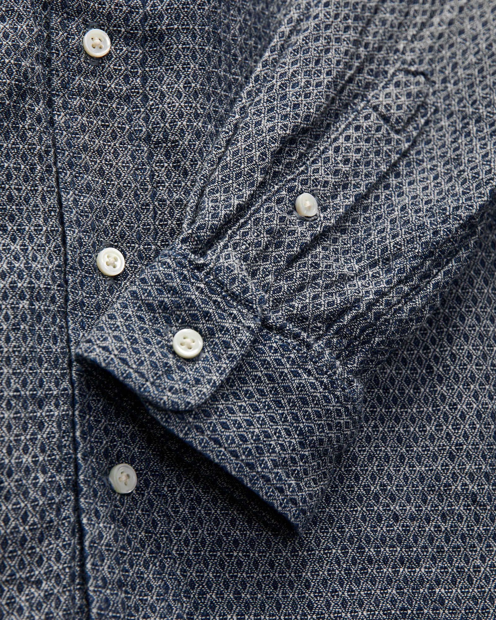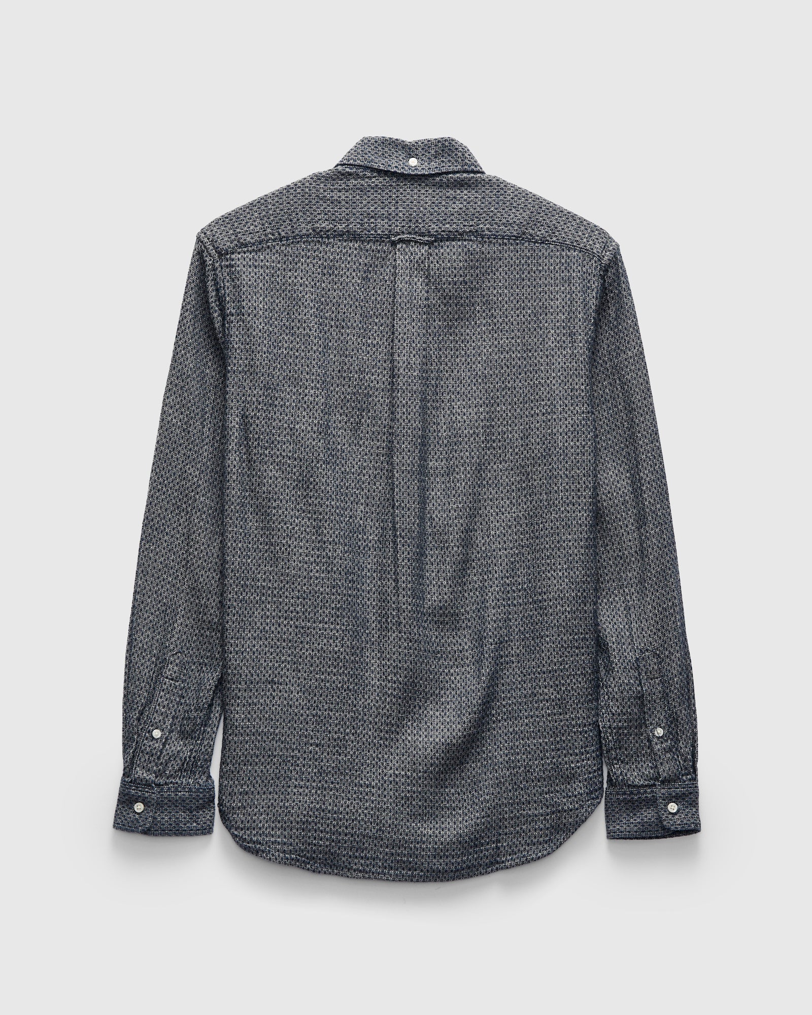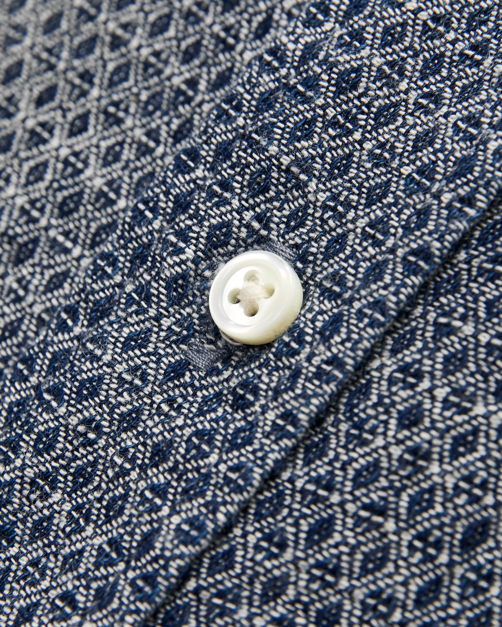 • Crafted from a custom sashiko jacquard fabric, Graph Zero's Standard Button-Down pulls inspiration from 1940s shirting. The shirt is woven using rope-dyed indigo yarn in a diamond stitch pattern. With wear, the fabric will fade and transform over time. Finished with a pocket at the chest and natural shell buttons throughout.
