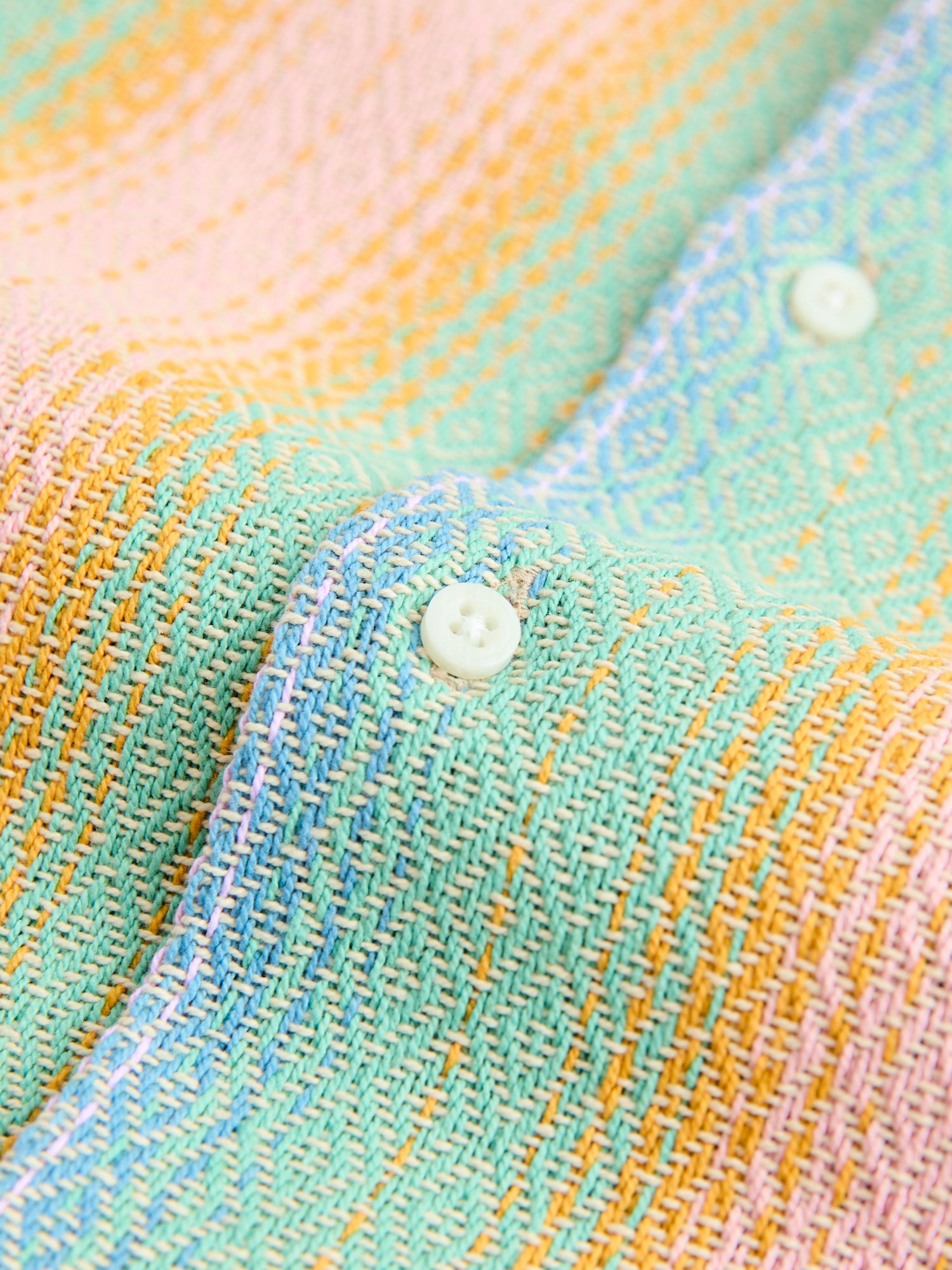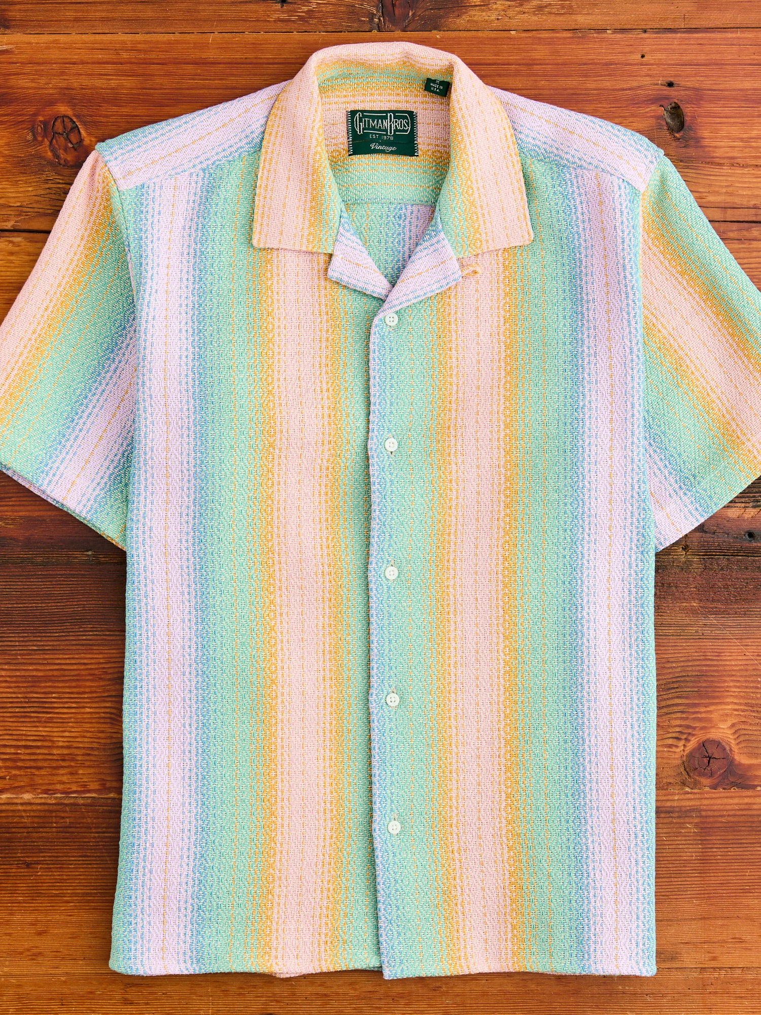 • This camp shirt from Gitman Vintage is made from a unique fabric at their Lafayette, Tennessee factory. This shirt features a cotton jacquard fabric with a playful pastel pattern. Finished with minimal detailing and sewn in the camp shirt style - a relaxed fit, straight hem cut designed for more breathability in warm weather.