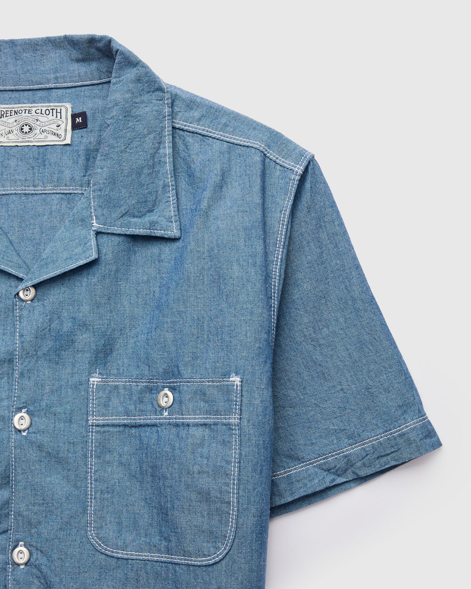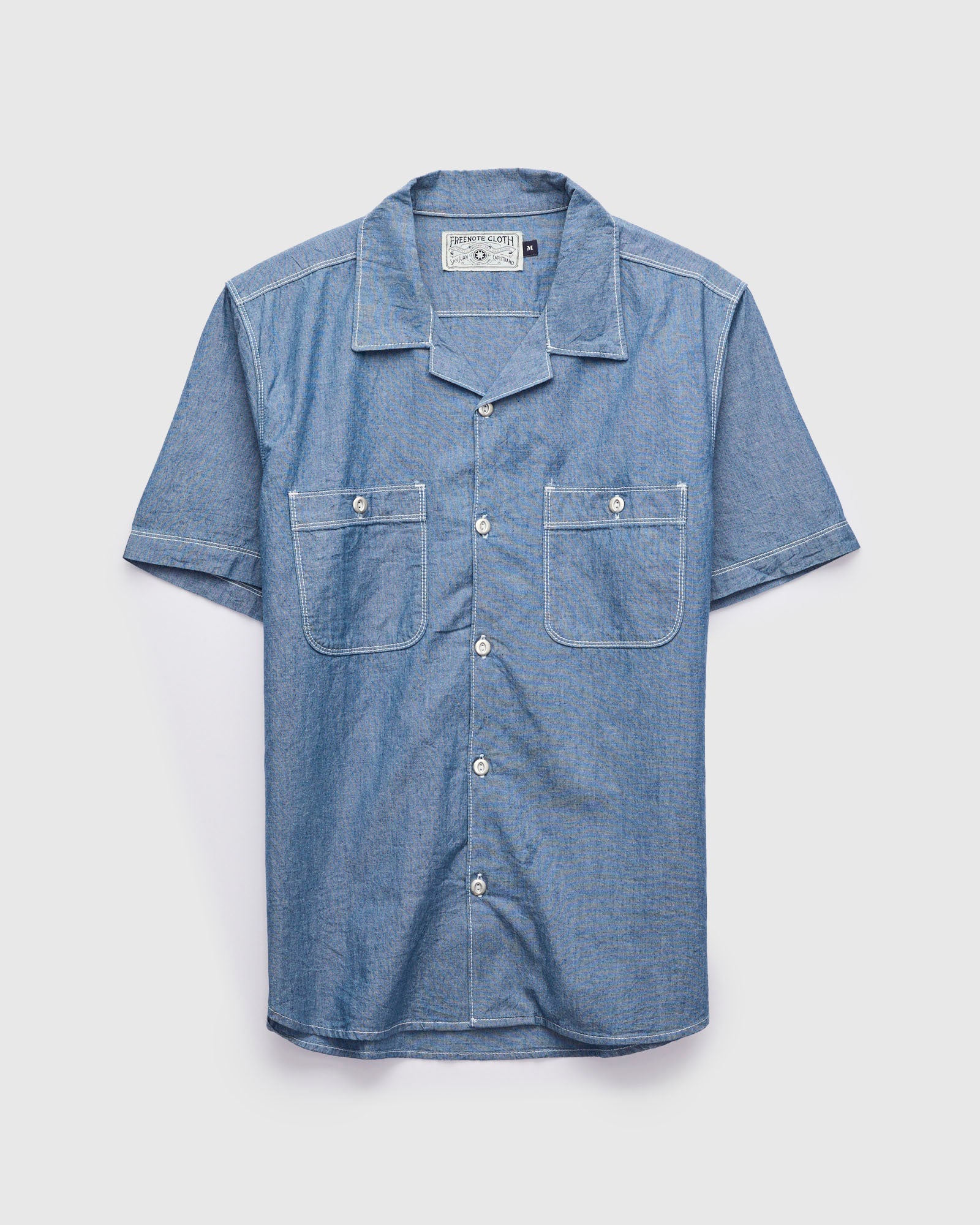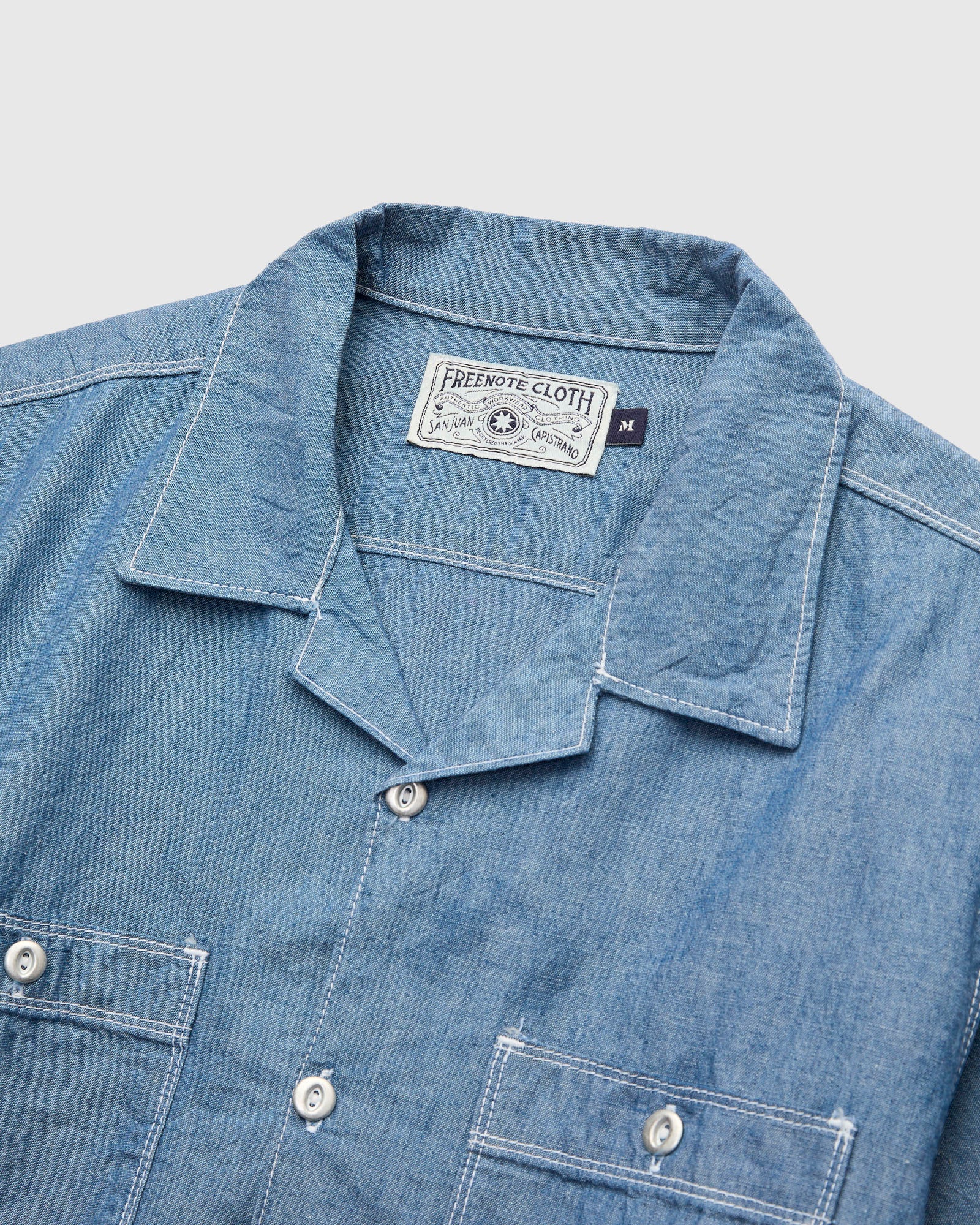 • The Dayton Work Shirt from Freenote is sewn using a indigo chambray fabric from Japan. Inspired by 1950's garage shirting, the Dayton is fitted with an open camp collar and two oversized utility pockets at the chest large enough to store a variety of tools or gadgets. Finished with double needle stitching and custom metal repro buttons from Japan.