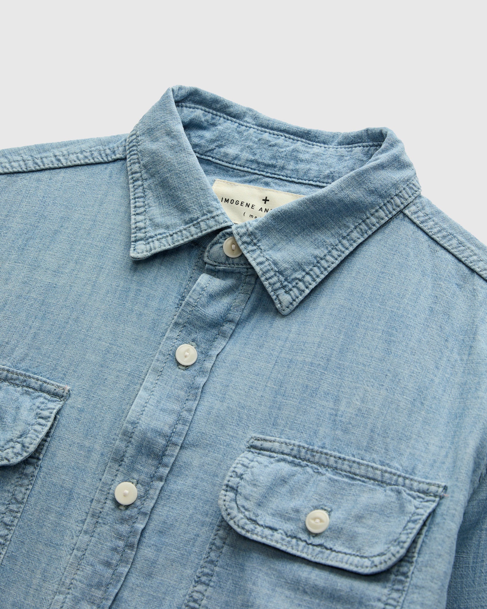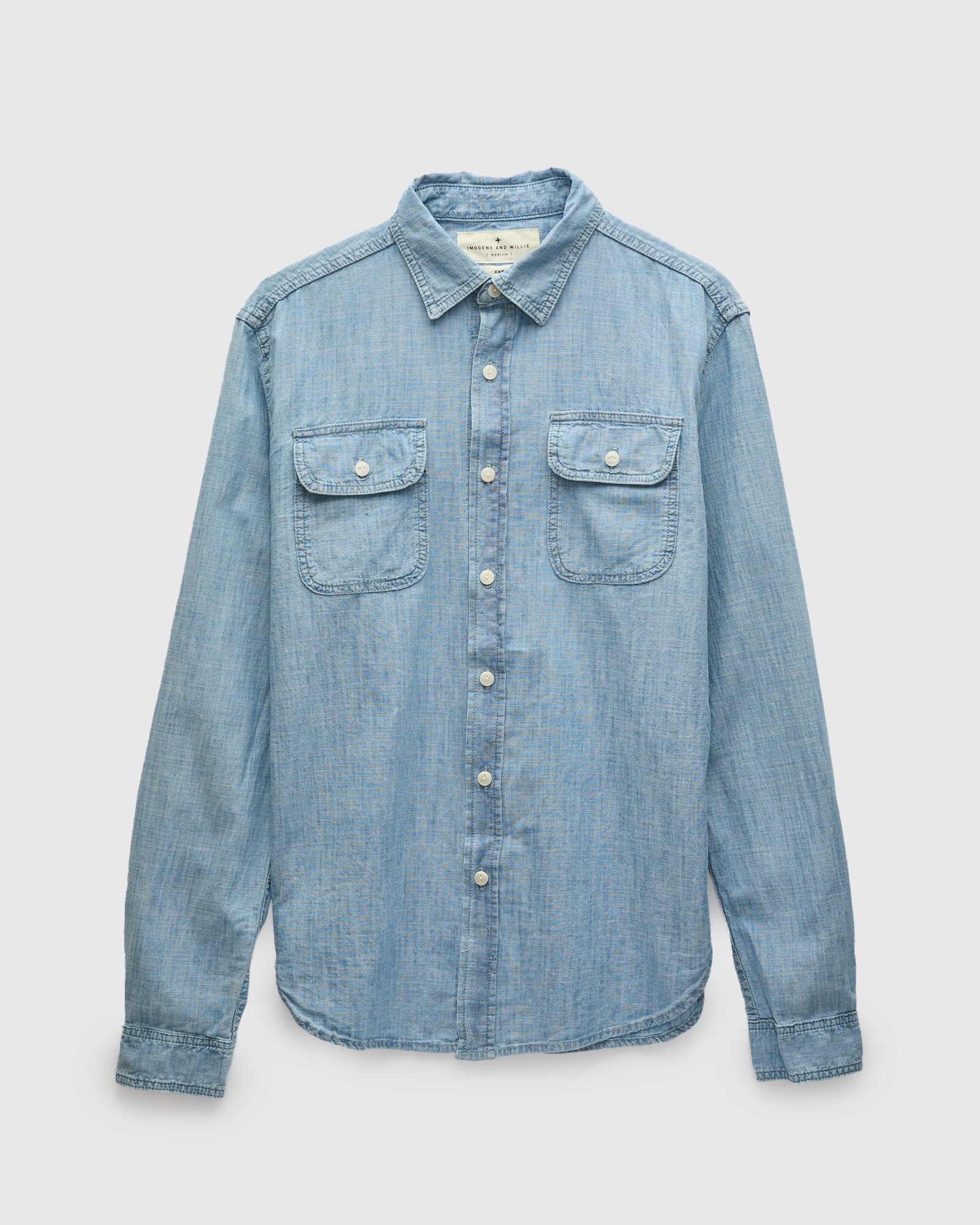 • This wardrobe staple from Imogene + Willie is built using a heavily-washed 5oz cotton chambray fabric from Italy. Designed for warm Summer evenings in Nashville, this shirt offers an ultra-soft and breezy feel thanks to its loosely-woven chambray material. Tailored in classic shape and equipped with two pockets at the chest.