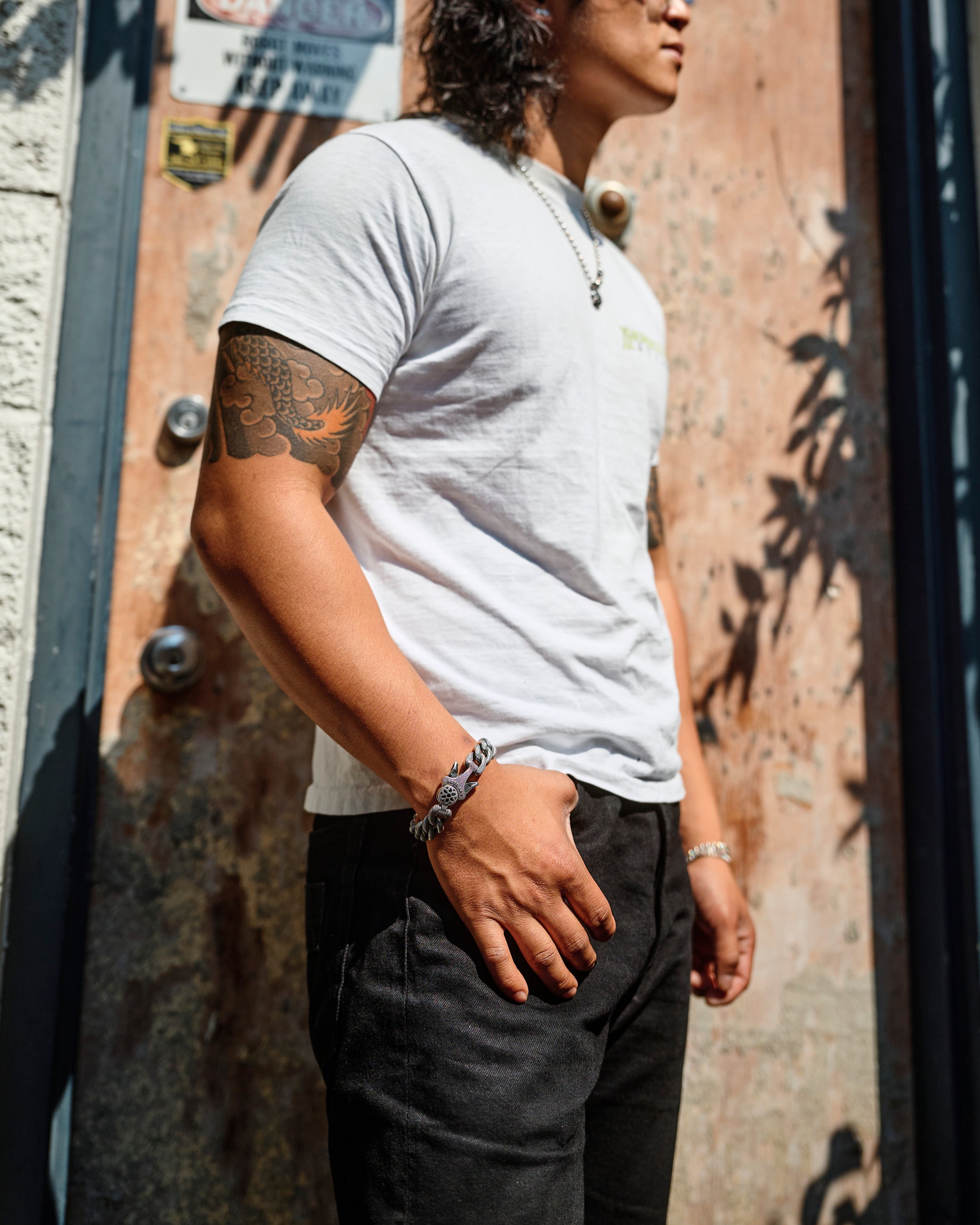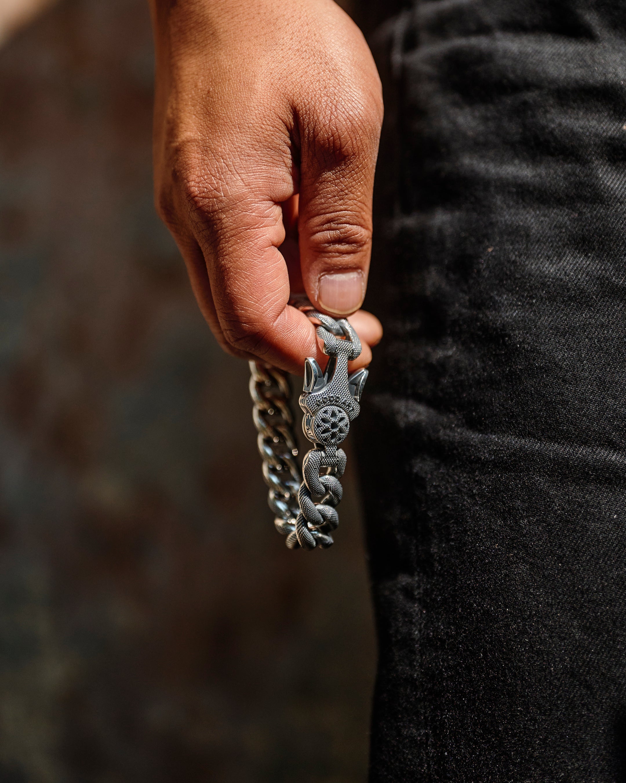 • Good Art's Model 10 curb-chain bracelet is a testament to heavy-duty craftsmanship, forged from solid cast .925 sterling silver. This special edition of the Model 10 chain features the brand's signature Goosebumps treatment, sporting a heavy texture exterior and smooth interior finish embossed with Good Art branding. Individually coupled and welded, the Model 10 chain features a seamless design and substantial weight characteristic of the brand's Model line. The handmade pincer-style closure of the Model 10 is fine-tuned at Good Art's Los Angeles foundry. Decorated with the brand's rosette insignia set on the clasp, each piece undergoes a sulphuric acid and hand-burnishing process, imparting a blackened contrast to the polished sterling silver.