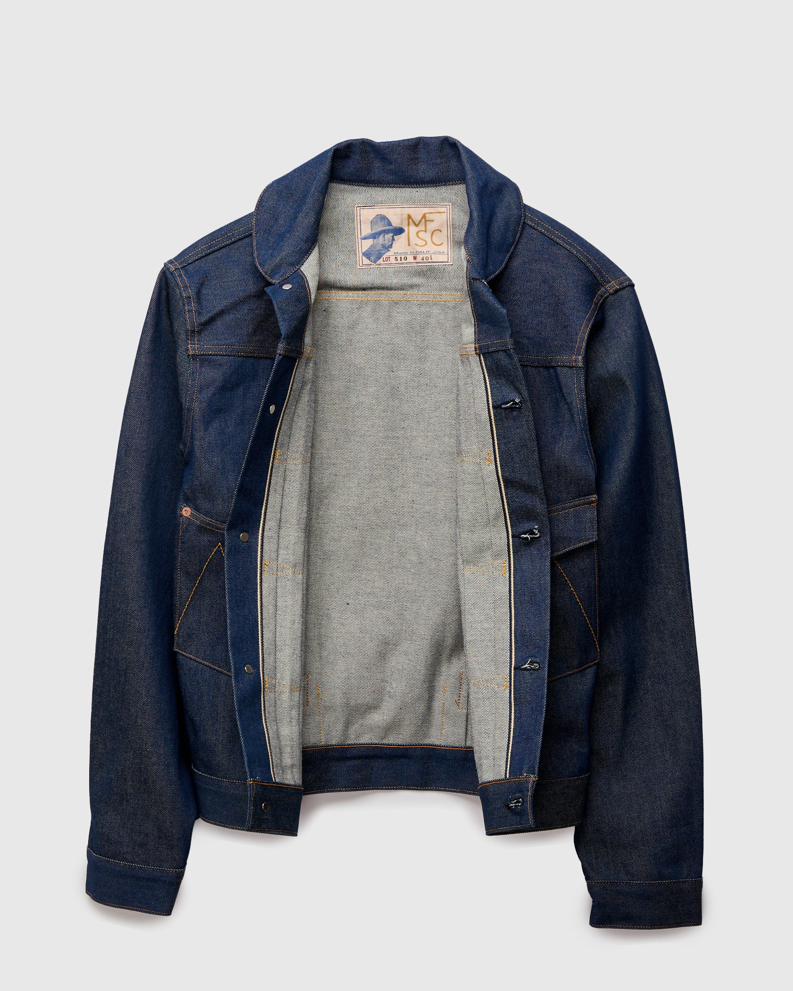 • The Ranch Blouse from Mister Freedom is the brand’s original take on classic denim jackets from the 1930s to 1950s—the Golden Age of American workwear. Drawing inspiration from “Type I” jackets, this version features period-correct bells and whistles including a buckle-back cinch, pleated front, and a cropped boxy cut. Made from New Old Stock 12.75oz Cone Mills organic selvedge denim, the fabric features a vibrant indigo hue reminiscent of vintage loomstate 501s. Woven in the USA and finished with a white/indigo selvedge ID, this denim is designed to develop a subtle fade and eye-catching patina with wear. Finished with Mister Freedom’s signature arrowhead dart stitching, original slanted chest pockets, and NOS denim facing for a standout blend of authenticity and character.