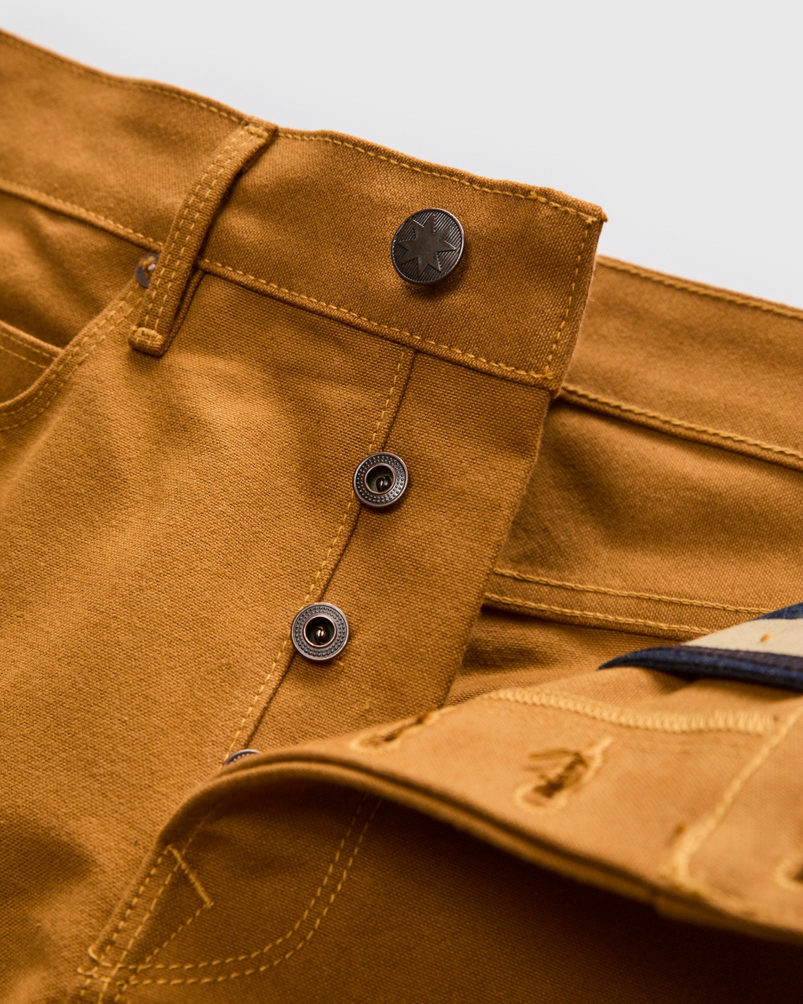 • Freenote’s 15oz Camel selvedge is a heavyweight canvas pant cut in a classic five-pocket silhouette. Woven in Japan using a durable, high-tension weave and finished with a brushed surface treatment, the fabric offers a dense, substantial weight with a soft, velour-like touch. The pants are finished with signature Freenote detailing, including custom hardware and components made in the USA.