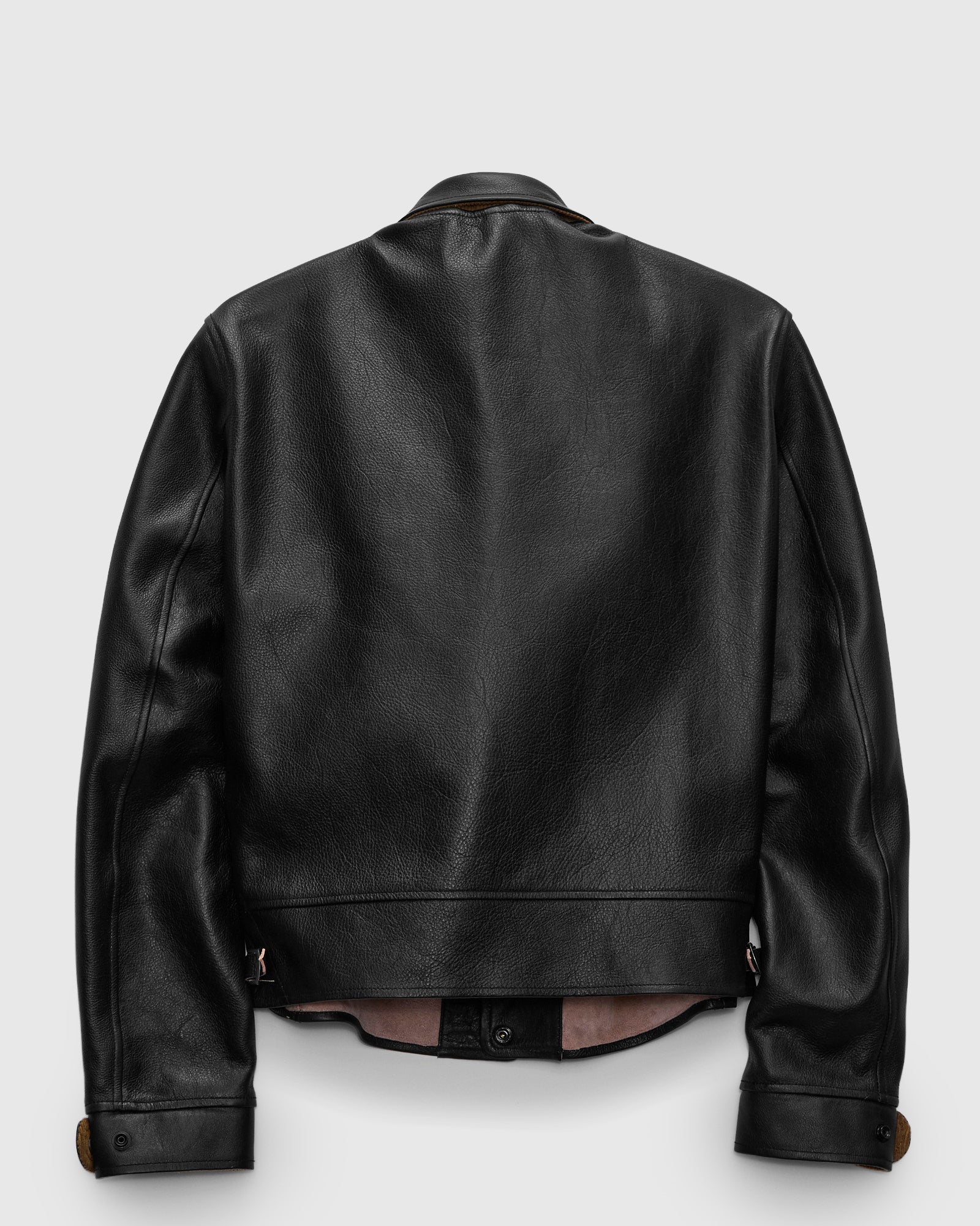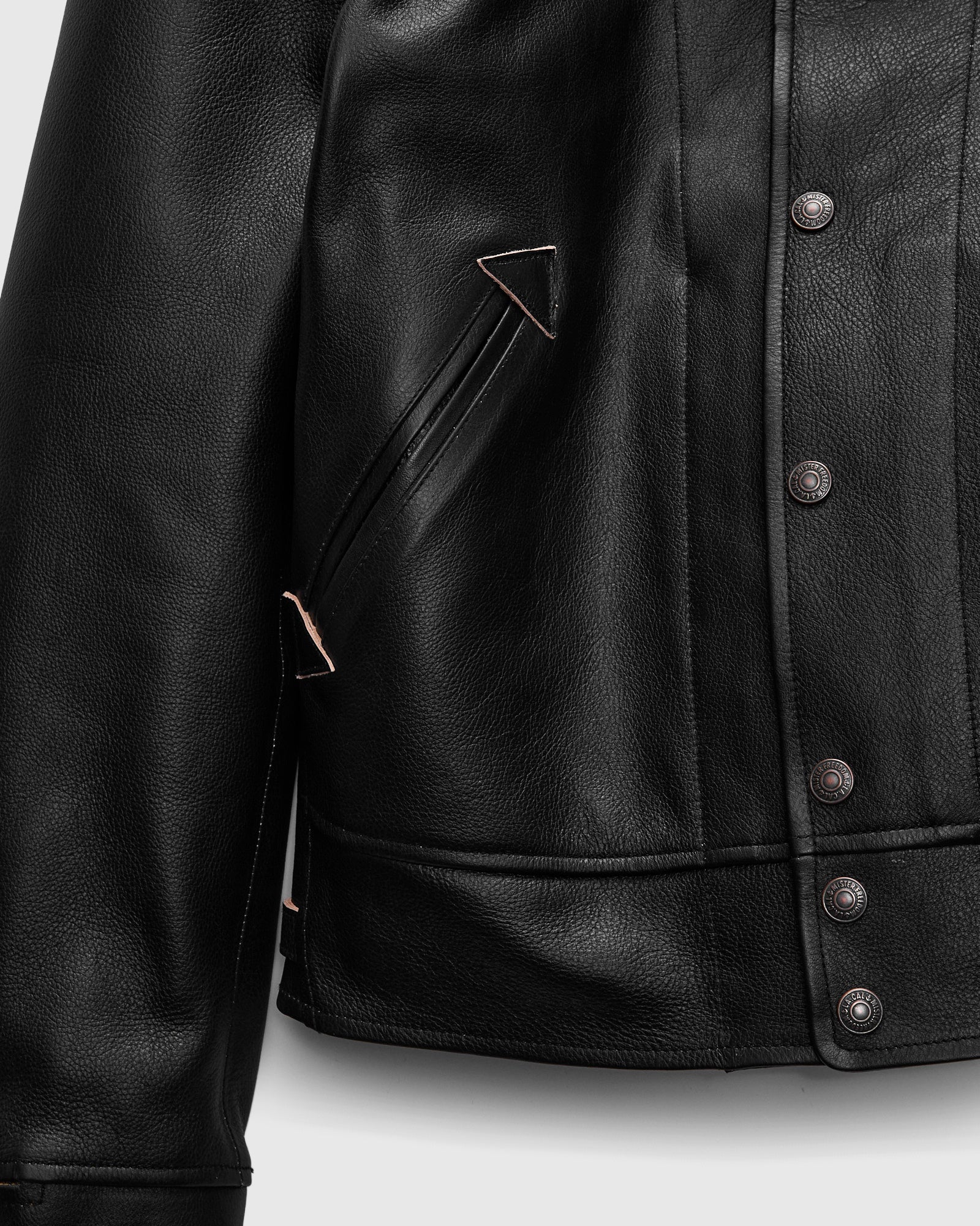 • The Campus Stud Jacket is an original Mister Freedom pattern inspired by 1930s sportswear “Cossack” style jackets. Mister Freedom's teacore leather is vegetable-tanned and finished with a black topcoat that will fade over time, revealing the natural "tea" colored core and developing a vintage patina with wear. The jacket is fully unlined and features a shawl collar, underarm venting eyelets, and Mister Freedom “Stud” brass snaps.